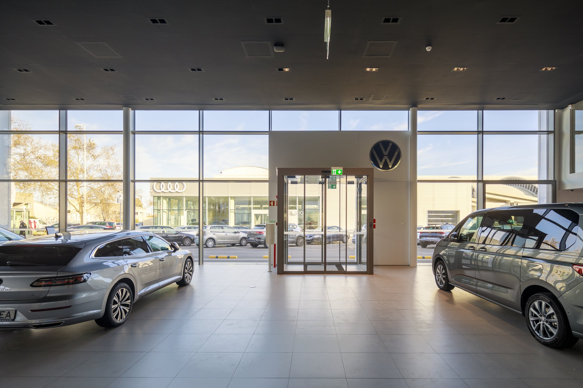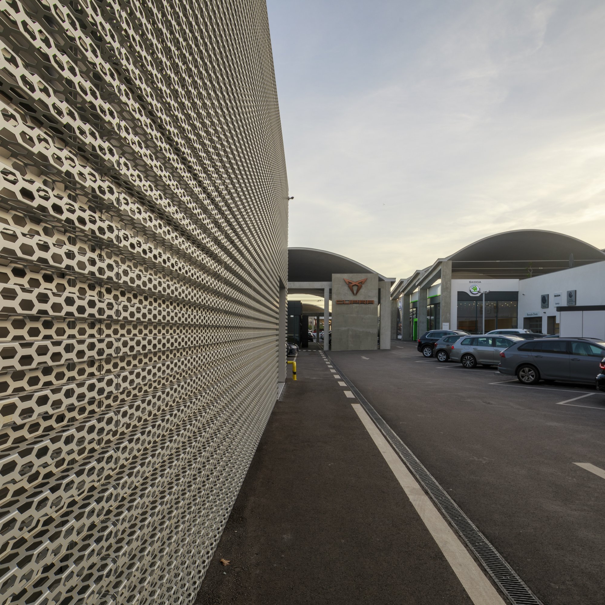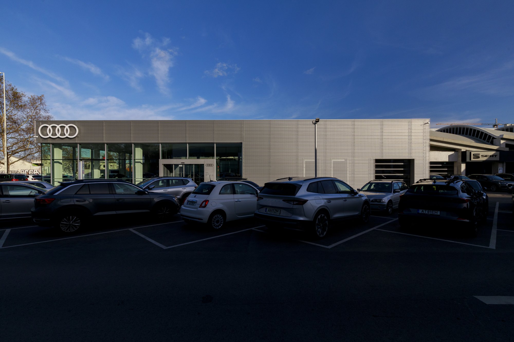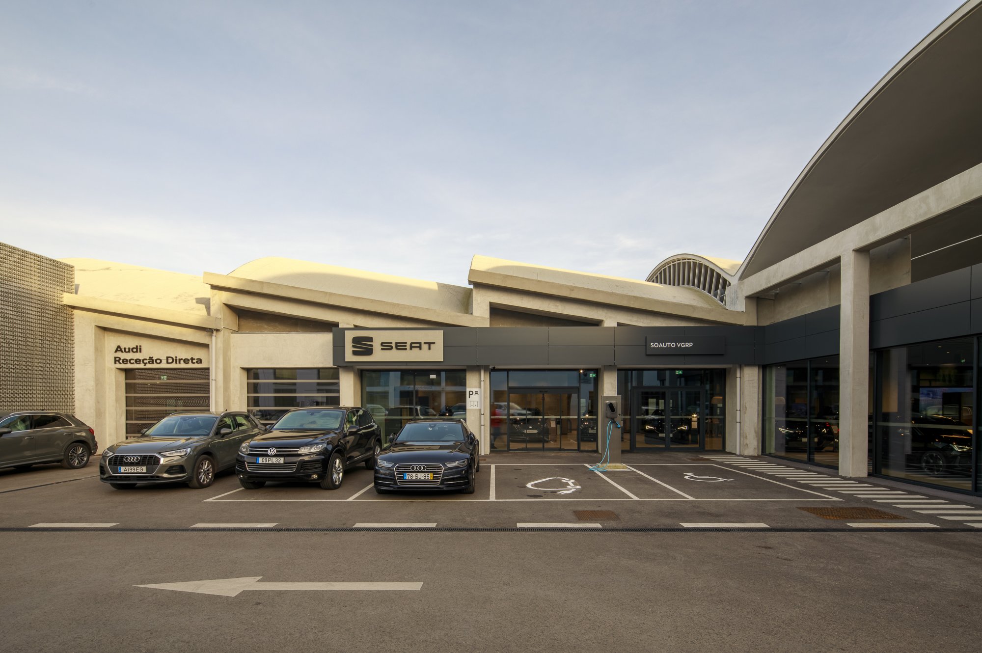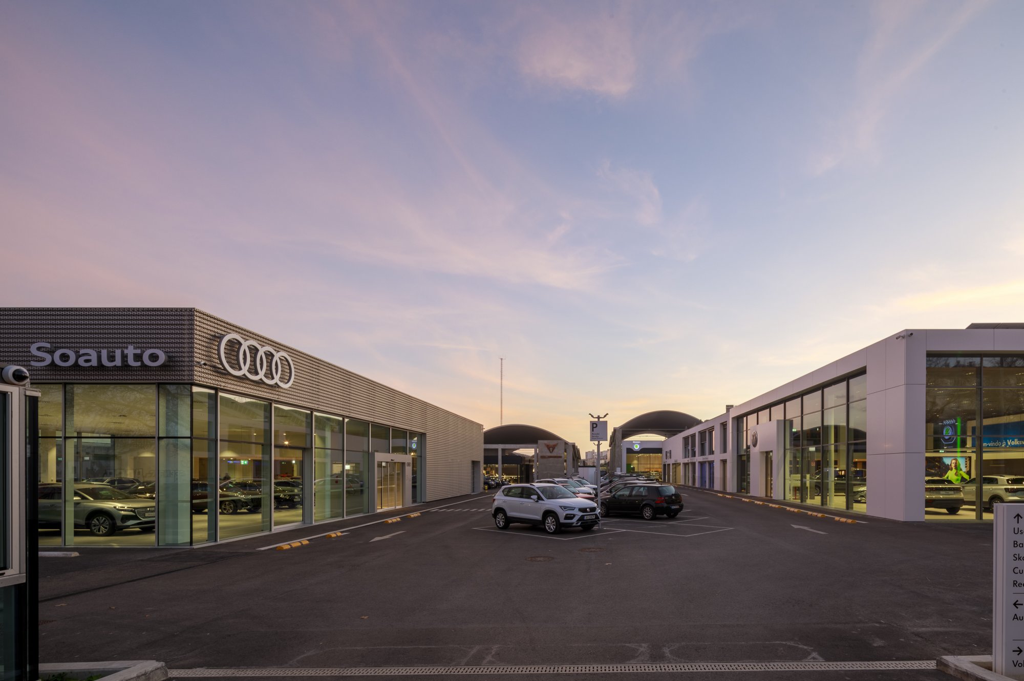 Our main focus was to rehabilitate the old facilities by integrating three types of new facilities underneath - workshops, warehouses and stands - from different car brands just as Volkswagen, Audi, Cupra and Skoda. For this purpose, the plan was to adapt the existing pavilions through the demolition of specific sectors and build new parts on the street front and rear areas of the land, perfectly integrating the new with the renewed builings. In order to emphasize the location of the Lighthouse installation and establish visual contact with costumers, not only the vehiles on display but also the reception area, were thought and projected to stay in the front façade framed by huge glazed glass planes.
