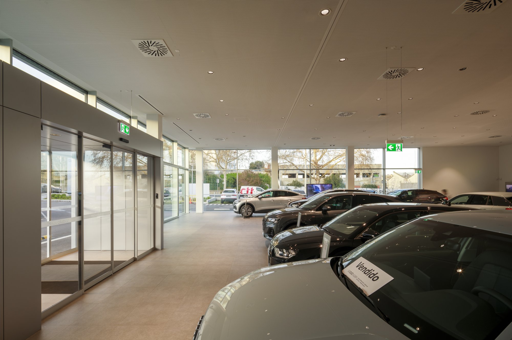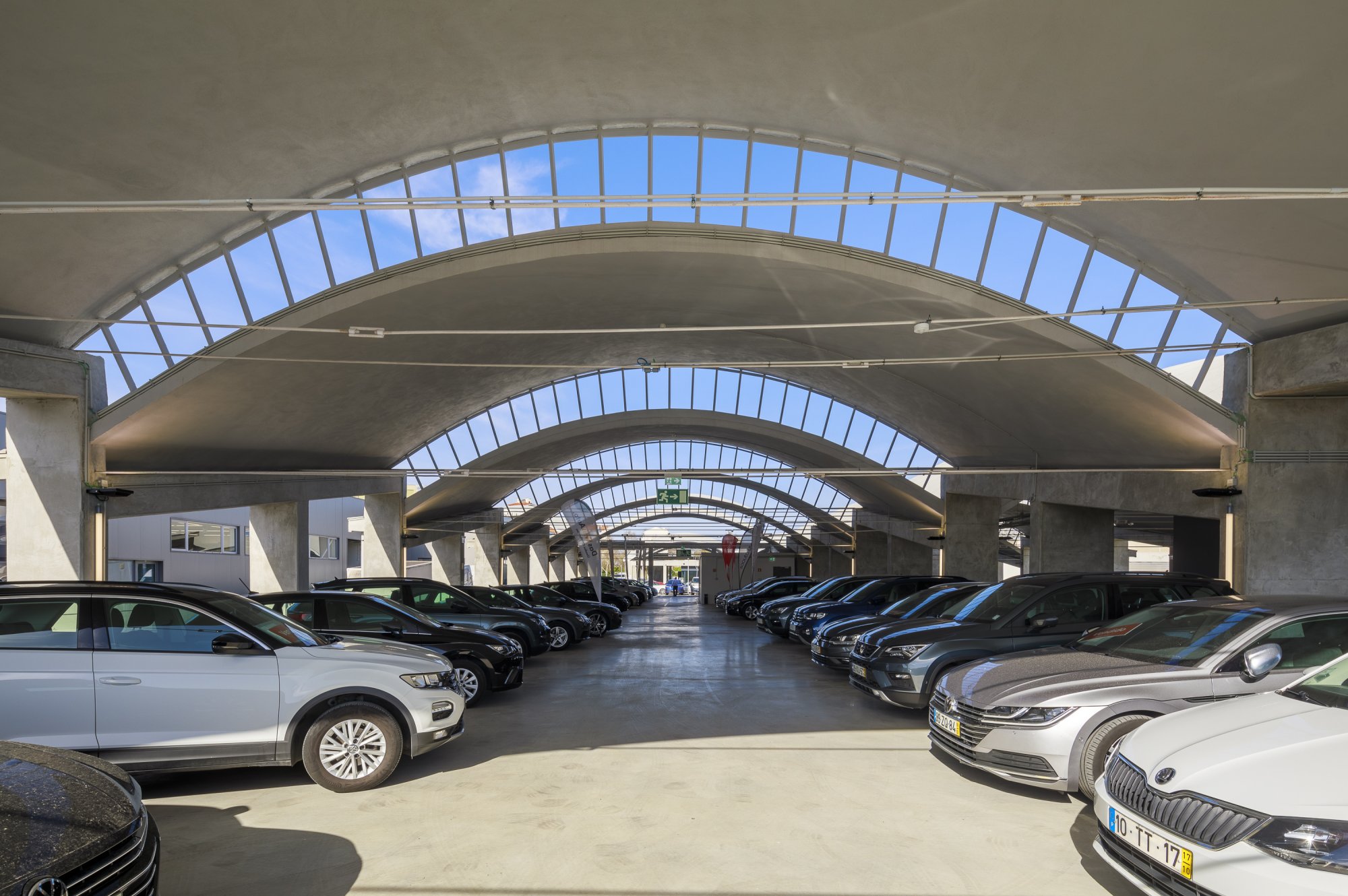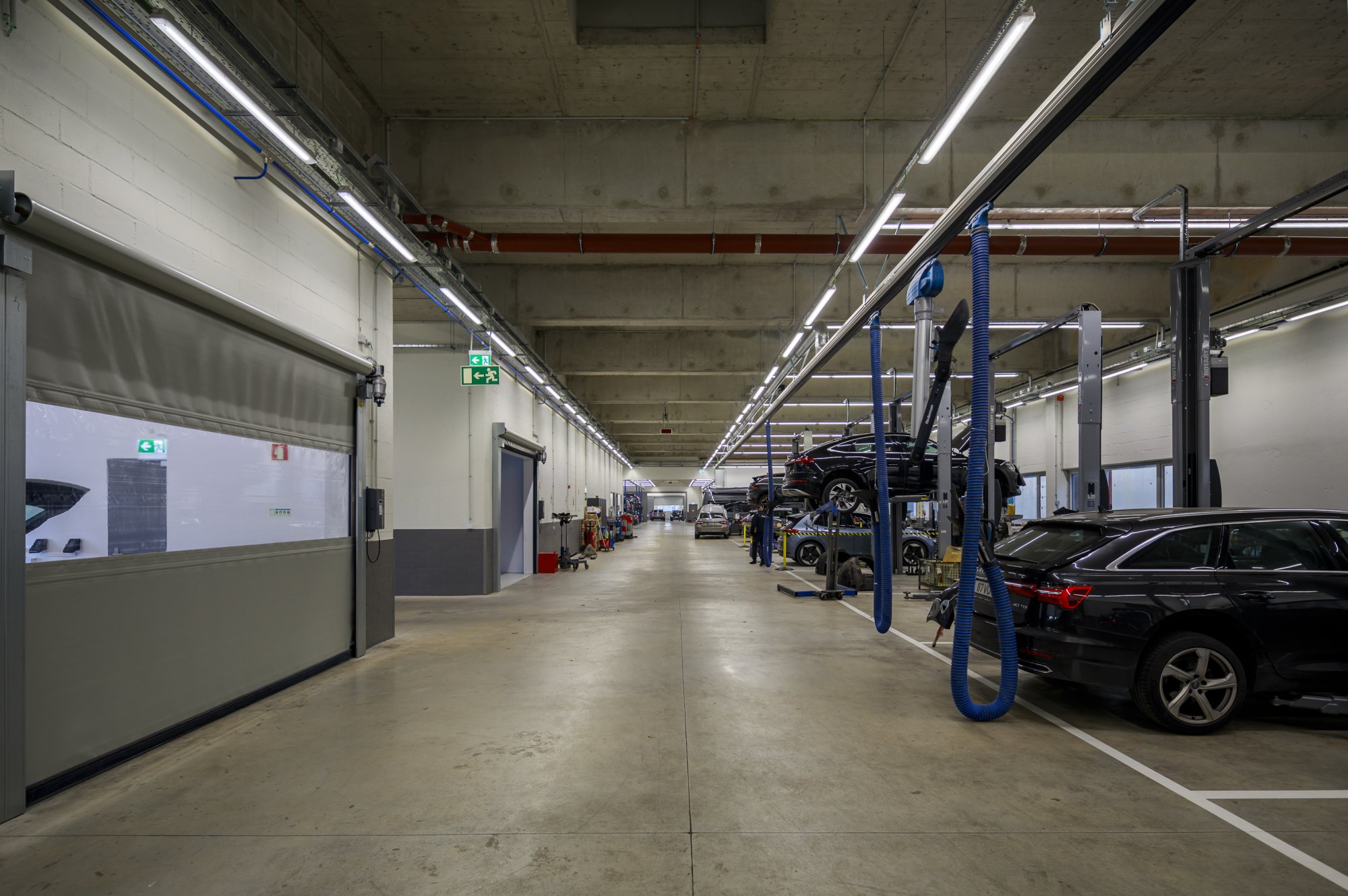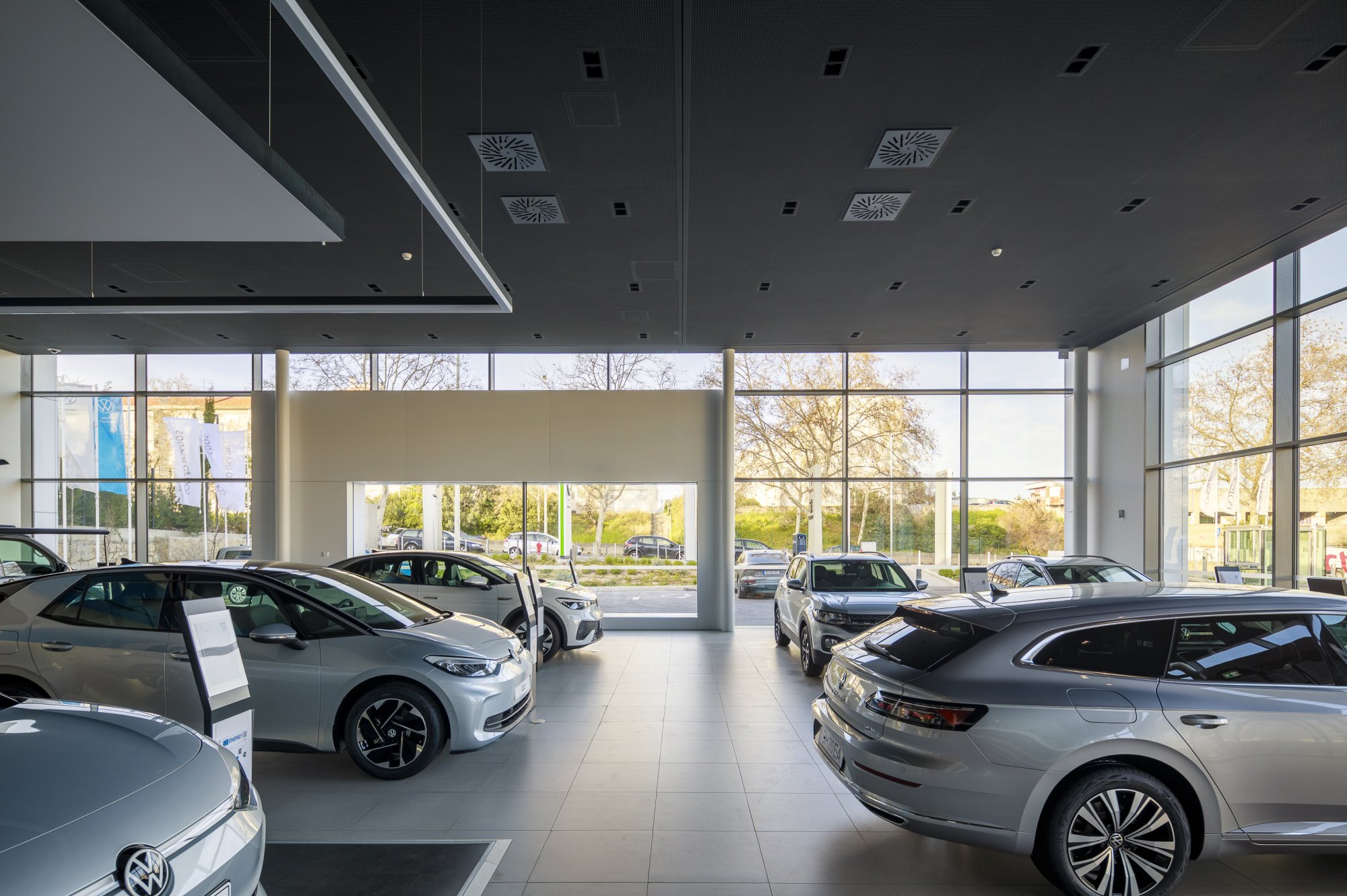 Our main focus was to rehabilitate the old facilities by integrating three types of new facilities underneath - workshops, warehouses and stands - from different car brands just as Volkswagen, Audi, Cupra and Skoda. For this purpose, the plan was to adapt the existing pavilions through the demolition of specific sectors and build new parts on the street front and rear areas of the land, perfectly integrating the new with the renewed builings. In order to emphasize the location of the Lighthouse installation and establish visual contact with costumers, not only the vehiles on display but also the reception area, were thought and projected to stay in the front façade framed by huge glazed glass planes.