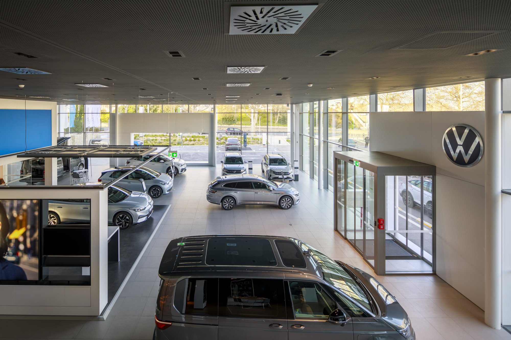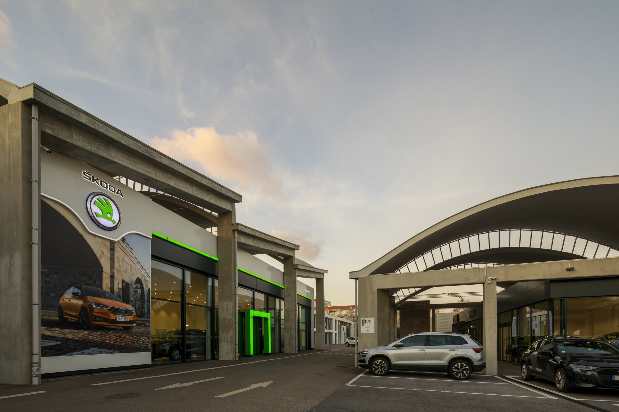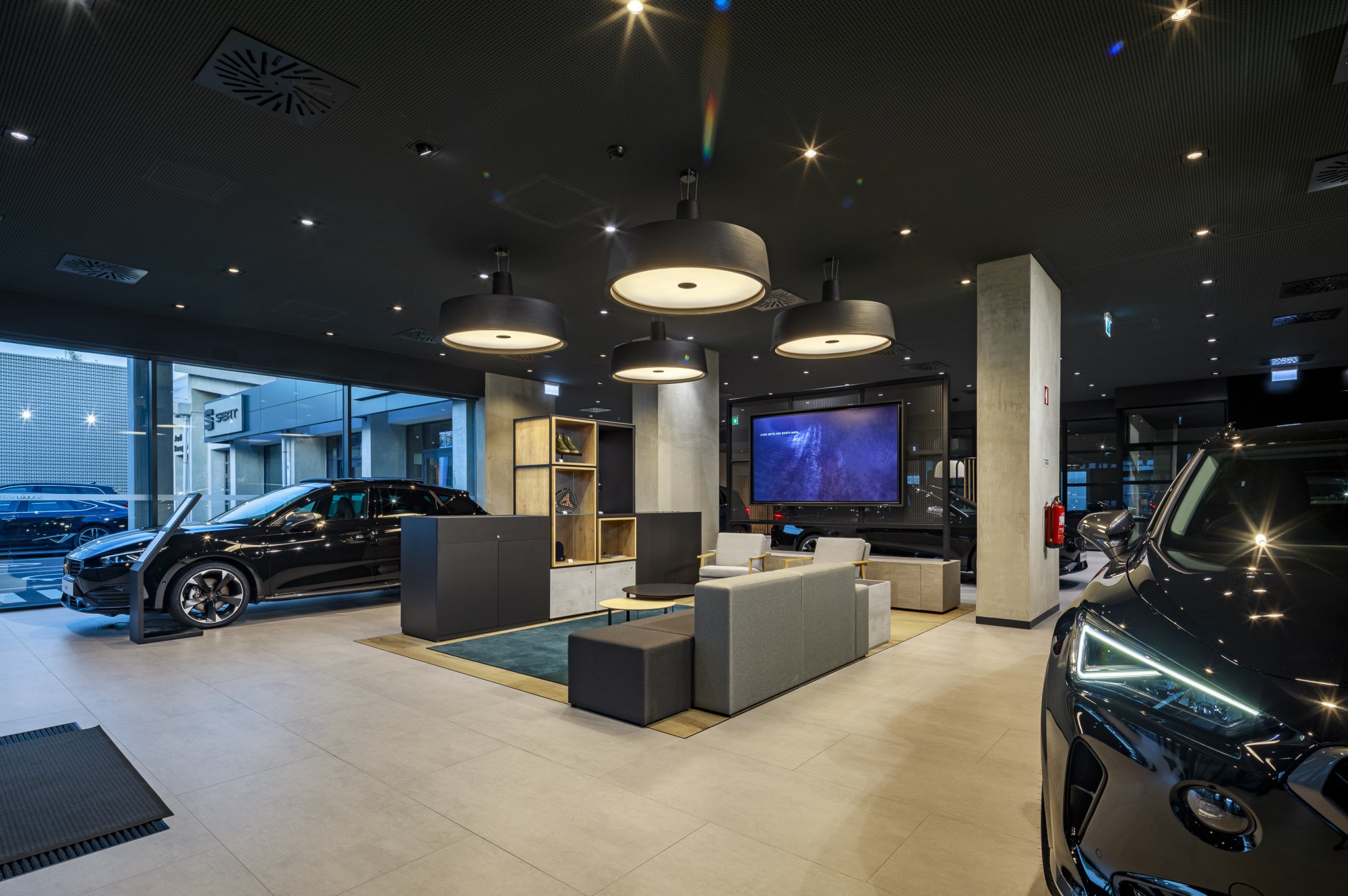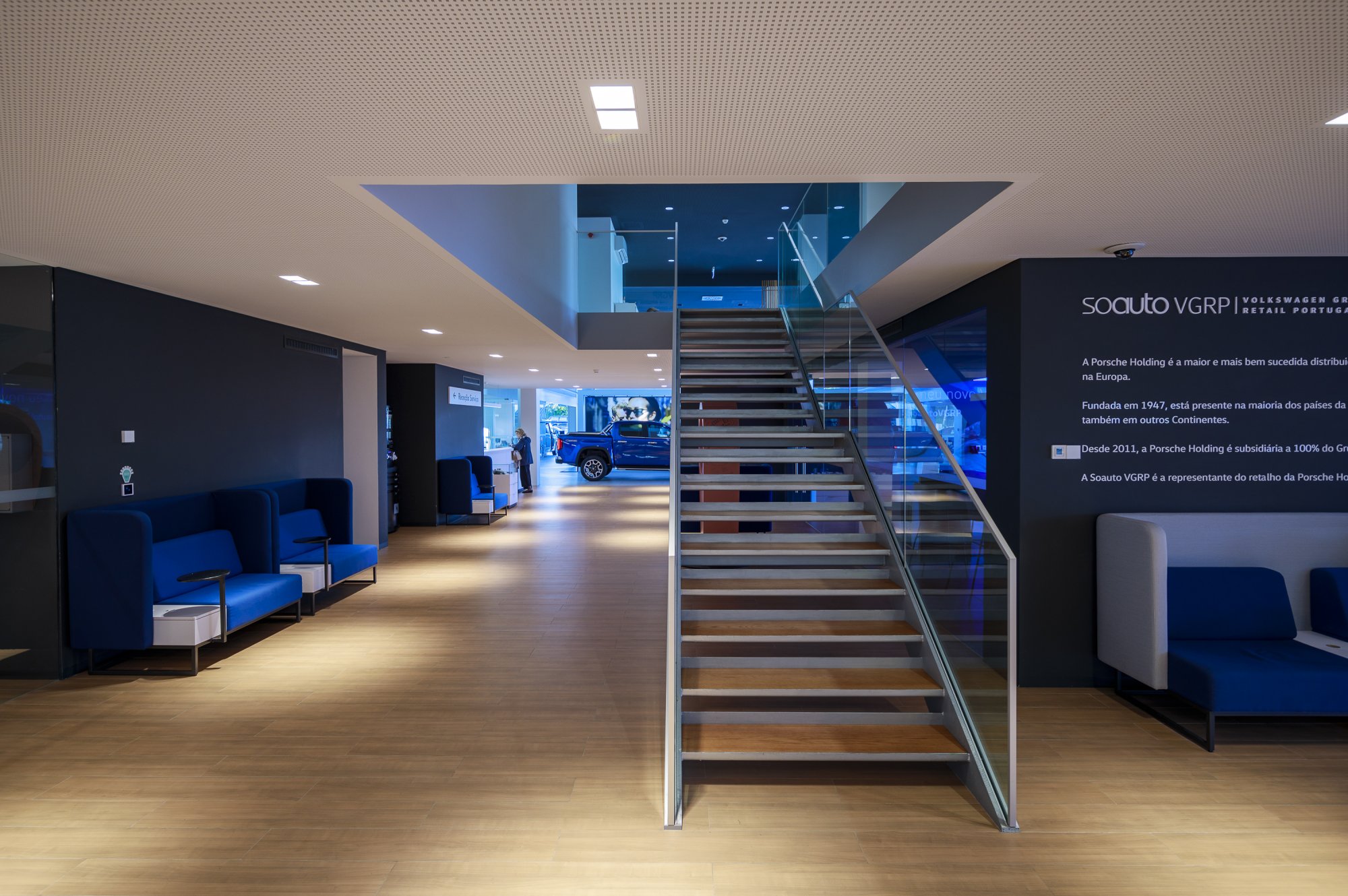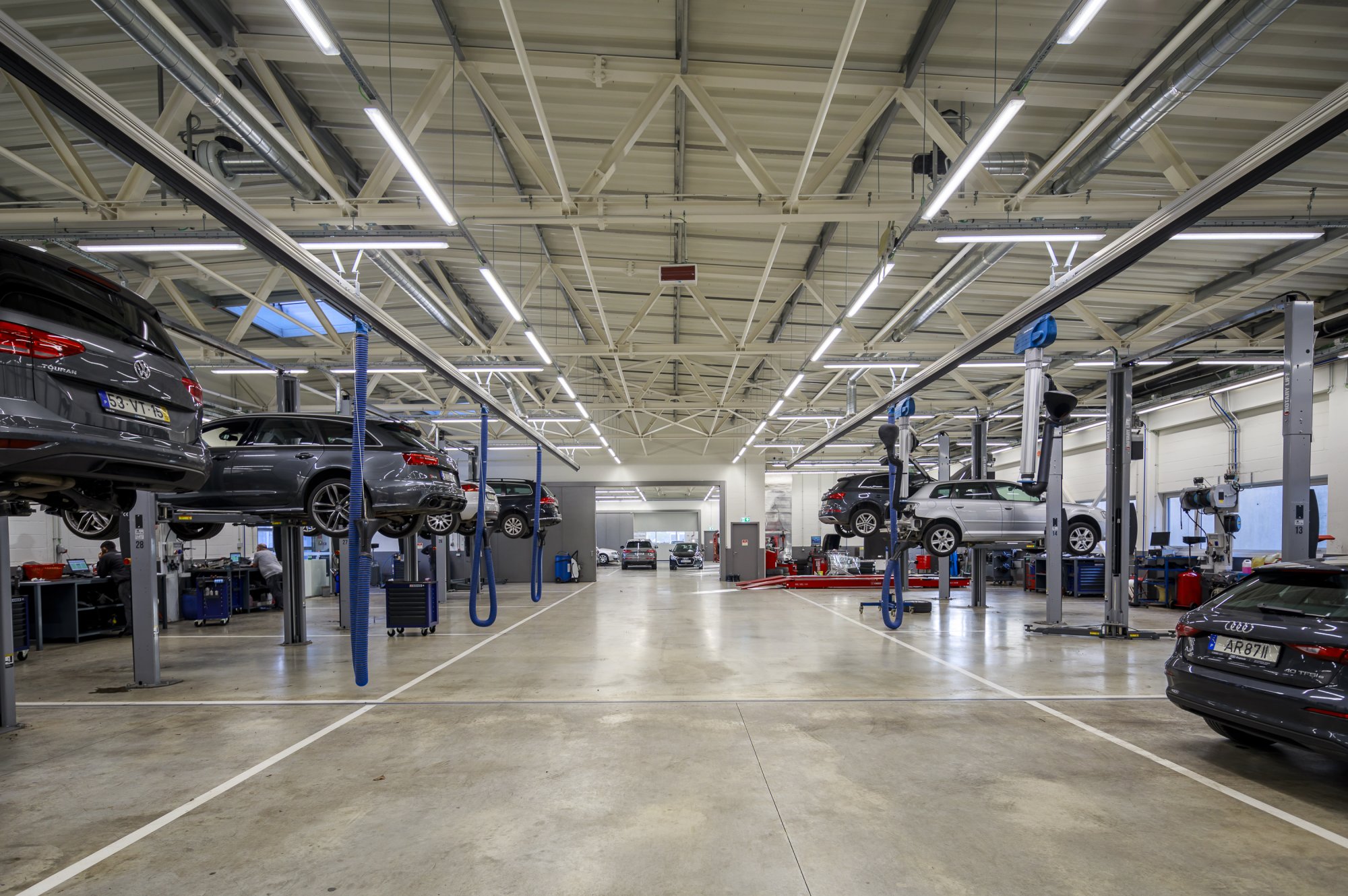 Our main focus was to rehabilitate the old facilities by integrating three types of new facilities underneath - workshops, warehouses and stands - from different car brands just as Volkswagen, Audi, Cupra and Skoda. For this purpose, the plan was to adapt the existing pavilions through the demolition of specific sectors and build new parts on the street front and rear areas of the land, perfectly integrating the new with the renewed builings. In order to emphasize the location of the Lighthouse installation and establish visual contact with costumers, not only the vehiles on display but also the reception area, were thought and projected to stay in the front façade framed by huge glazed glass planes.