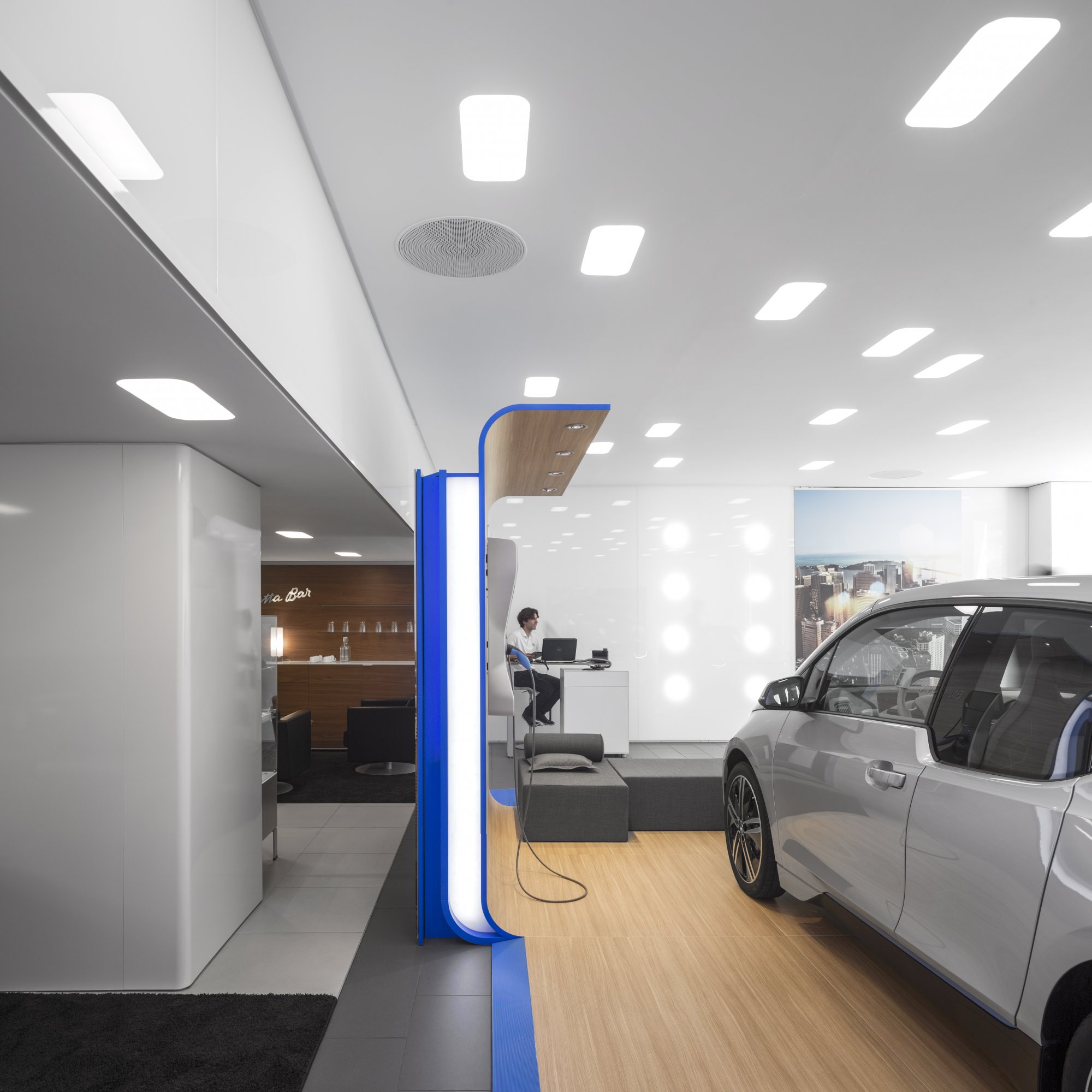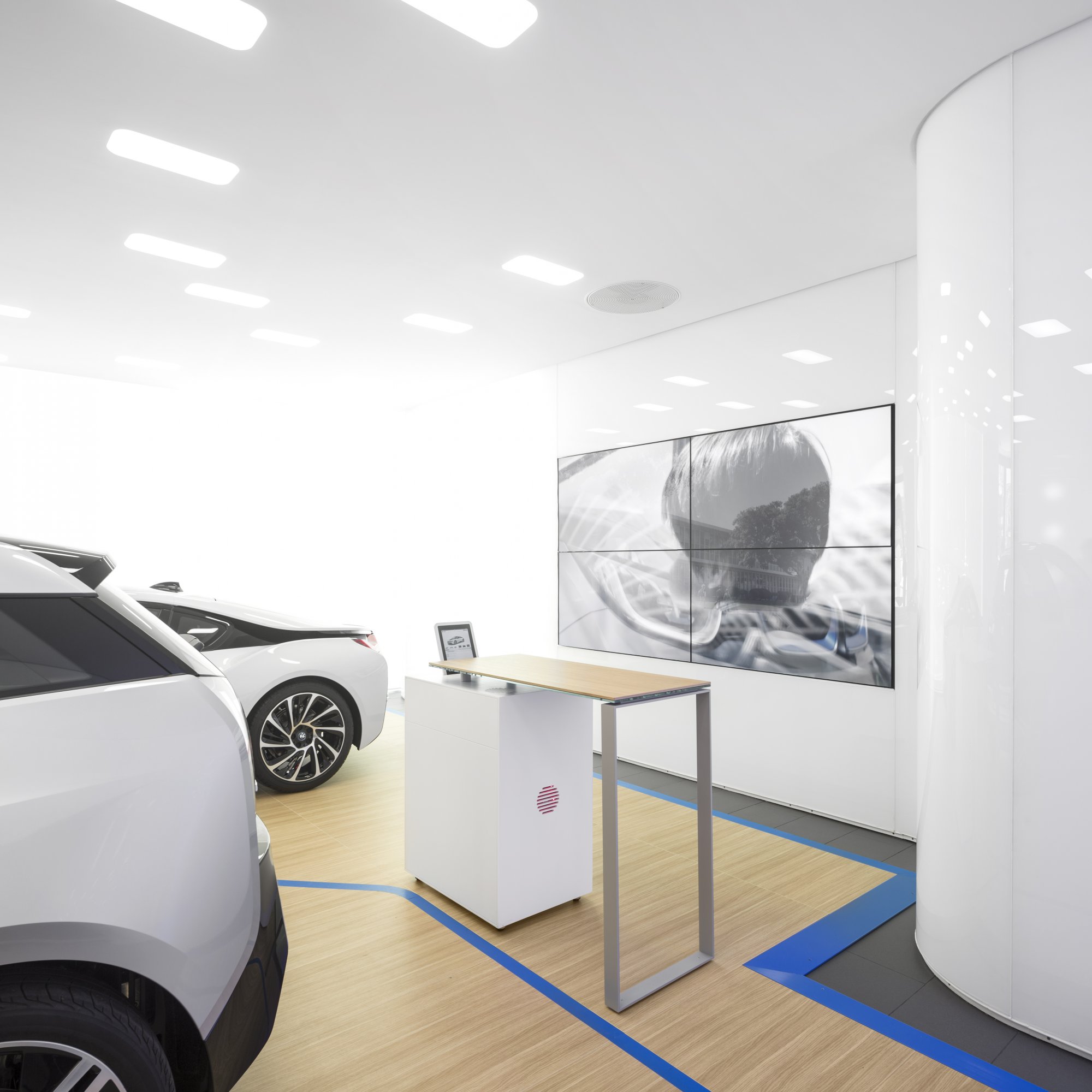 The unending movement of the spontaneous line surrounds the available space, hiding corners and eliminating boudaries. On one side, a wall of uniform light ending with a vertical blue LED light that refers to BMWi. On the other side, round car headlights that swich to become visible, and then switch off, and disappear.