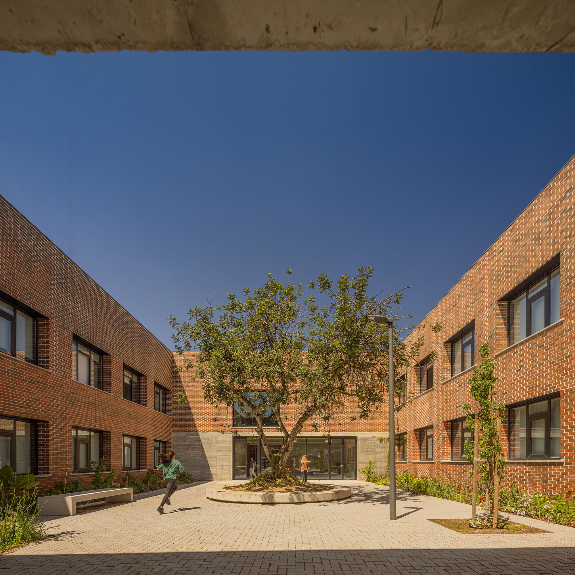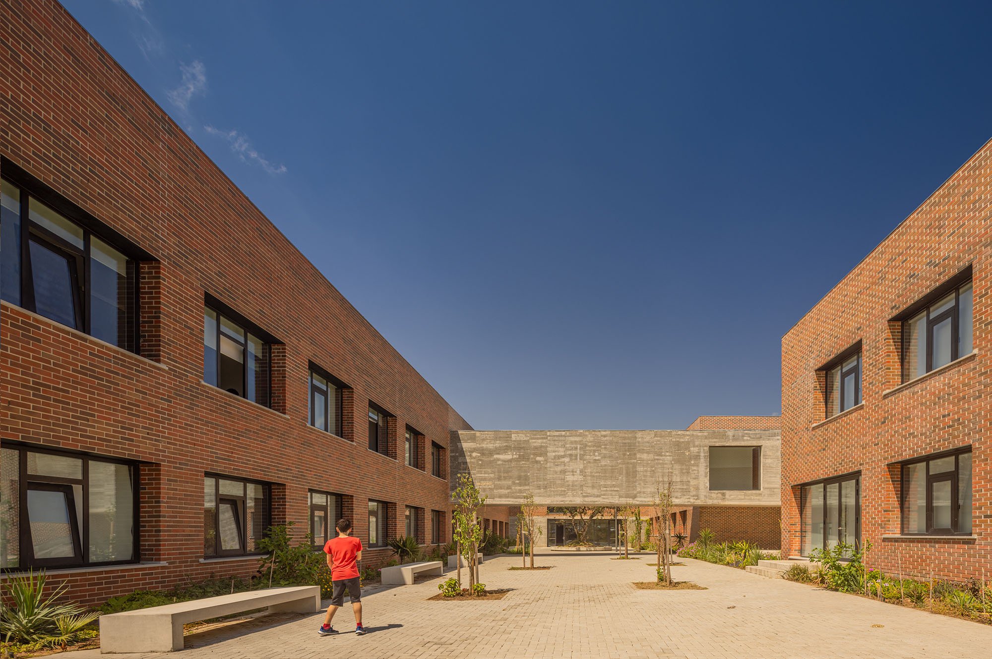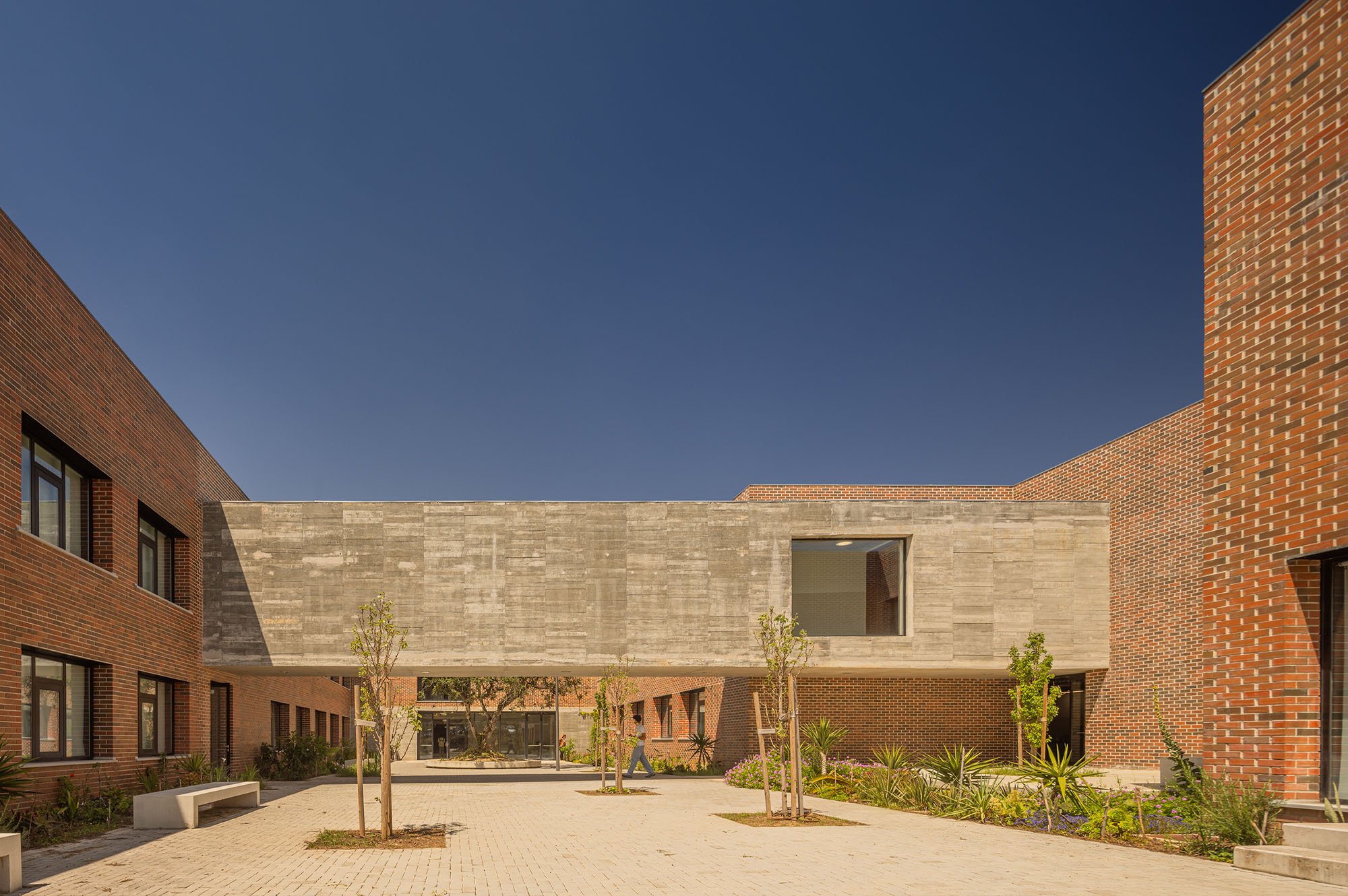 An immense, solid, brick-colored building, contrasting with the surrounding green areas, designed in a apparently natural way and distributed throughout the semi-enclosed courtyards that carve out the volume, characterized by distint purposes according to the spaces that surround them.
