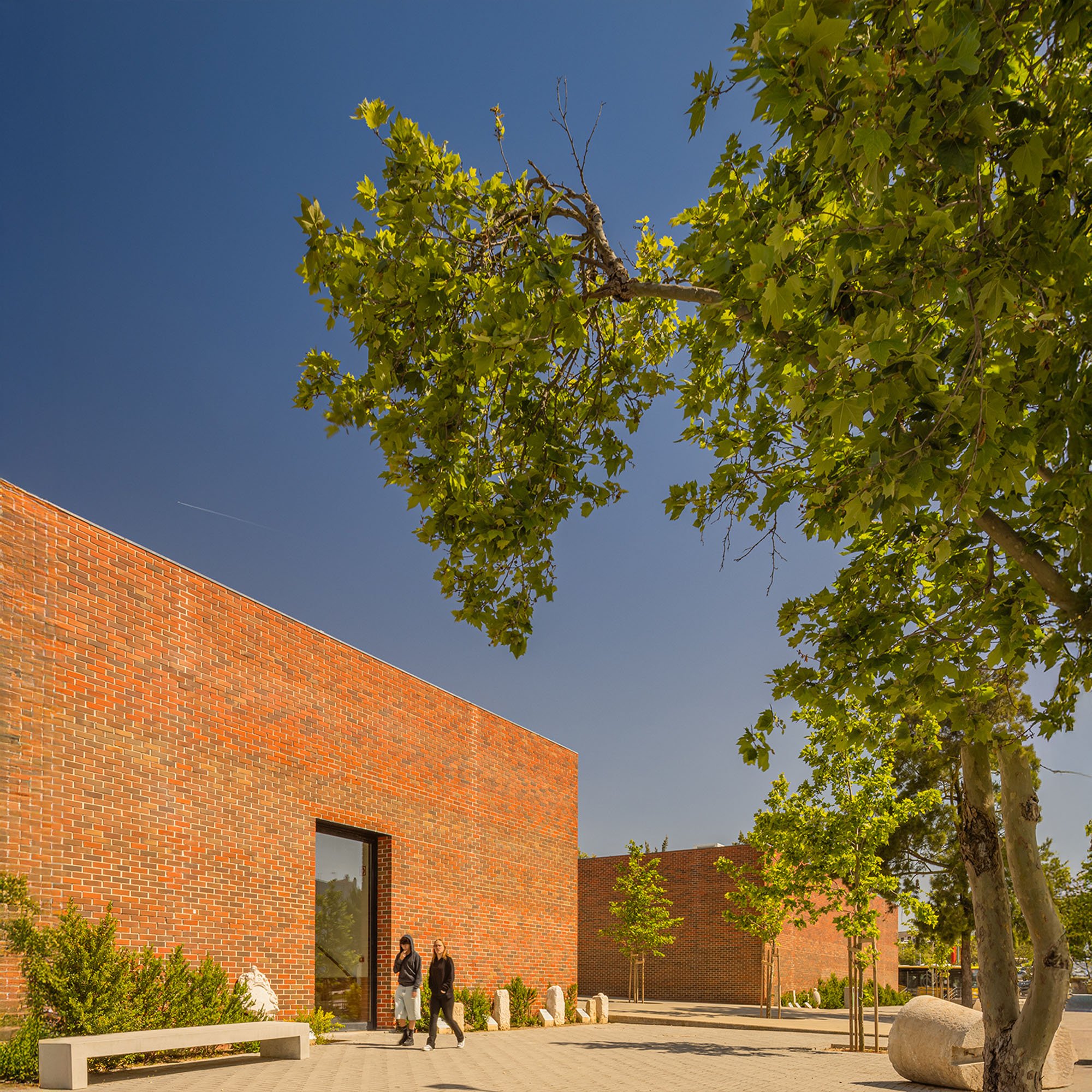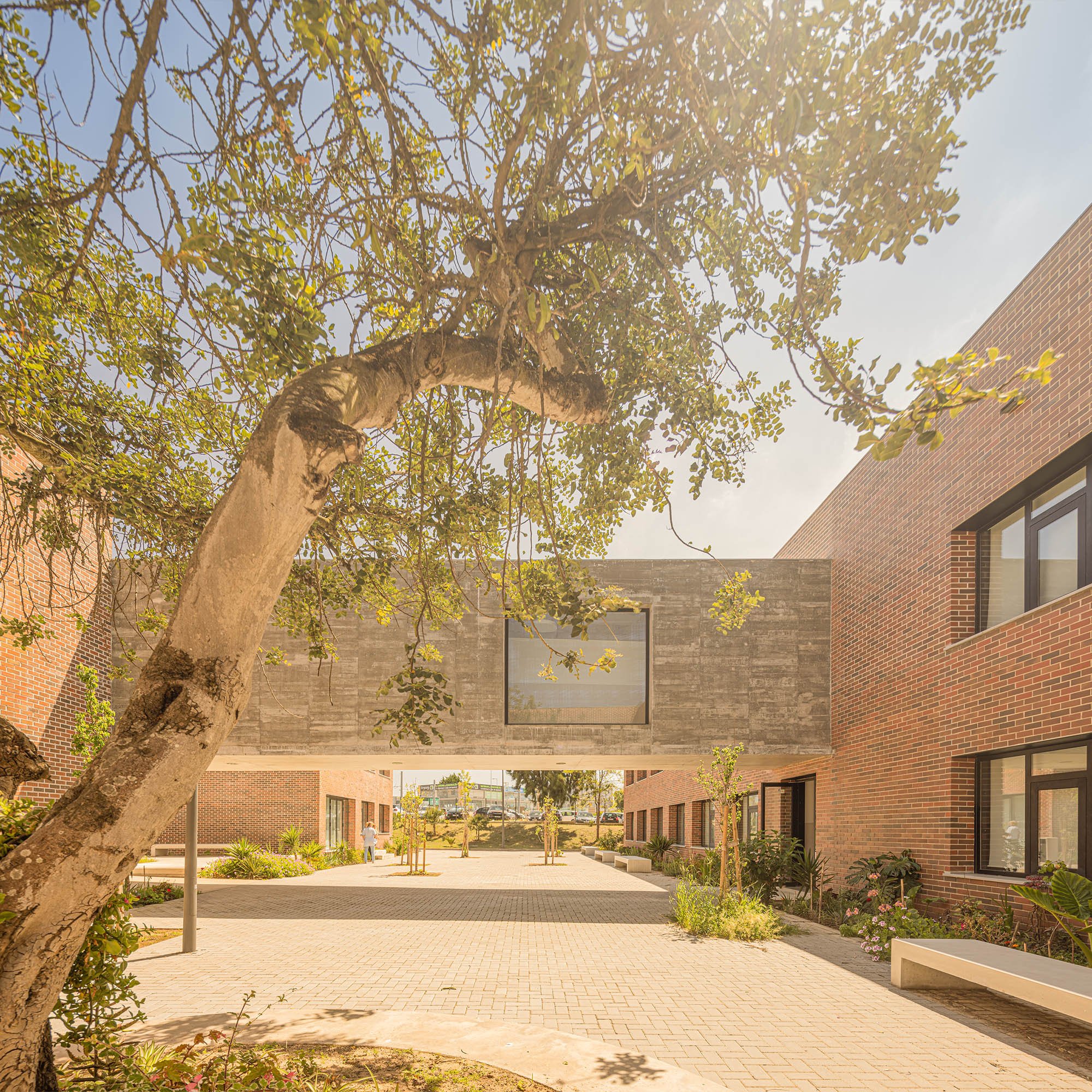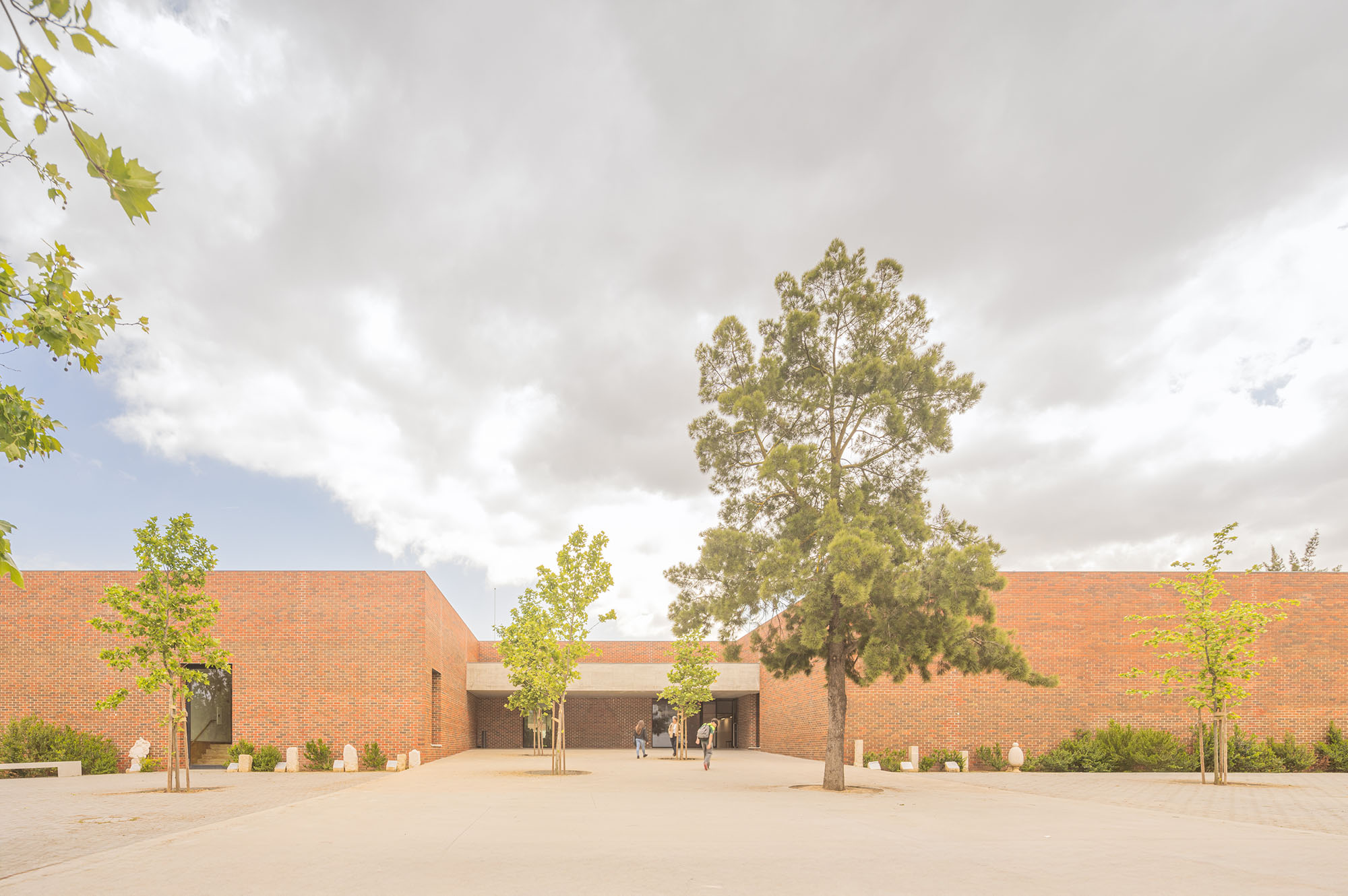 An immense, solid, brick-colored building, contrasting with the surrounding green areas, designed in a apparently natural way and distributed throughout the semi-enclosed courtyards that carve out the volume, characterized by distint purposes according to the spaces that surround them.