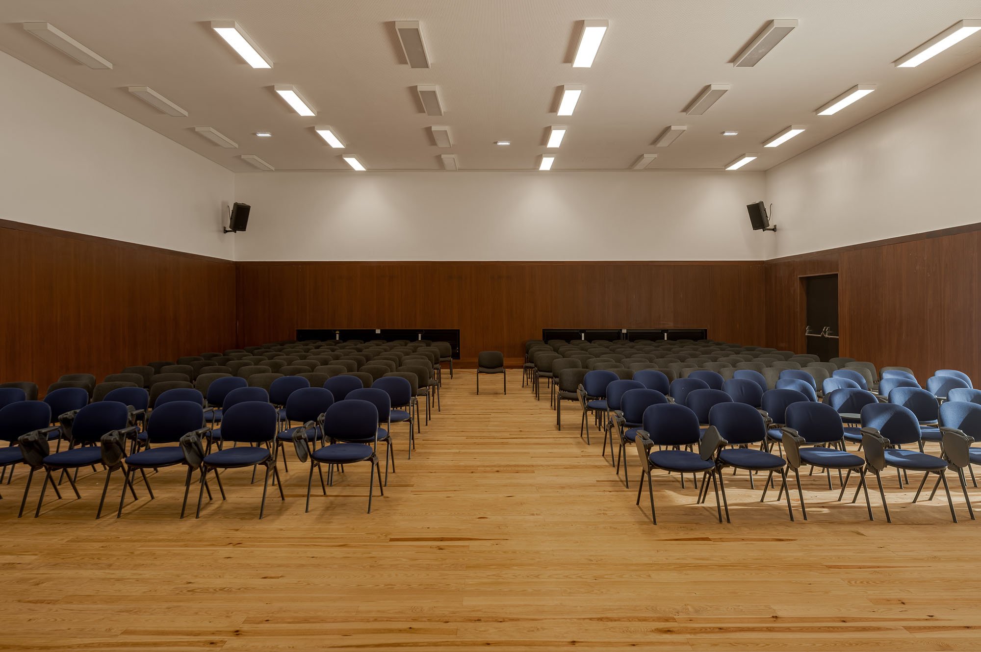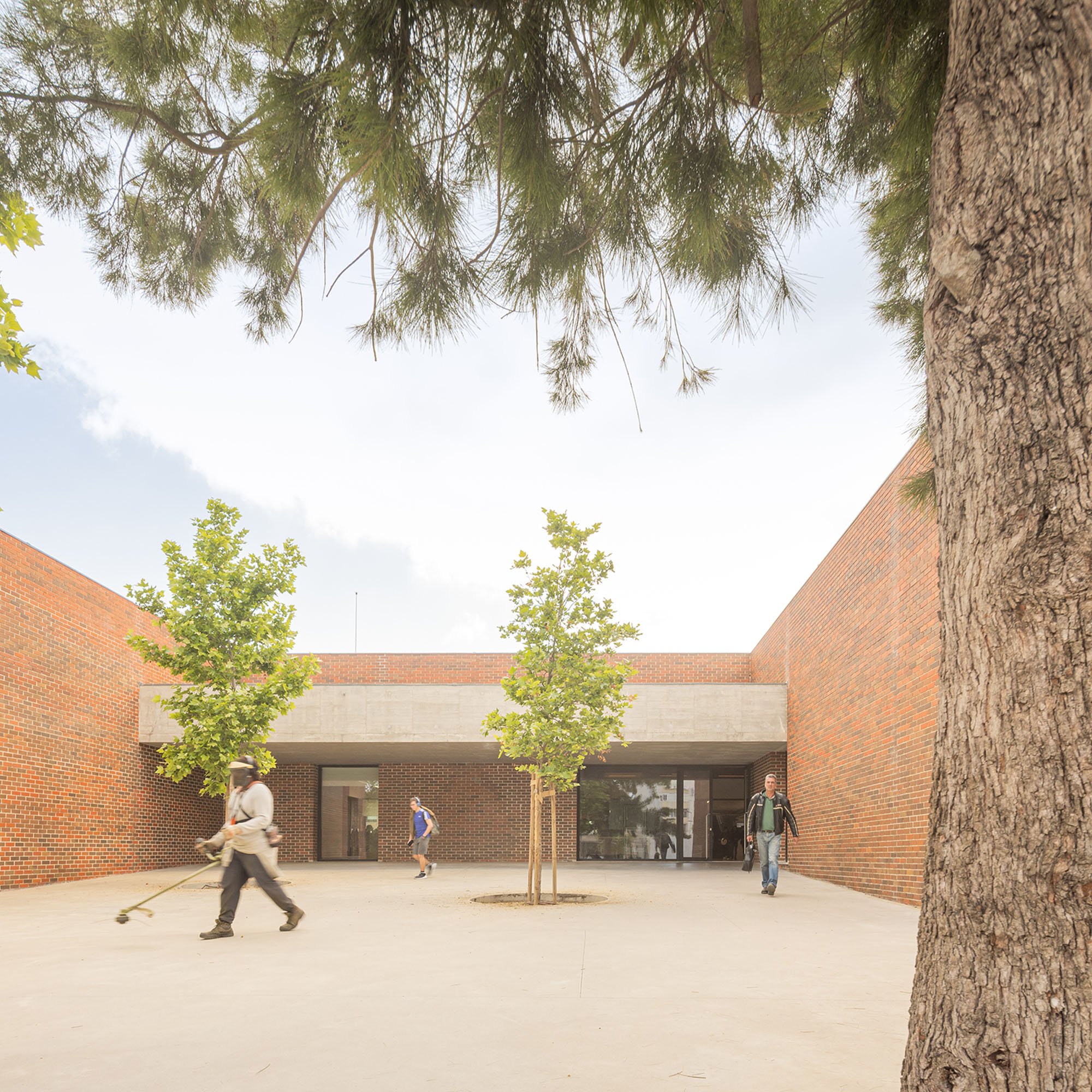 An immense, solid, brick-colored building, contrasting with the surrounding green areas, designed in a apparently natural way and distributed throughout the semi-enclosed courtyards that carve out the volume, characterized by distint purposes according to the spaces that surround them.