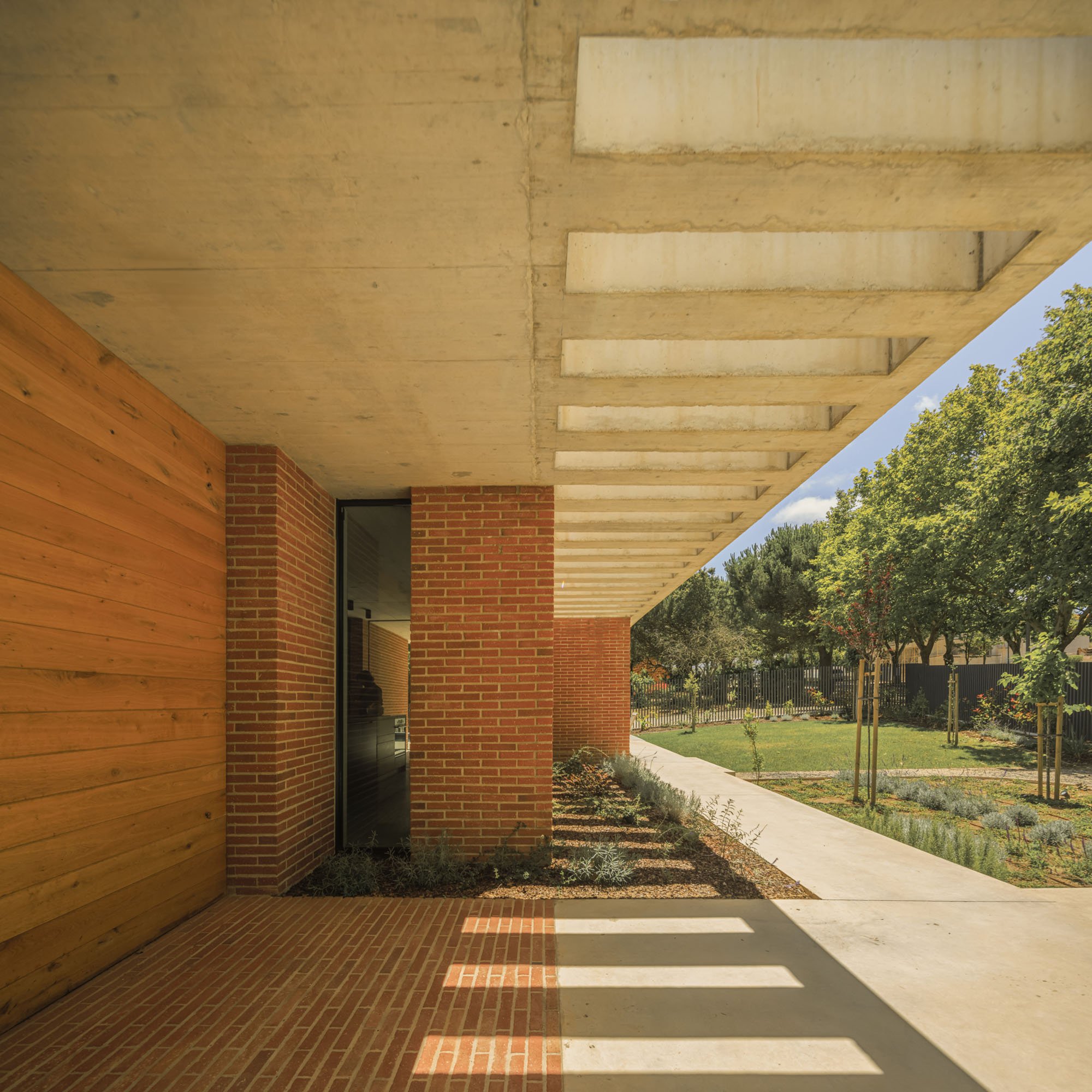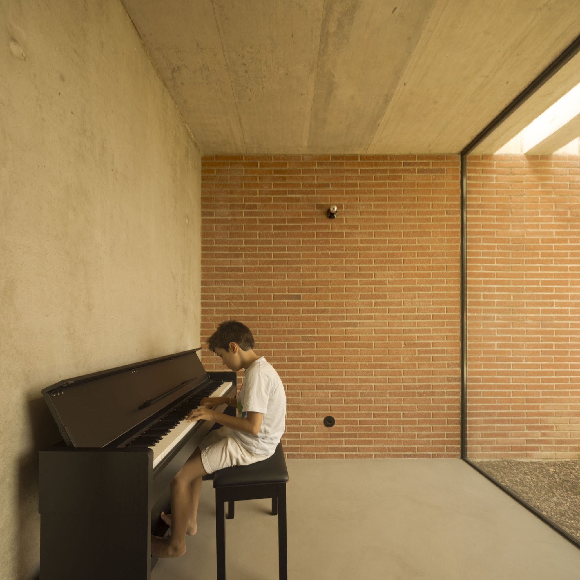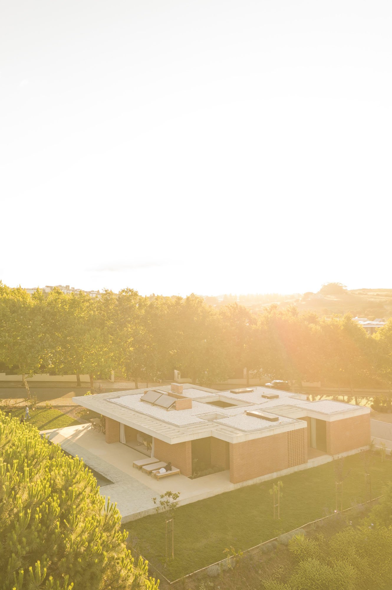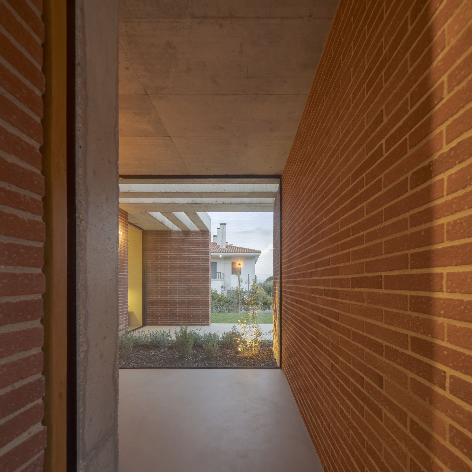 Inside, there is what we can cal "harmony" betwee the white vertical planes and the solid red brick planes. Spaces are hierarchically distributed, and the courtyards and voids highlight the evident landscaping work.