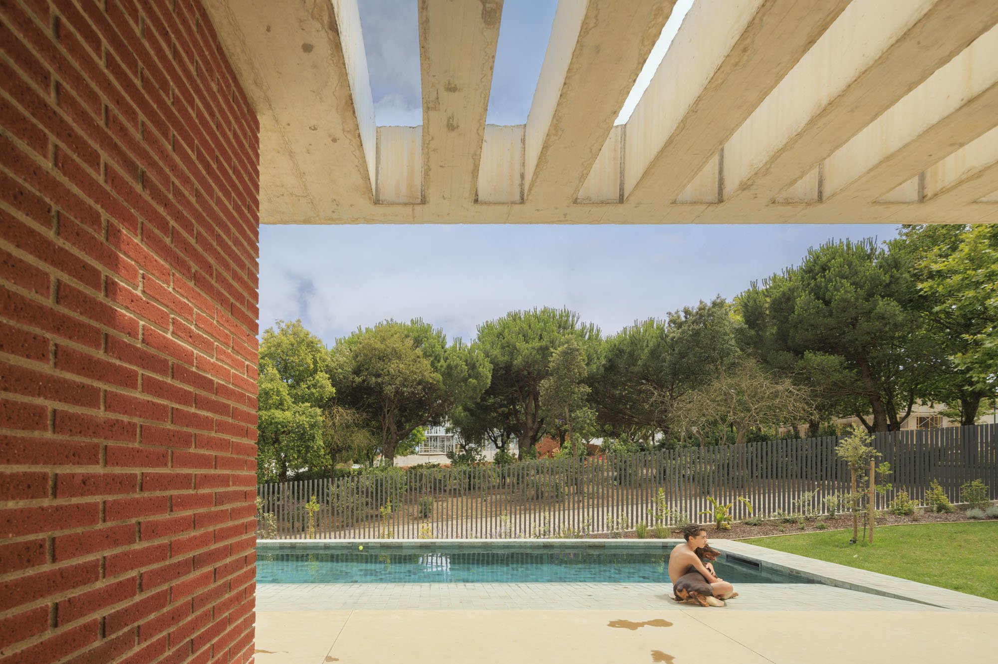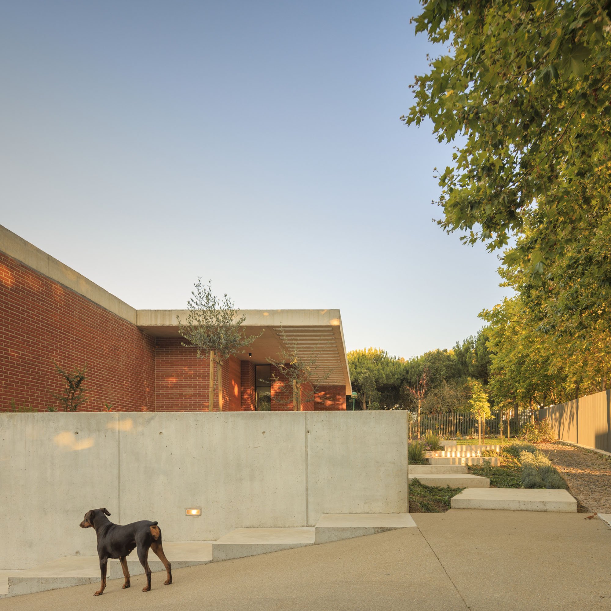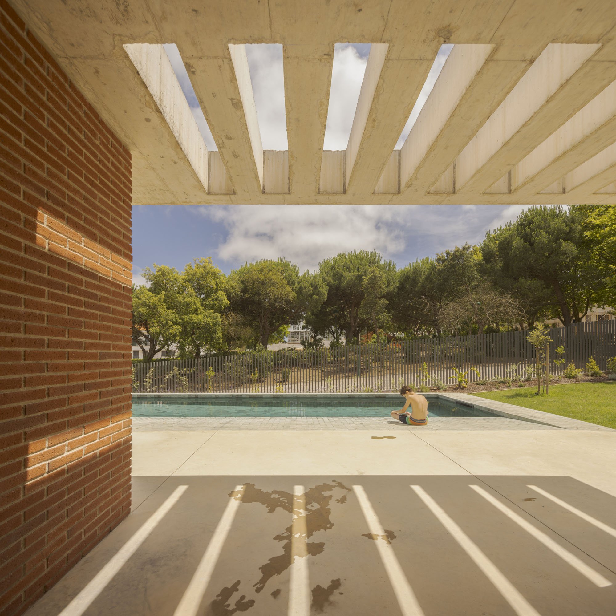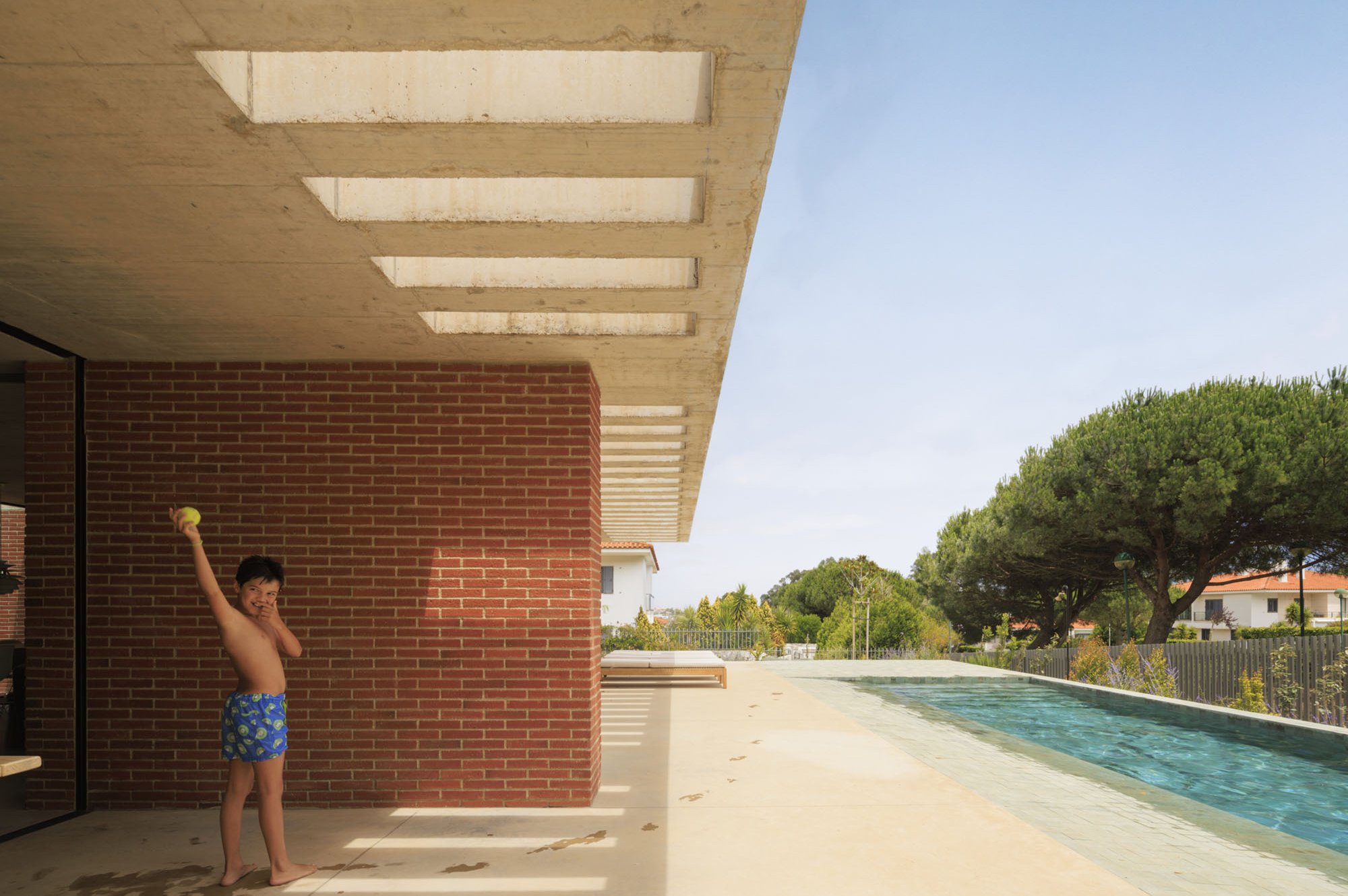 Inside, there is what we can cal "harmony" betwee the white vertical planes and the solid red brick planes. Spaces are hierarchically distributed, and the courtyards and voids highlight the evident landscaping work.