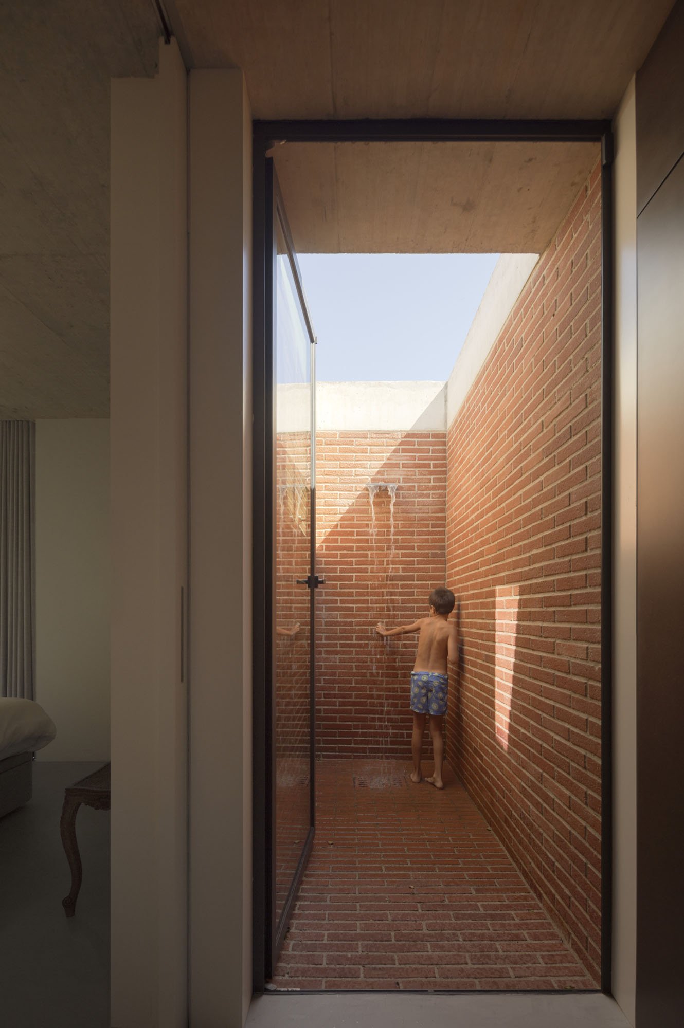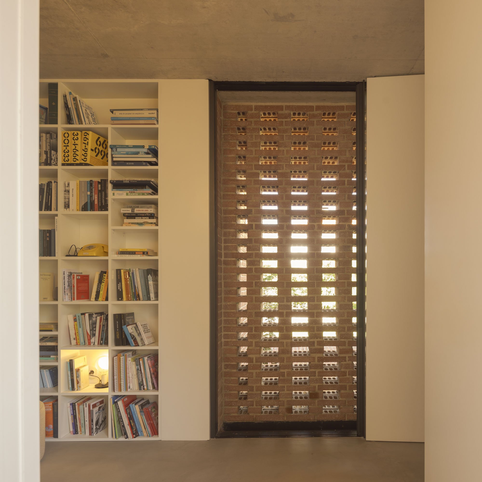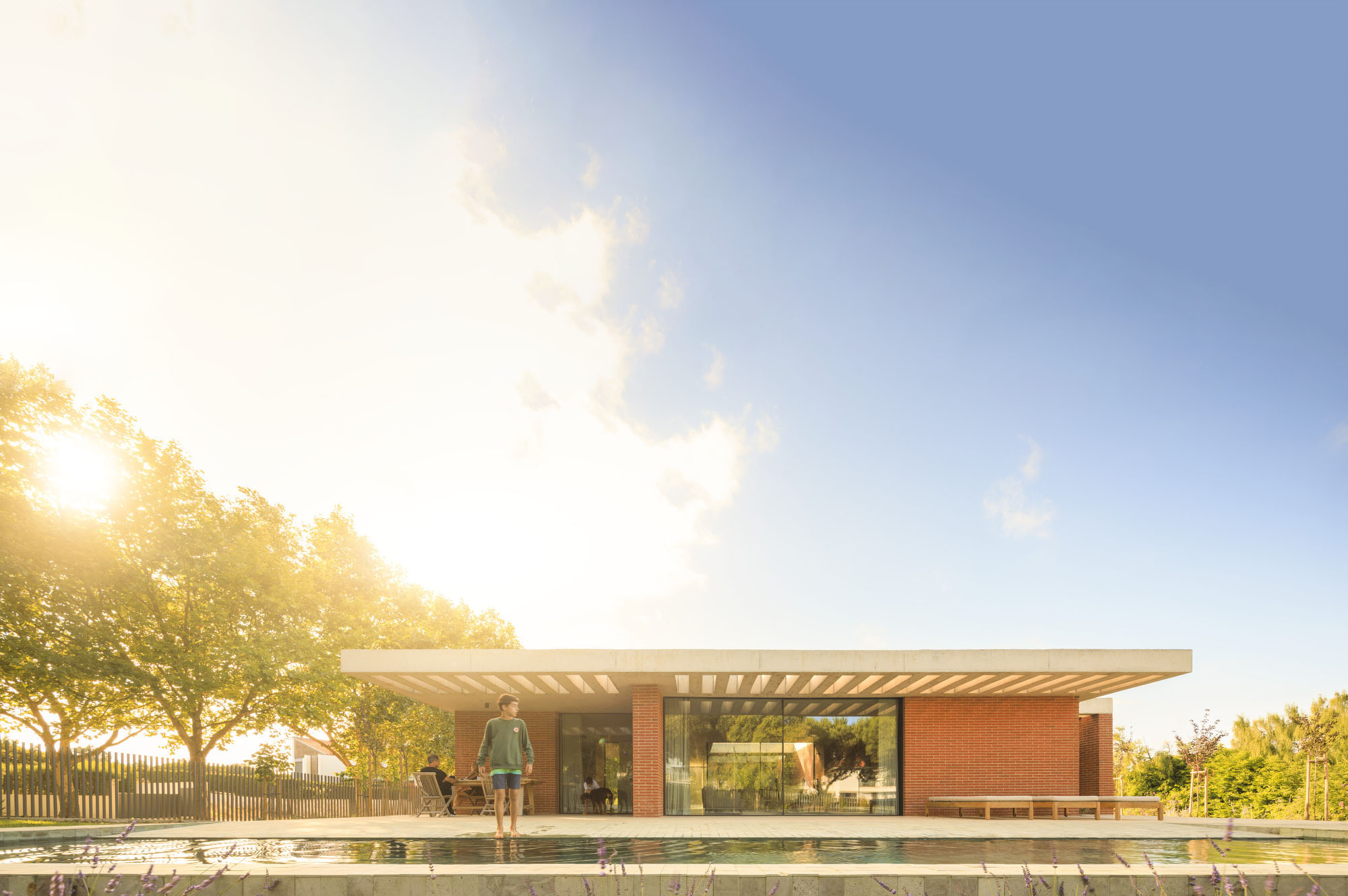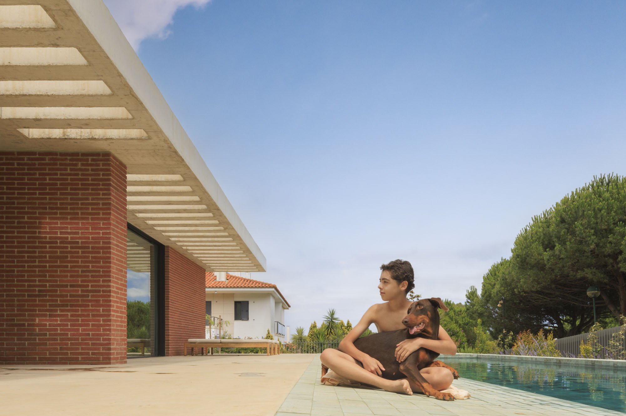 Inside, there is what we can cal "harmony" betwee the white vertical planes and the solid red brick planes. Spaces are hierarchically distributed, and the courtyards and voids highlight the evident landscaping work.