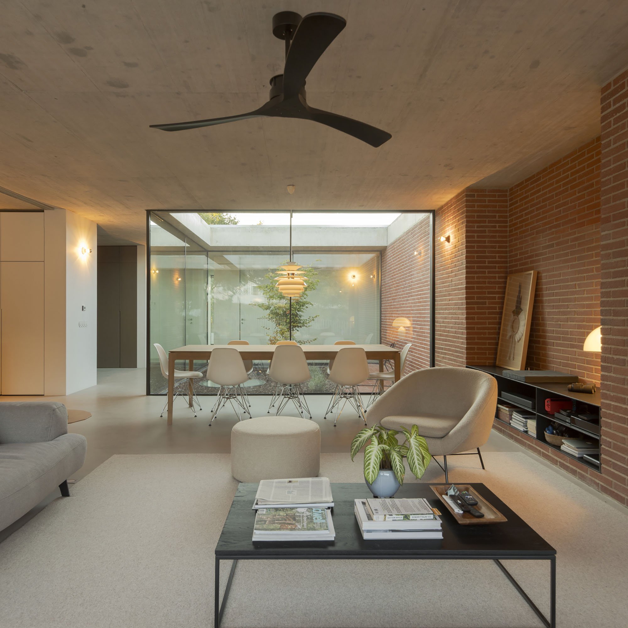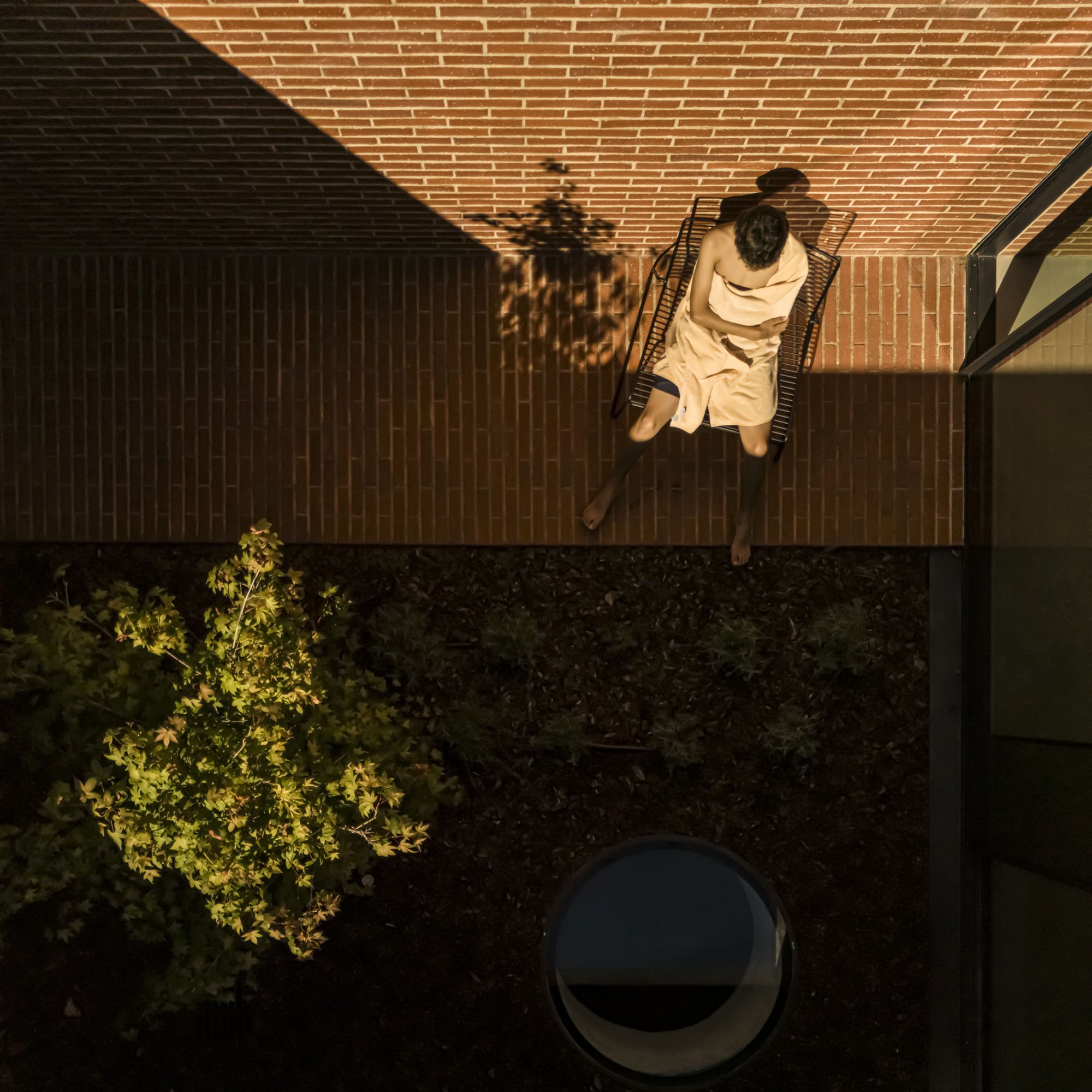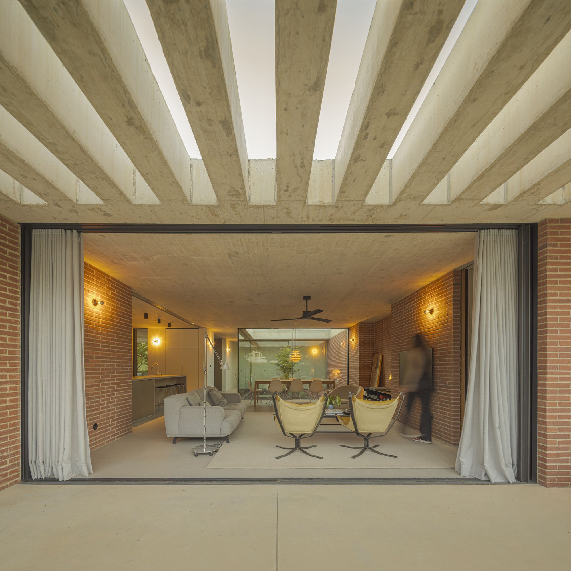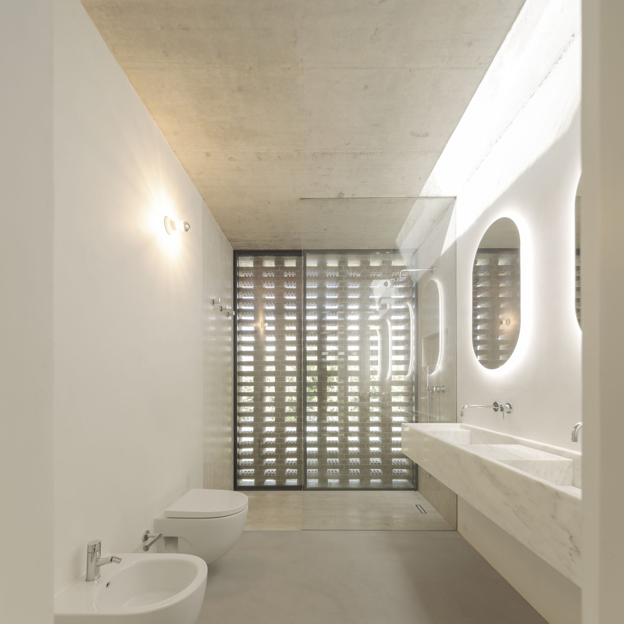 Inside, there is what we can cal "harmony" betwee the white vertical planes and the solid red brick planes. Spaces are hierarchically distributed, and the courtyards and voids highlight the evident landscaping work.