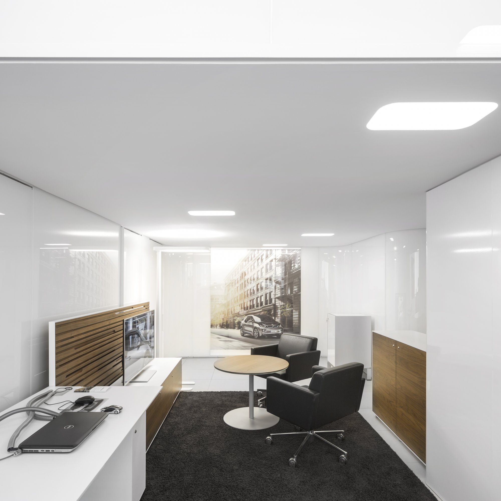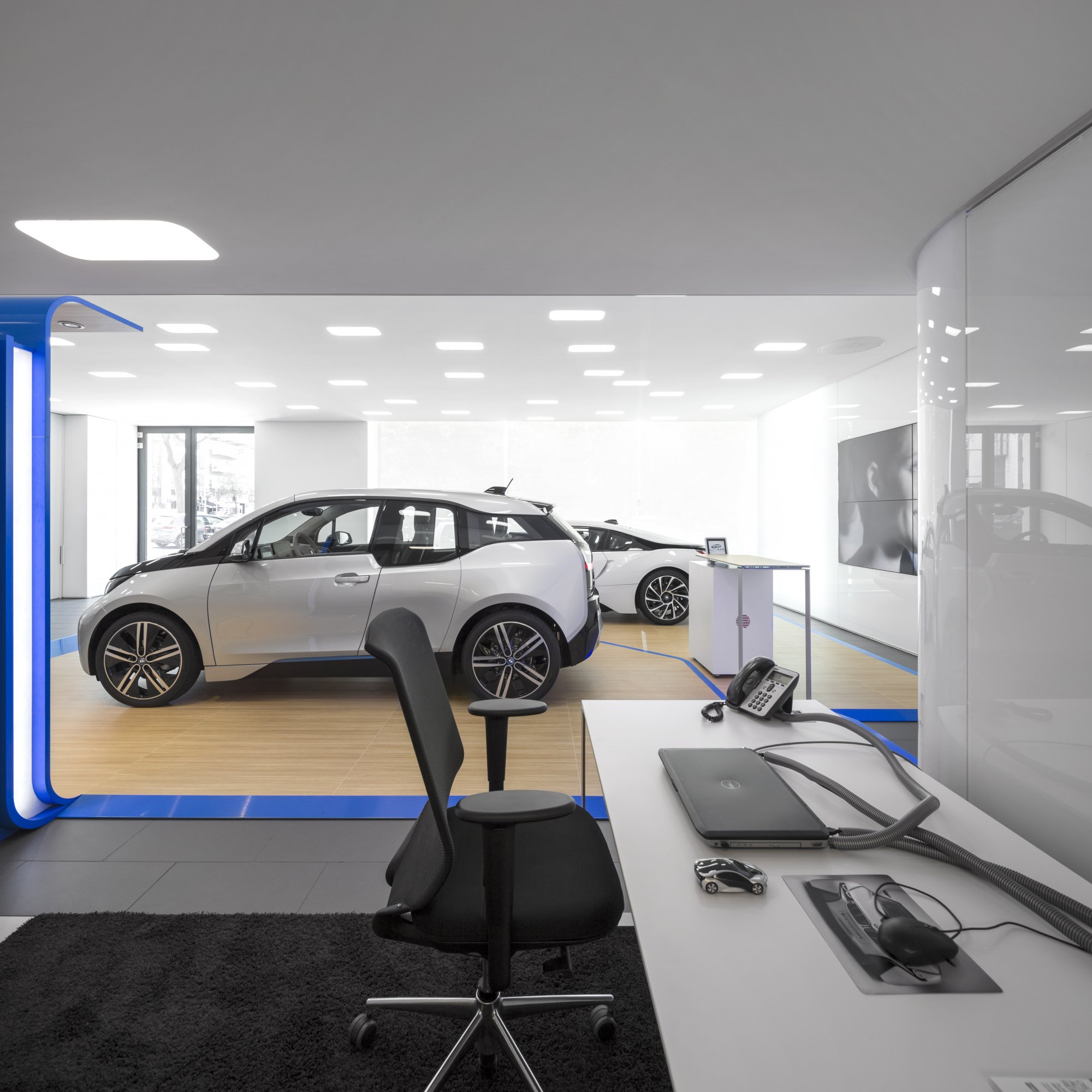The unending movement of the spontaneous line surrounds the available space, hiding corners and eliminating boudaries. On one side, a wall of uniform light ending with a vertical blue LED light that refers to BMWi. On the other side, round car headlights that swich to become visible, and then switch off, and disappear.