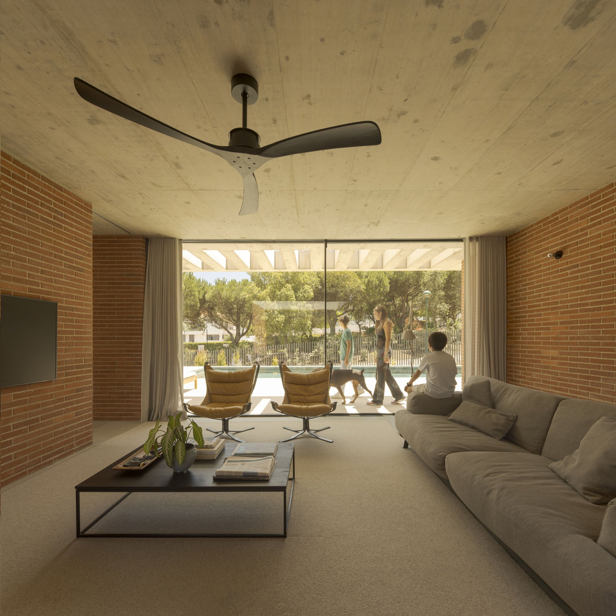 Inside, there is what we can cal "harmony" betwee the white vertical planes and the solid red brick planes. Spaces are hierarchically distributed, and the courtyards and voids highlight the evident landscaping work.