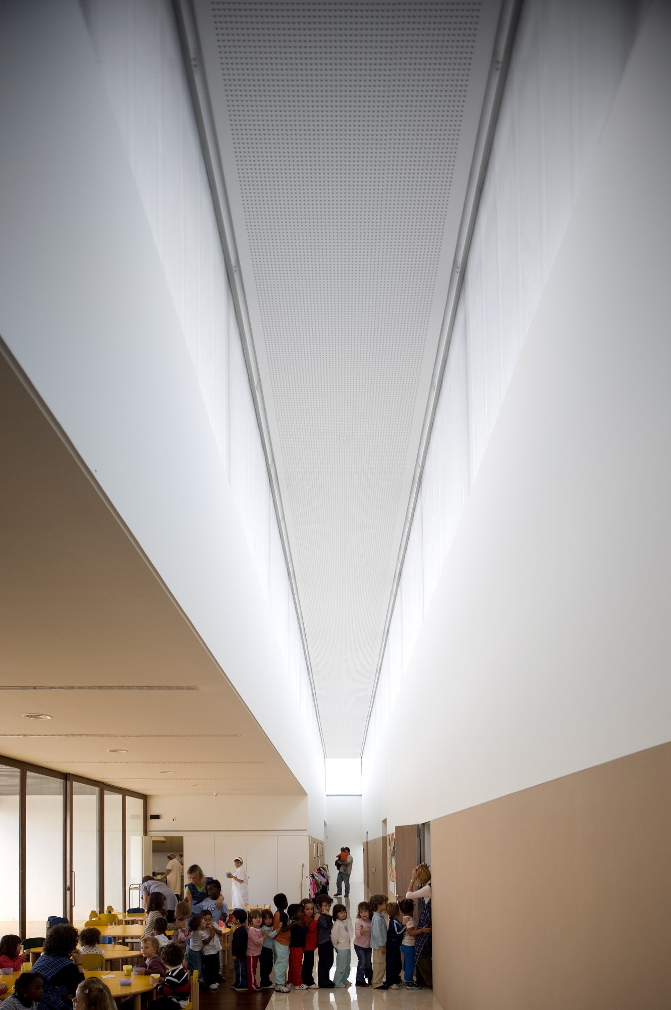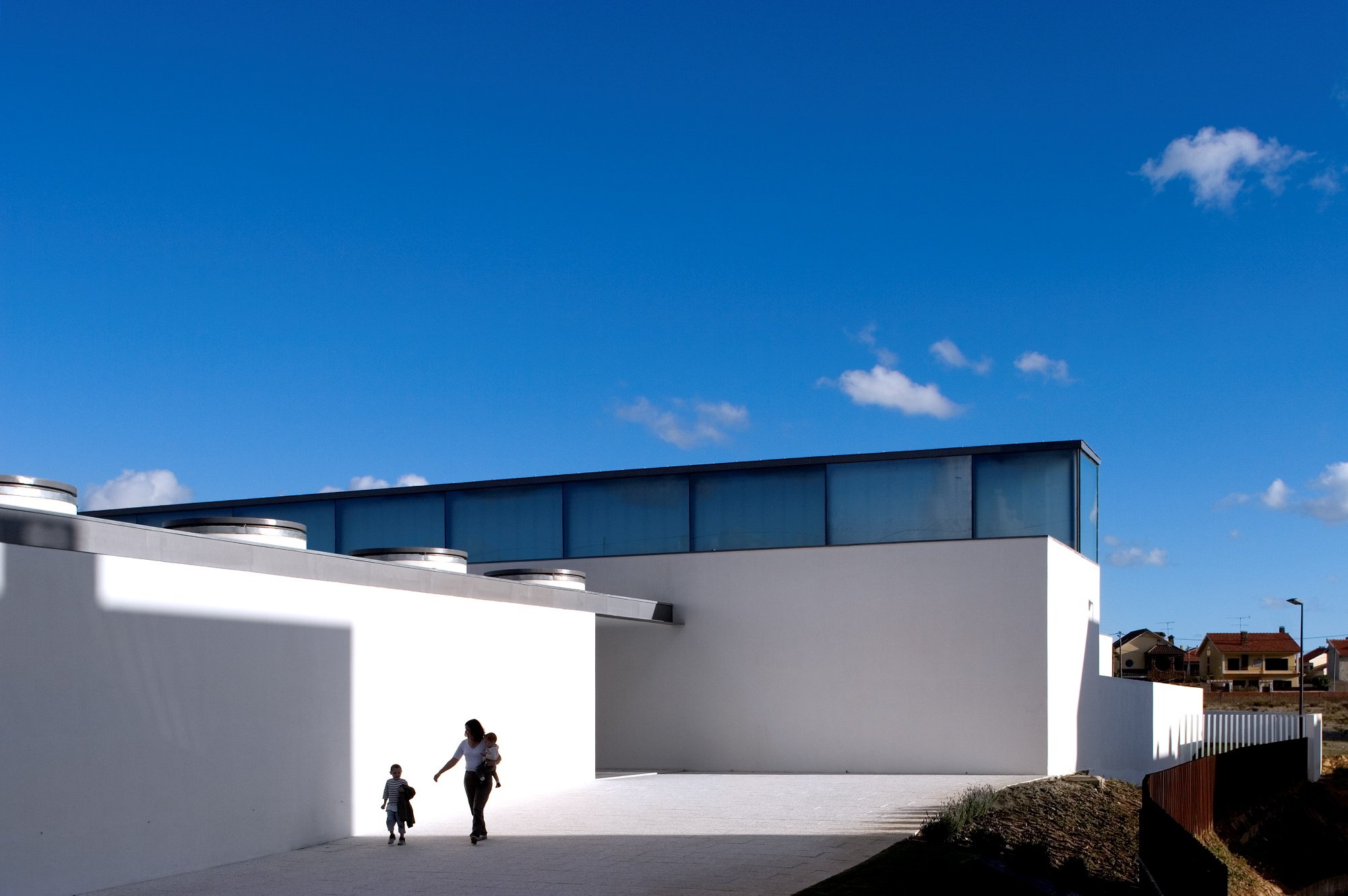 The kindergardn is located in a promontory with two different and interesting views, one towards the sea and the other facing Sintra's mountains/hills. The idea was not only to use but to incorporate important references from the children's imaginary world. Taking this into account, the present school was designed using pure, simple and regular volumes and shapes, either opaque or transparent, with some cylindrical skylights cutting the ceiling allowing the entrance of natural light.