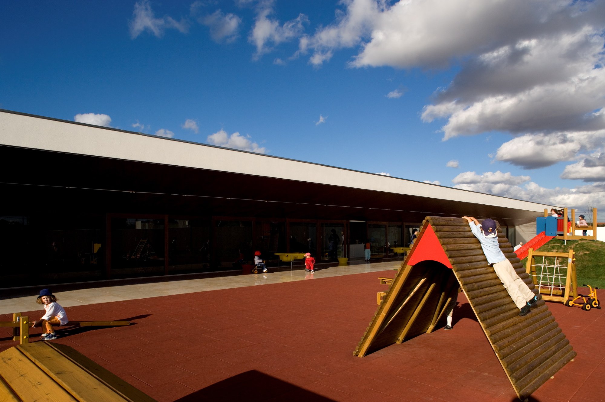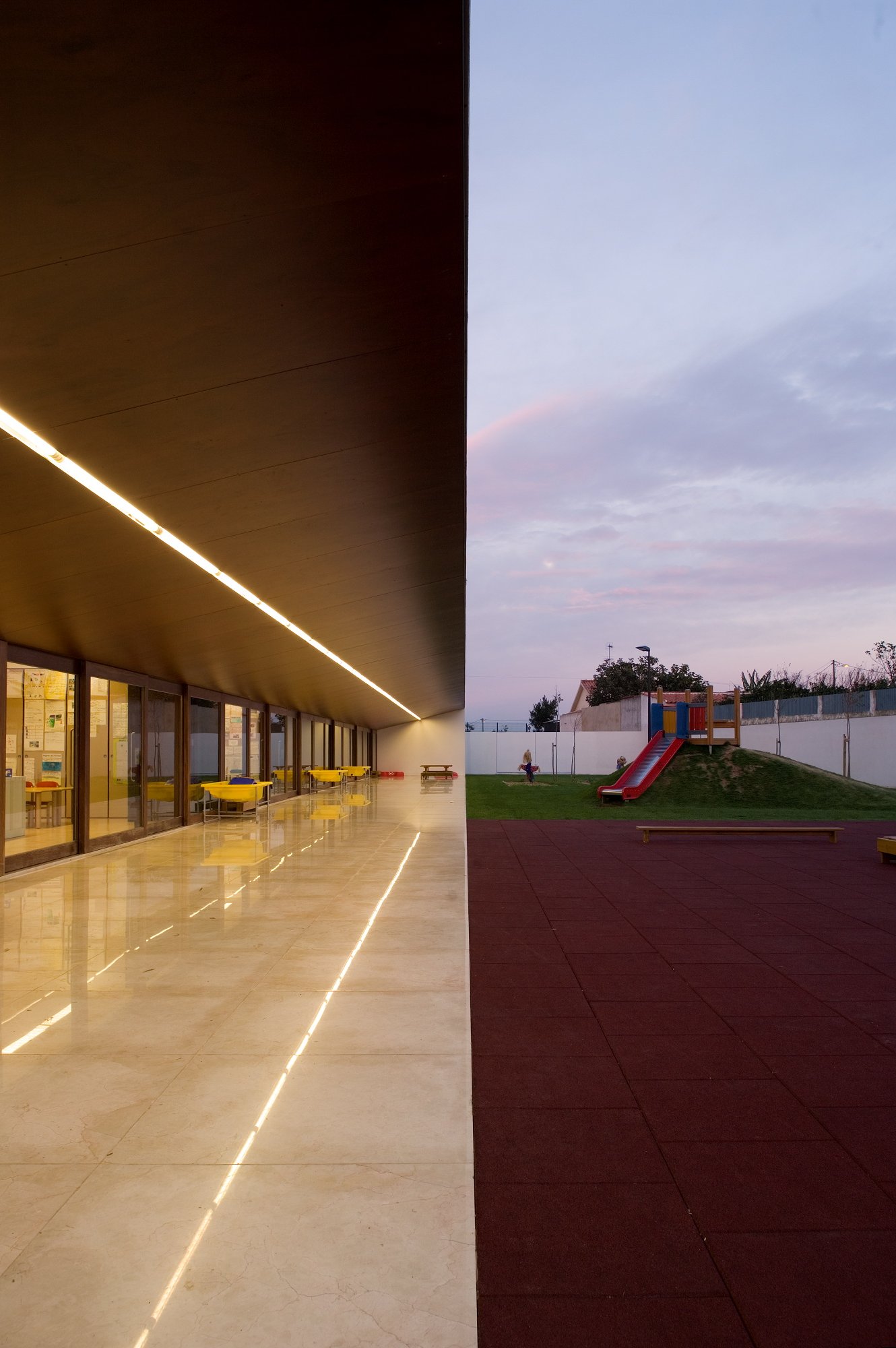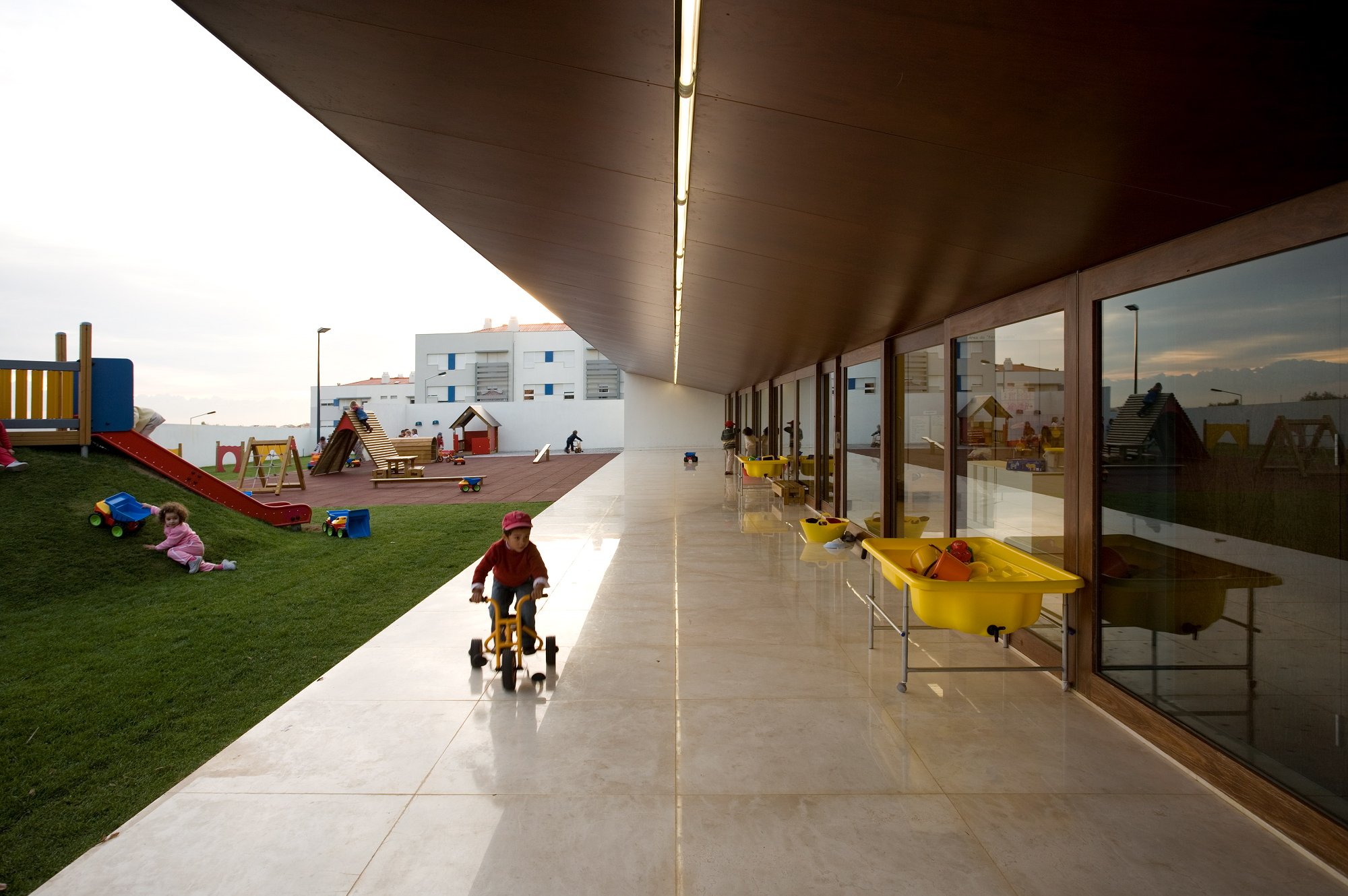 The kindergardn is located in a promontory with two different and interesting views, one towards the sea and the other facing Sintra's mountains/hills. The idea was not only to use but to incorporate important references from the children's imaginary world. Taking this into account, the present school was designed using pure, simple and regular volumes and shapes, either opaque or transparent, with some cylindrical skylights cutting the ceiling allowing the entrance of natural light.
