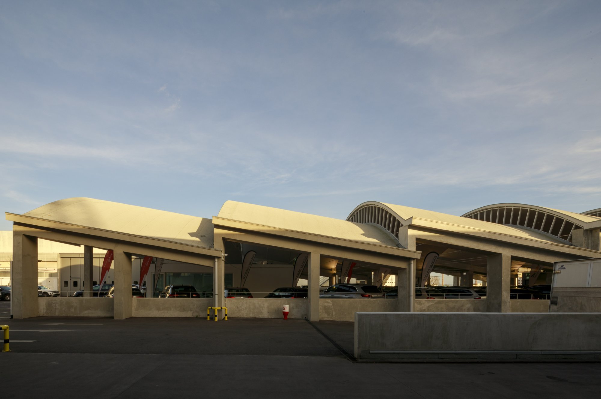 Our main focus was to rehabilitate the old facilities by integrating three types of new facilities underneath - workshops, warehouses and stands - from different car brands just as Volkswagen, Audi, Cupra and Skoda. For this purpose, the plan was to adapt the existing pavilions through the demolition of specific sectors and build new parts on the street front and rear areas of the land, perfectly integrating the new with the renewed builings. In order to emphasize the location of the Lighthouse installation and establish visual contact with costumers, not only the vehiles on display but also the reception area, were thought and projected to stay in the front façade framed by huge glazed glass planes.