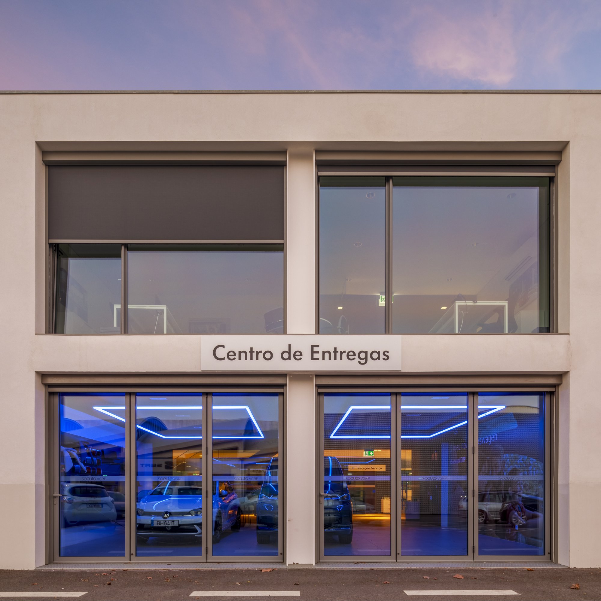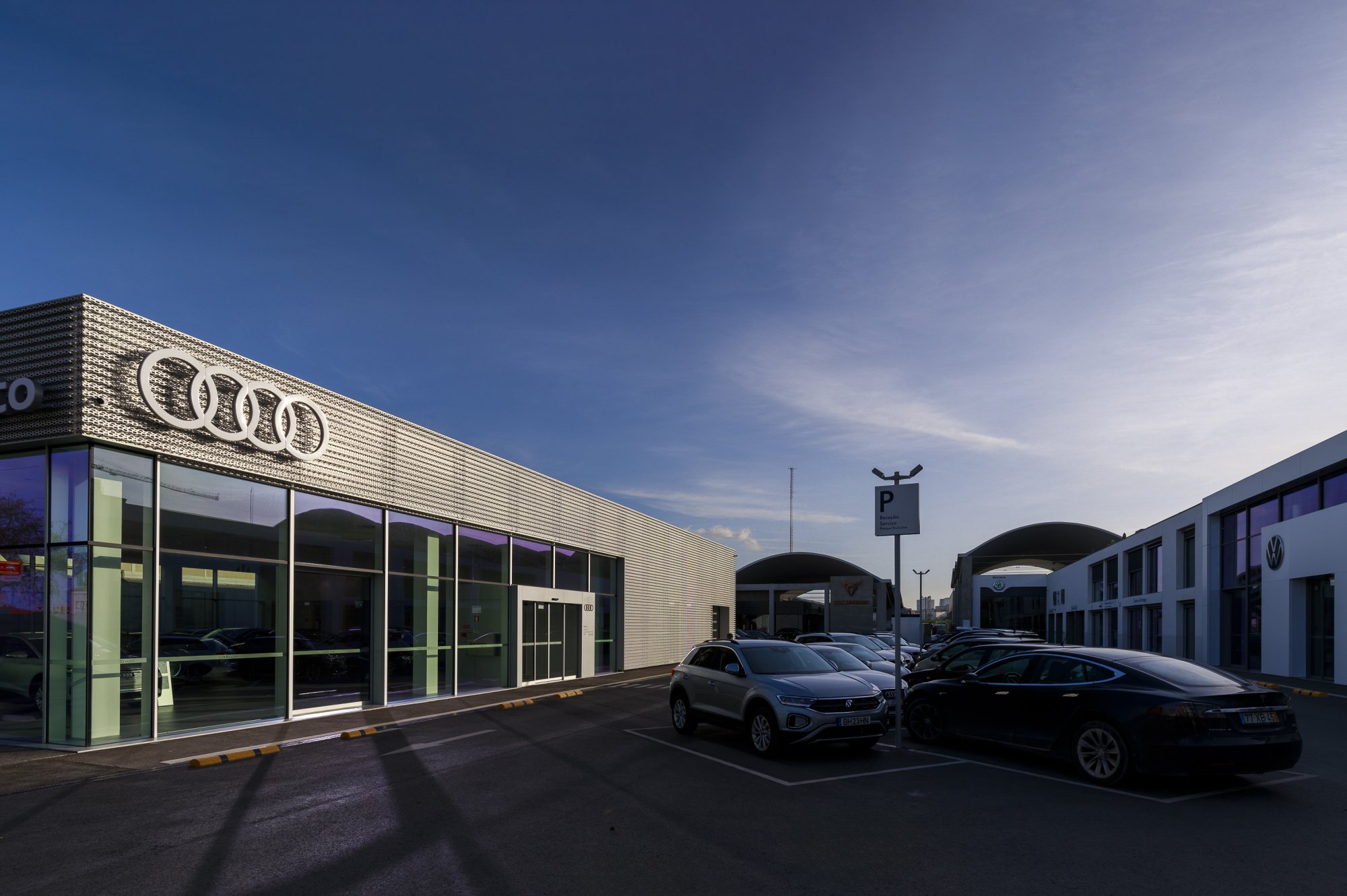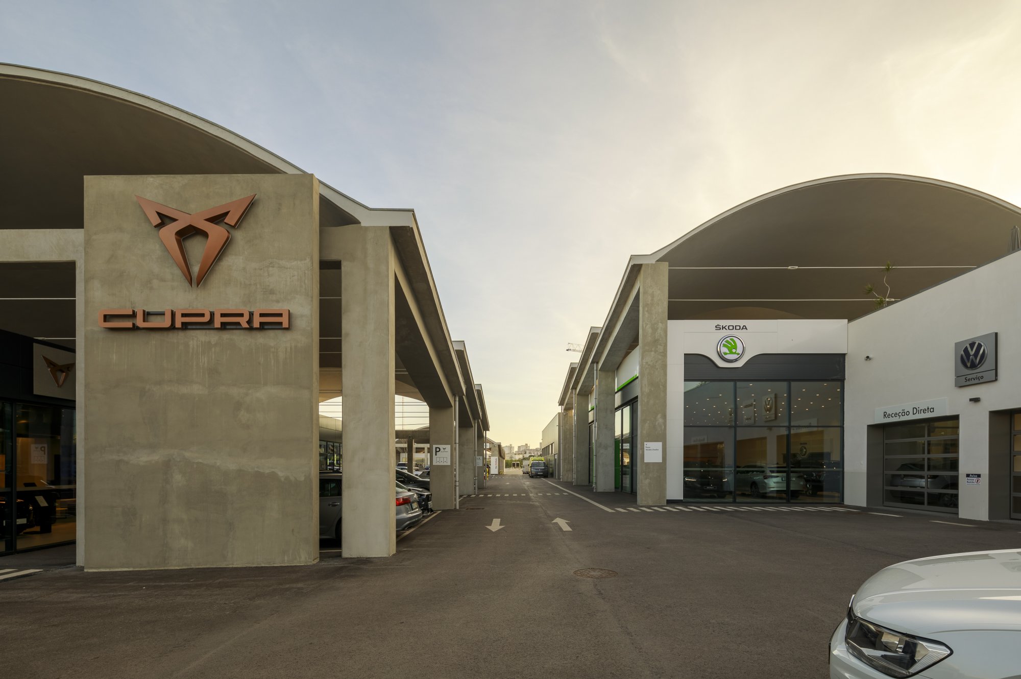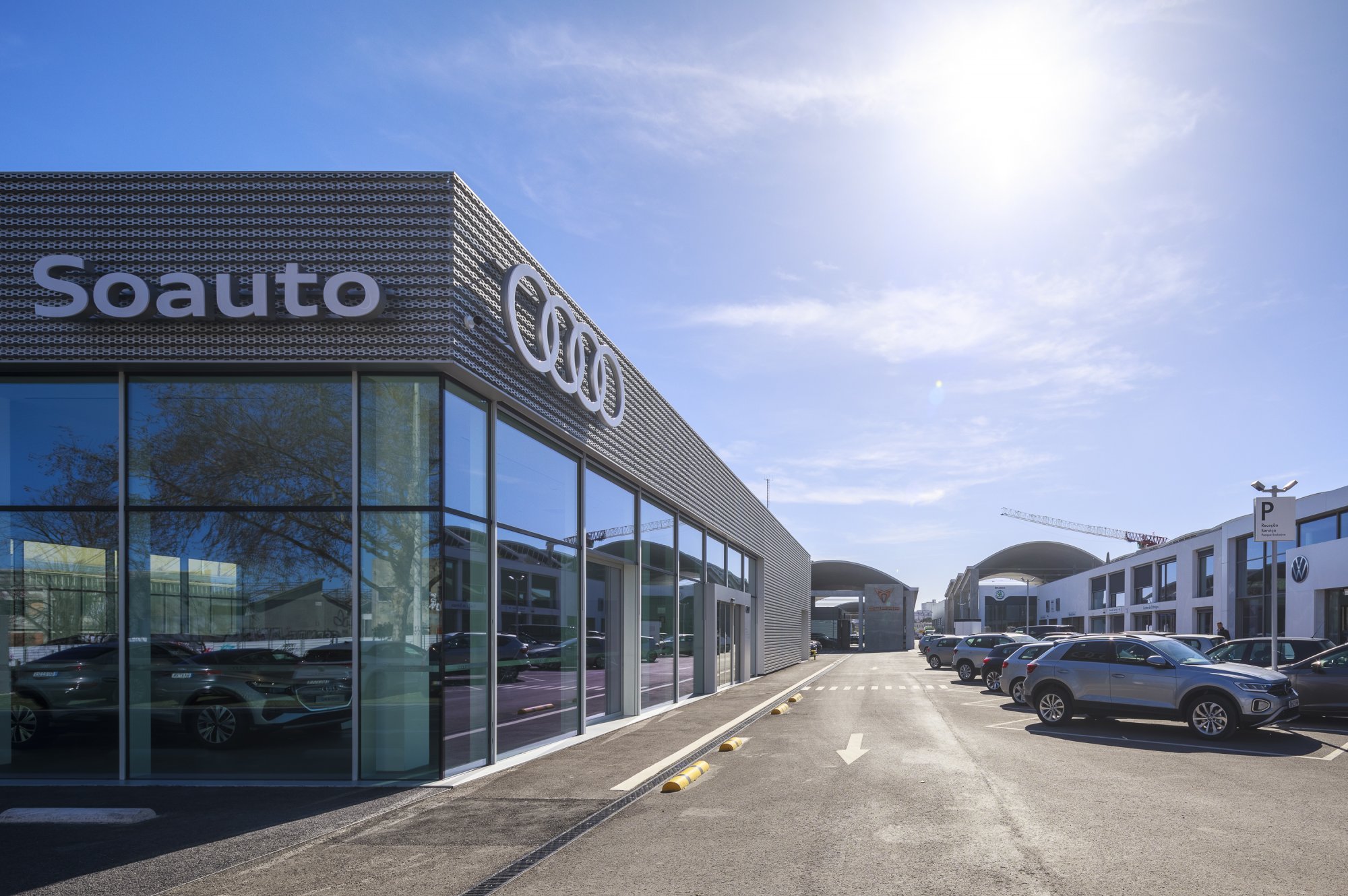 Our main focus was to rehabilitate the old facilities by integrating three types of new facilities underneath - workshops, warehouses and stands - from different car brands just as Volkswagen, Audi, Cupra and Skoda. For this purpose, the plan was to adapt the existing pavilions through the demolition of specific sectors and build new parts on the street front and rear areas of the land, perfectly integrating the new with the renewed builings. In order to emphasize the location of the Lighthouse installation and establish visual contact with costumers, not only the vehiles on display but also the reception area, were thought and projected to stay in the front façade framed by huge glazed glass planes.