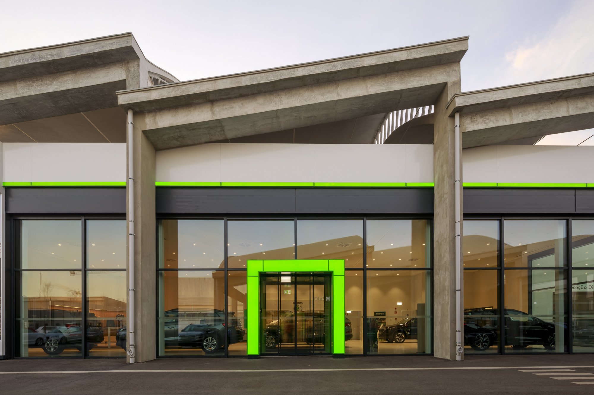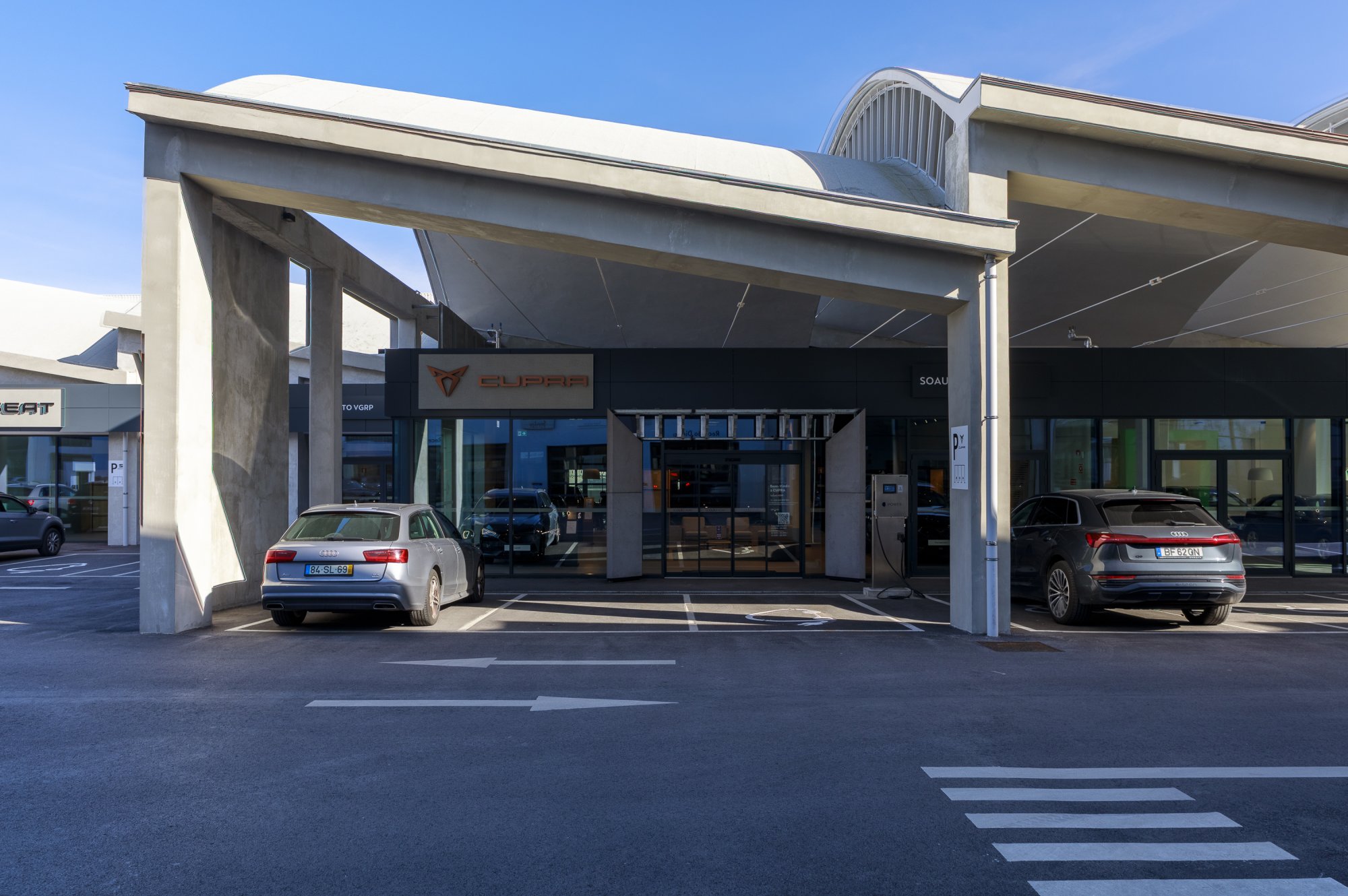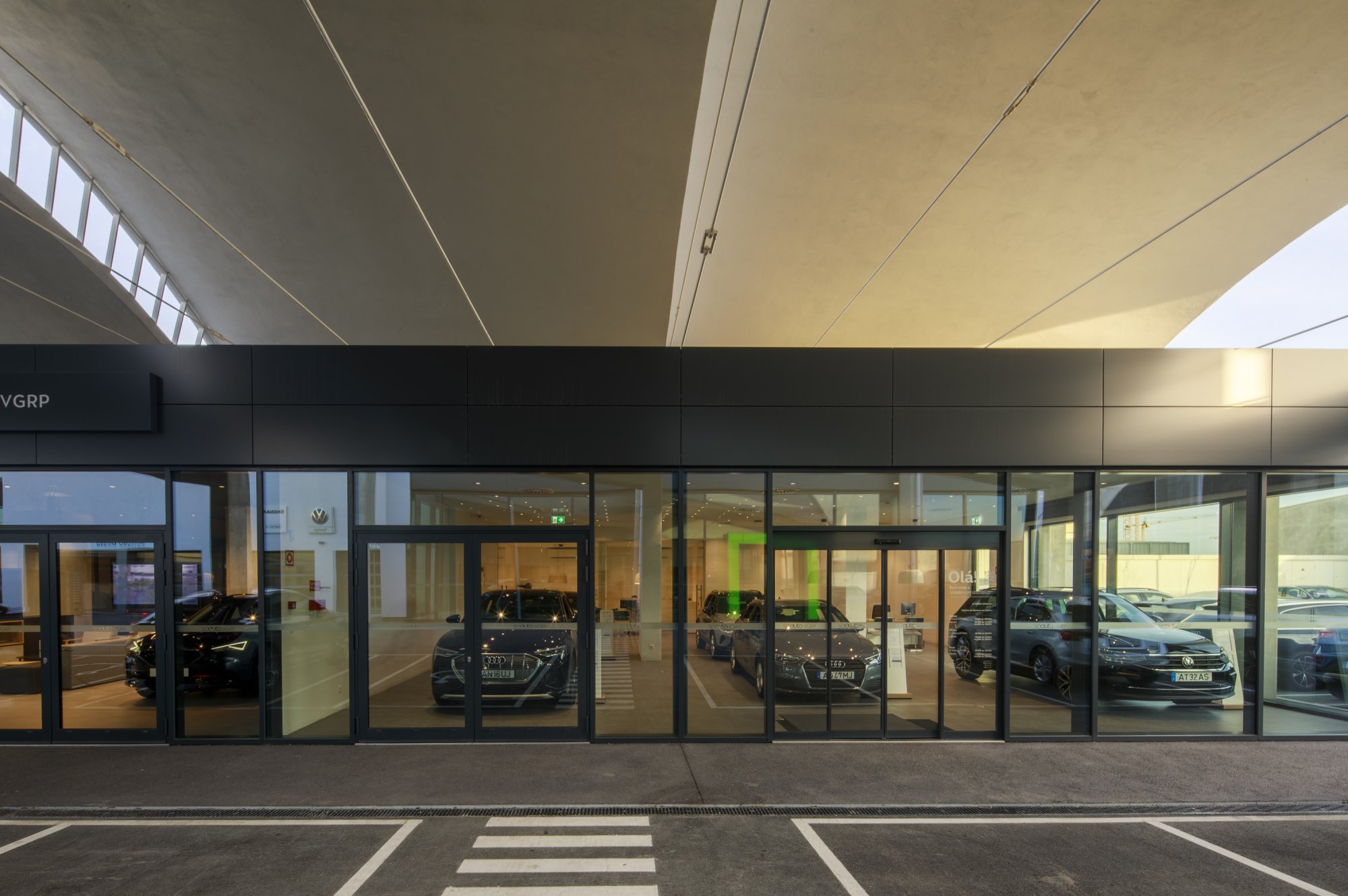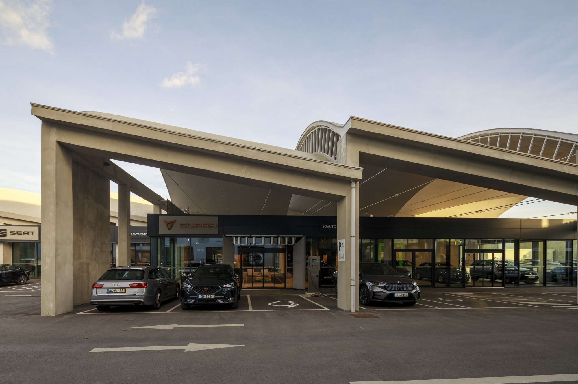 Our main focus was to rehabilitate the old facilities by integrating three types of new facilities underneath - workshops, warehouses and stands - from different car brands just as Volkswagen, Audi, Cupra and Skoda. For this purpose, the plan was to adapt the existing pavilions through the demolition of specific sectors and build new parts on the street front and rear areas of the land, perfectly integrating the new with the renewed builings. In order to emphasize the location of the Lighthouse installation and establish visual contact with costumers, not only the vehiles on display but also the reception area, were thought and projected to stay in the front façade framed by huge glazed glass planes.
