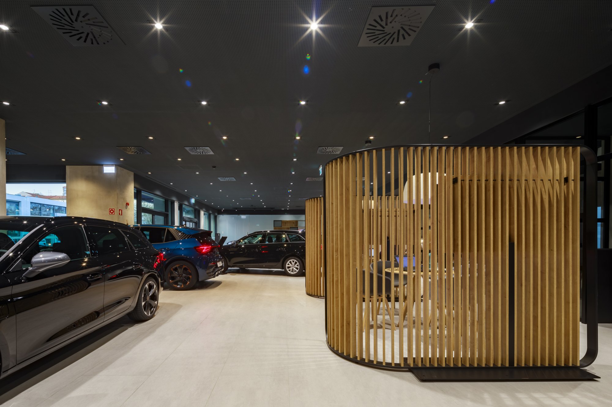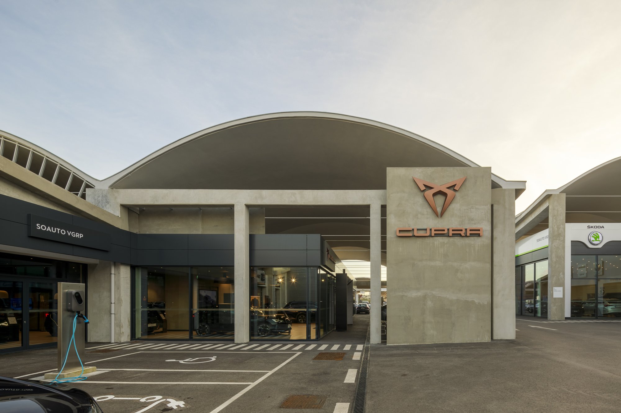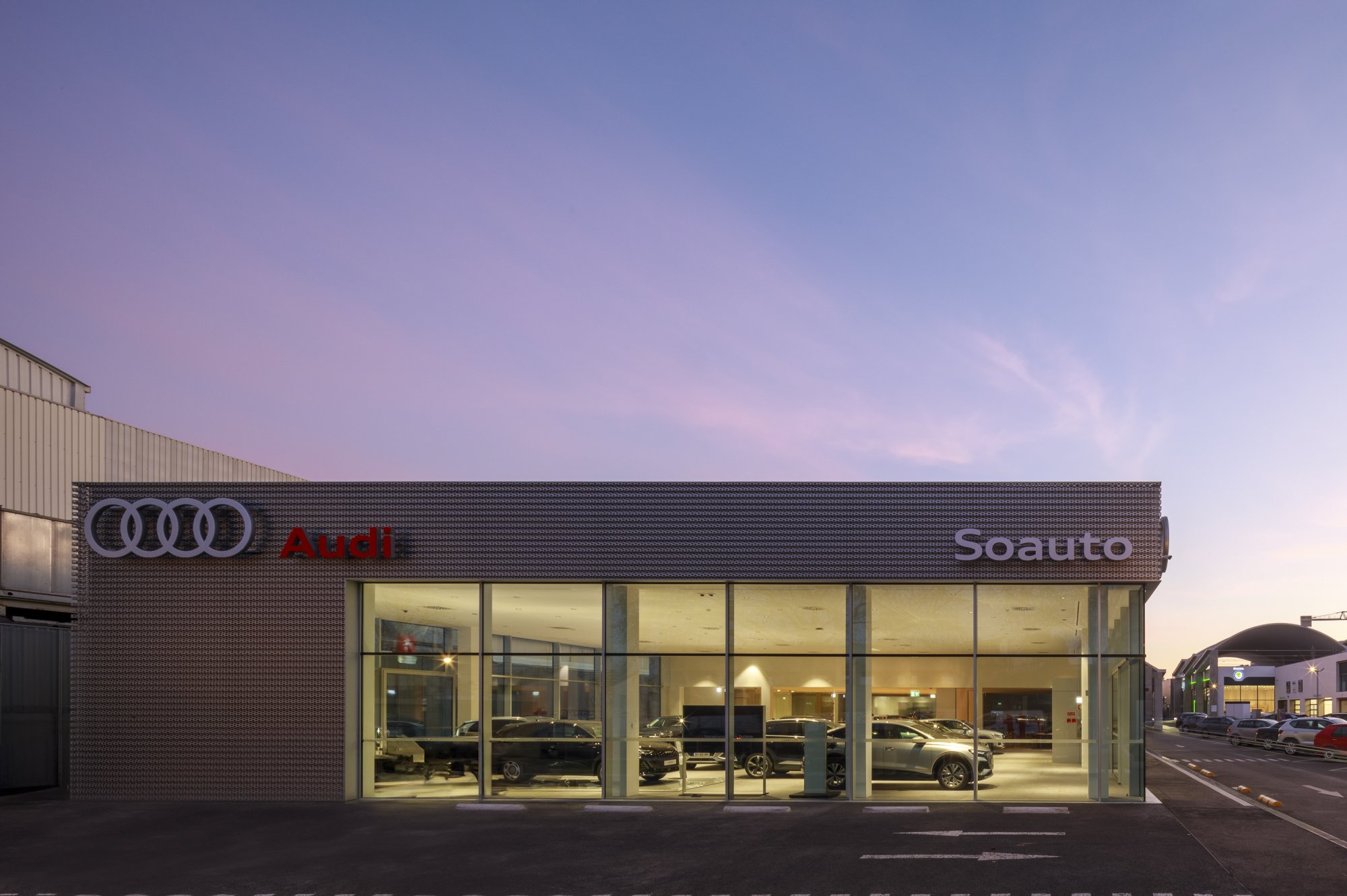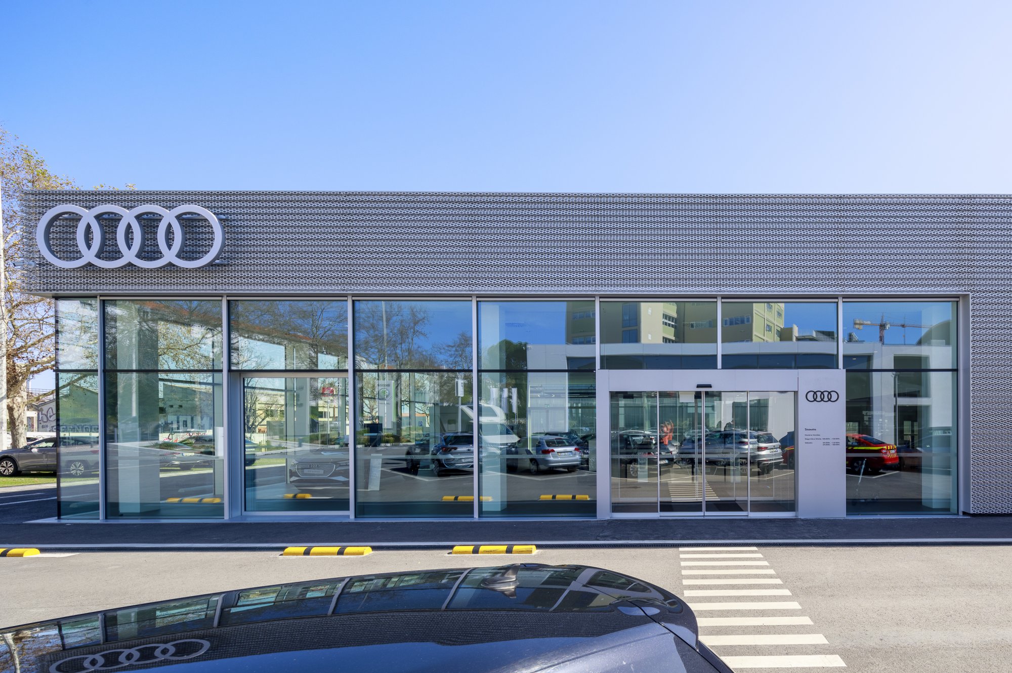 Our main focus was to rehabilitate the old facilities by integrating three types of new facilities underneath - workshops, warehouses and stands - from different car brands just as Volkswagen, Audi, Cupra and Skoda. For this purpose, the plan was to adapt the existing pavilions through the demolition of specific sectors and build new parts on the street front and rear areas of the land, perfectly integrating the new with the renewed builings. In order to emphasize the location of the Lighthouse installation and establish visual contact with costumers, not only the vehiles on display but also the reception area, were thought and projected to stay in the front façade framed by huge glazed glass planes.