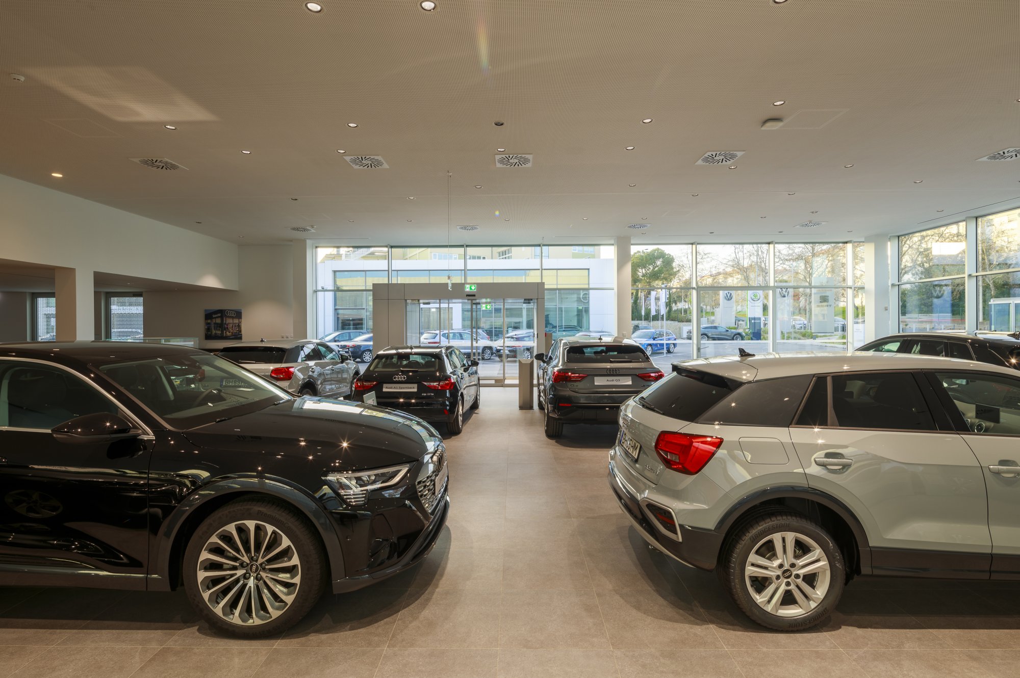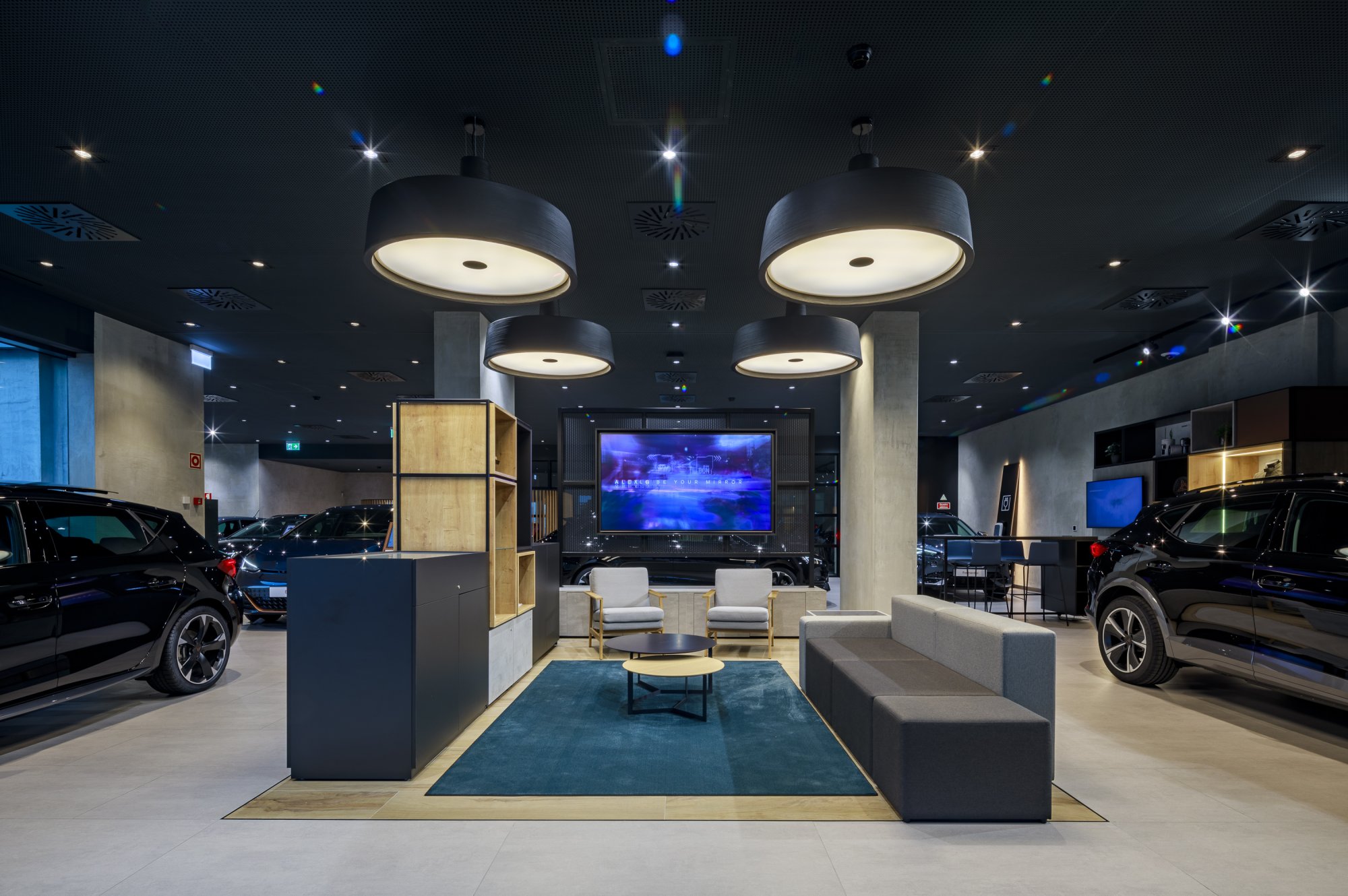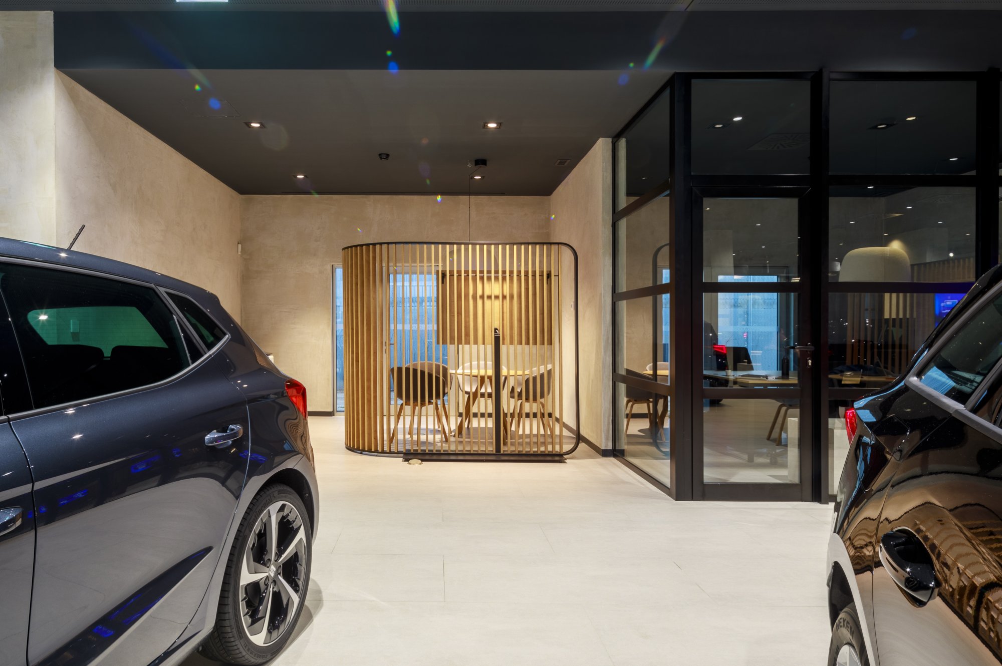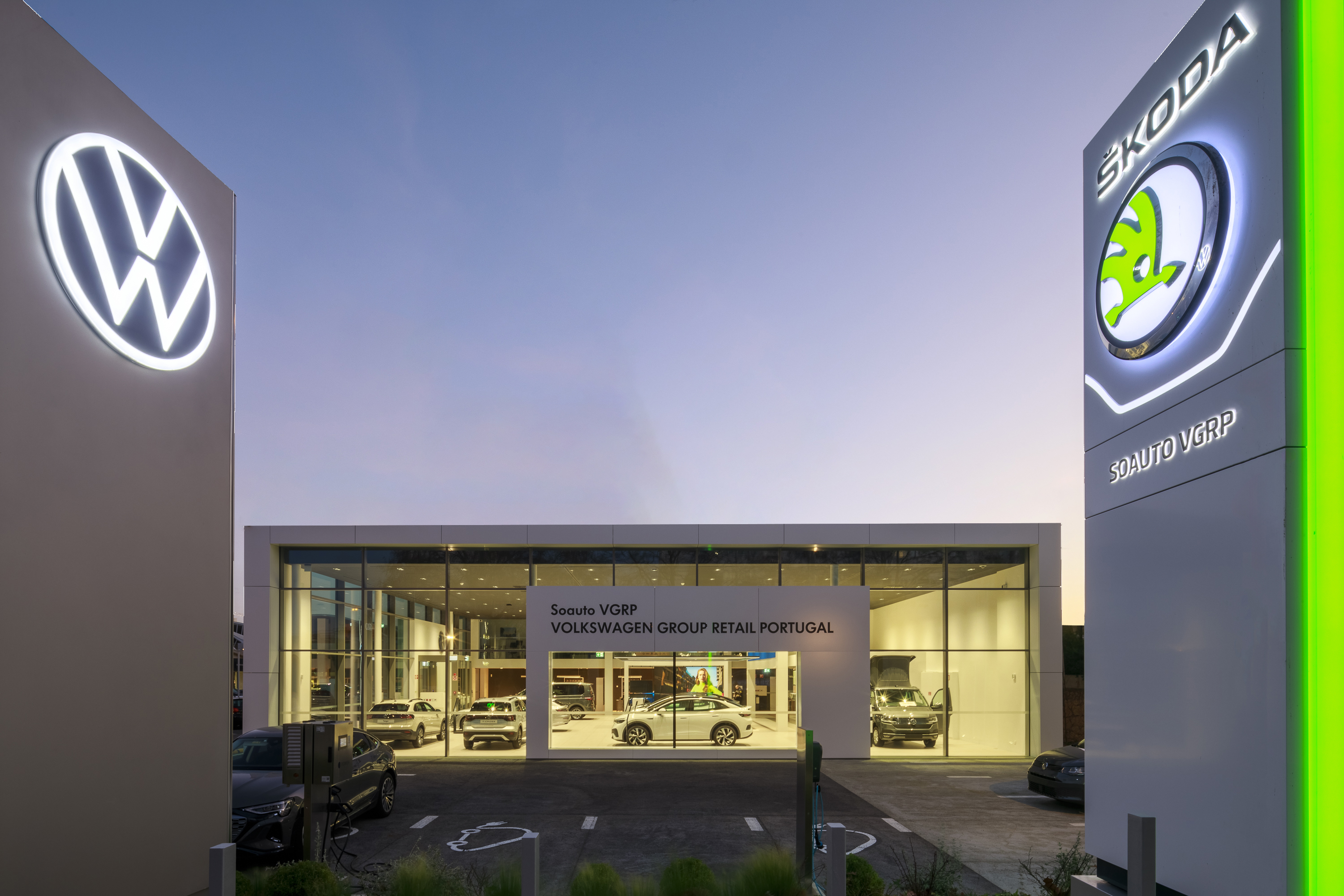 Our main focus was to rehabilitate the old facilities by integrating three types of new facilities underneath - workshops, warehouses and stands - from different car brands just as Volkswagen, Audi, Cupra and Skoda. For this purpose, the plan was to adapt the existing pavilions through the demolition of specific sectors and build new parts on the street front and rear areas of the land, perfectly integrating the new with the renewed builings. In order to emphasize the location of the Lighthouse installation and establish visual contact with costumers, not only the vehiles on display but also the reception area, were thought and projected to stay in the front façade framed by huge glazed glass planes.