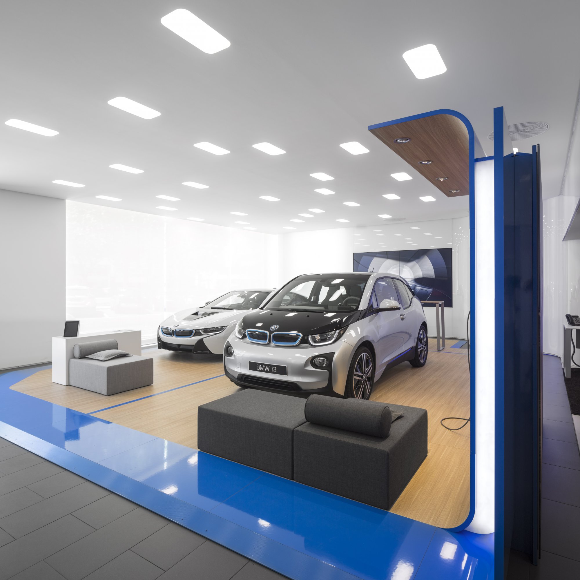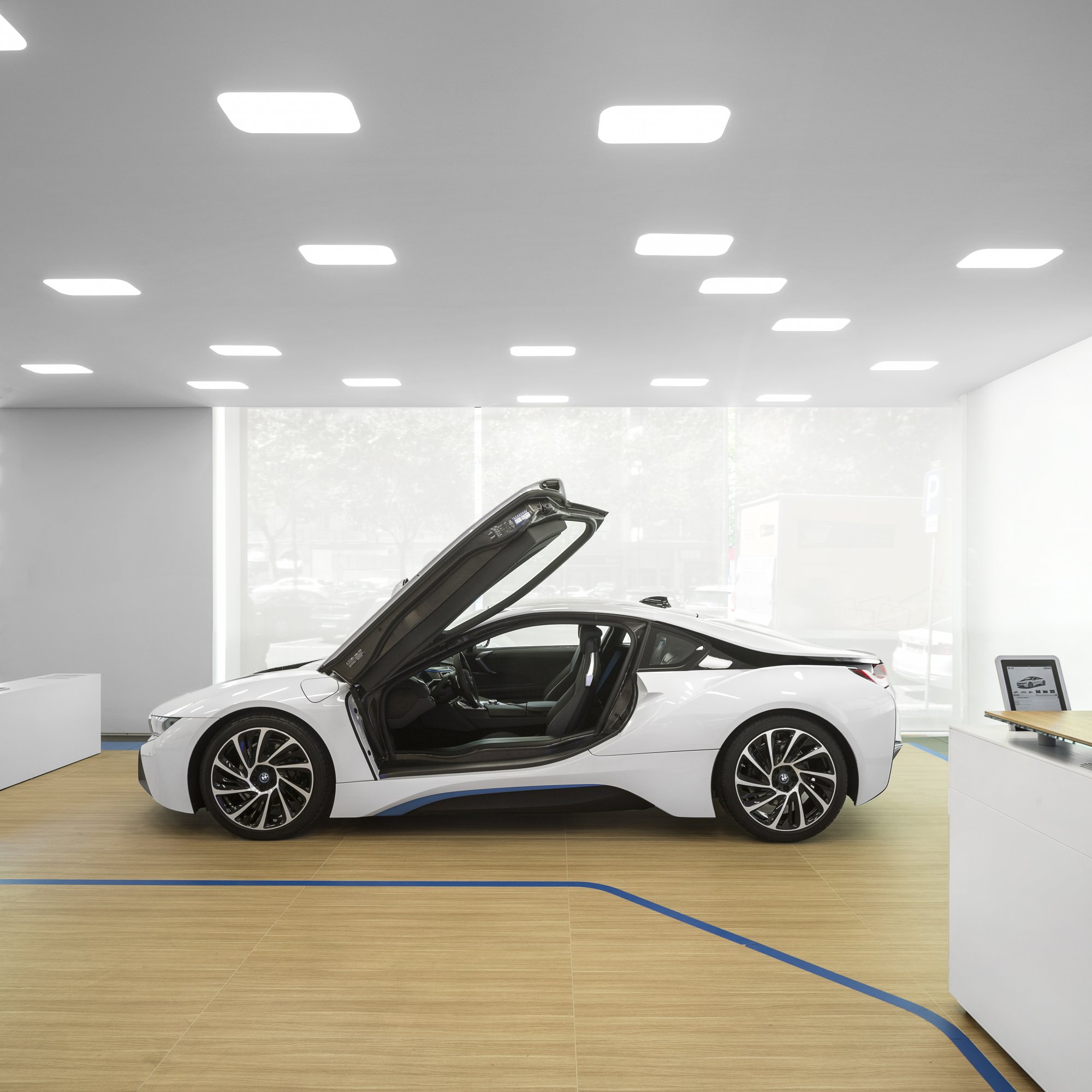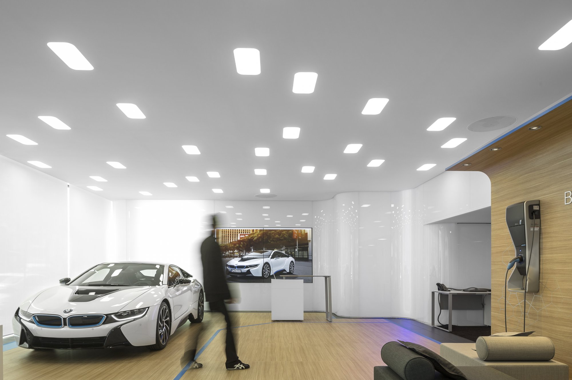 The unending movement of the spontaneous line surrounds the available space, hiding corners and eliminating boudaries. On one side, a wall of uniform light ending with a vertical blue LED light that refers to BMWi. On the other side, round car headlights that swich to become visible, and then switch off, and disappear.