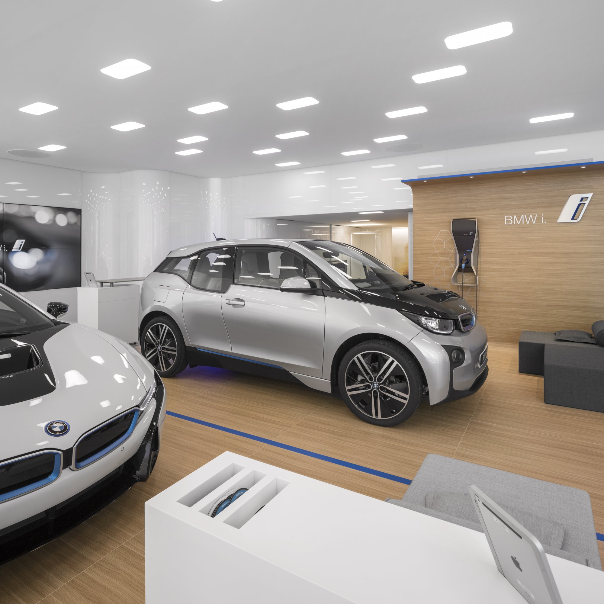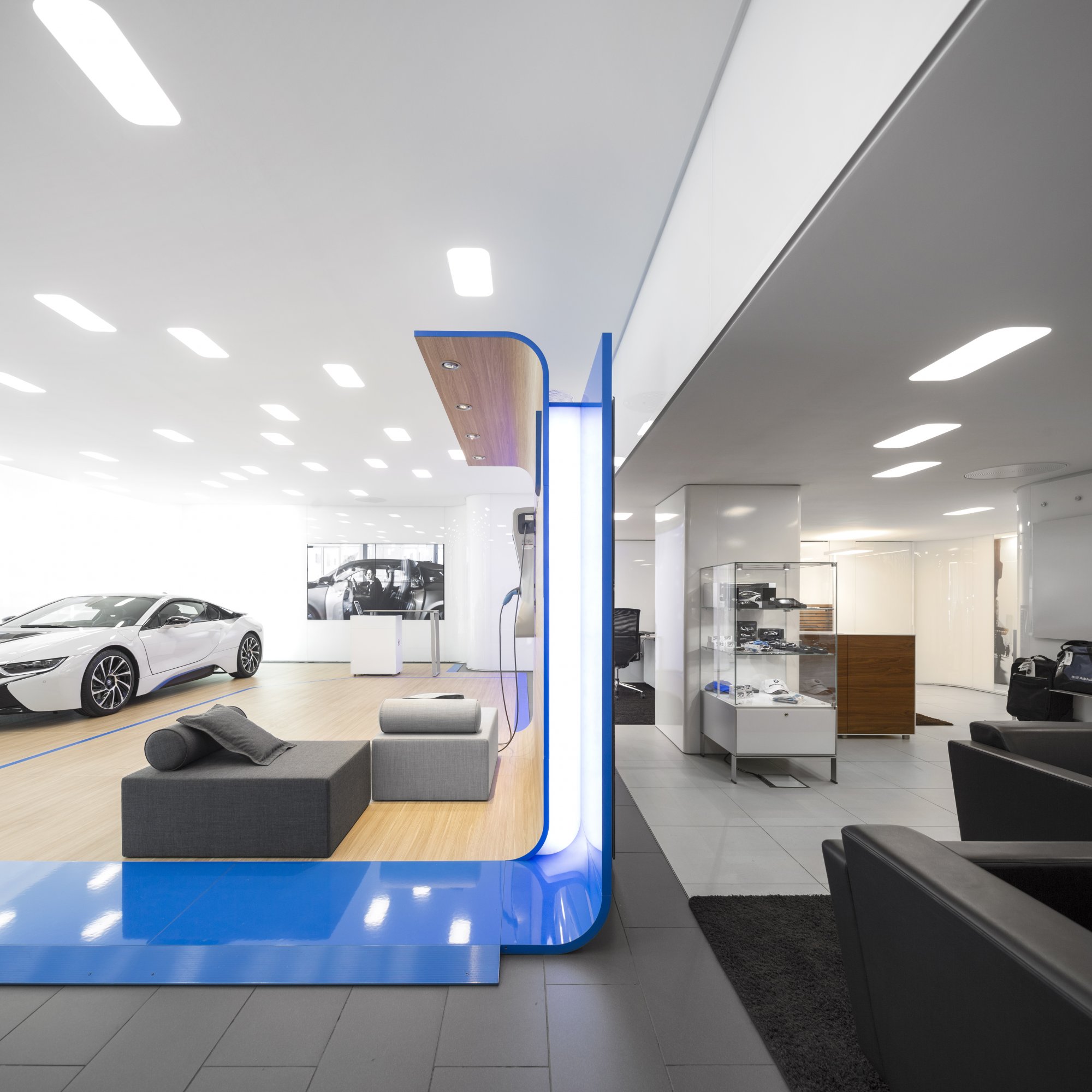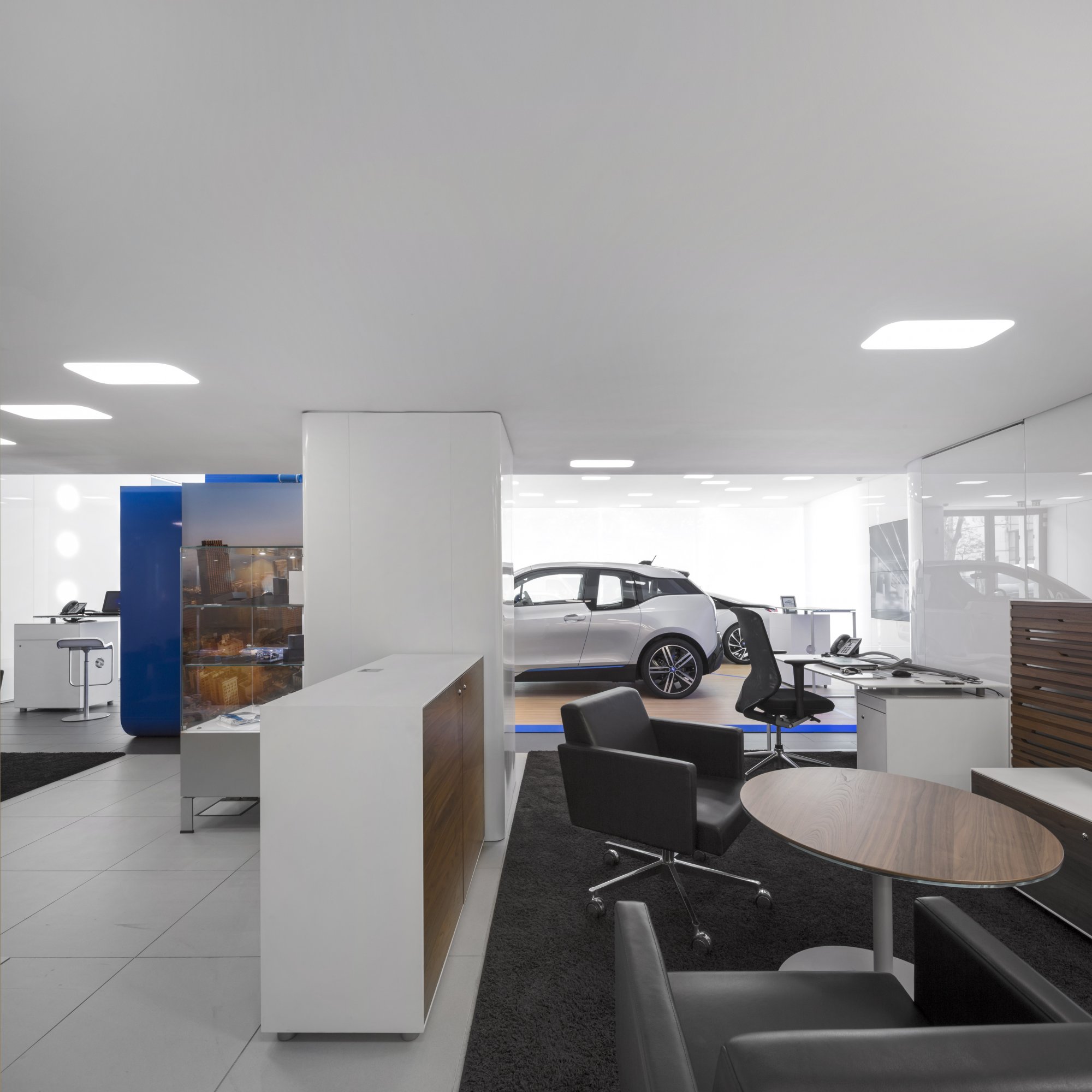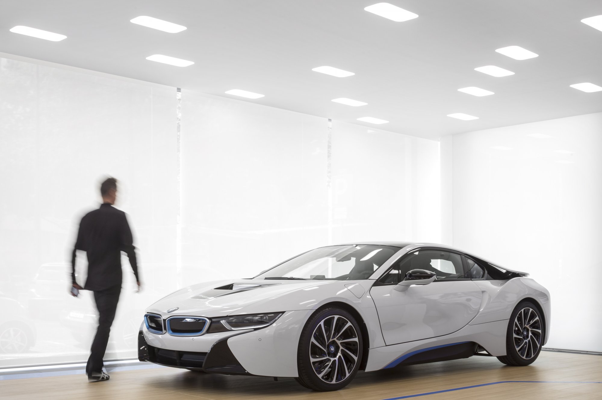 The unending movement of the spontaneous line surrounds the available space, hiding corners and eliminating boudaries. On one side, a wall of uniform light ending with a vertical blue LED light that refers to BMWi. On the other side, round car headlights that swich to become visible, and then switch off, and disappear.