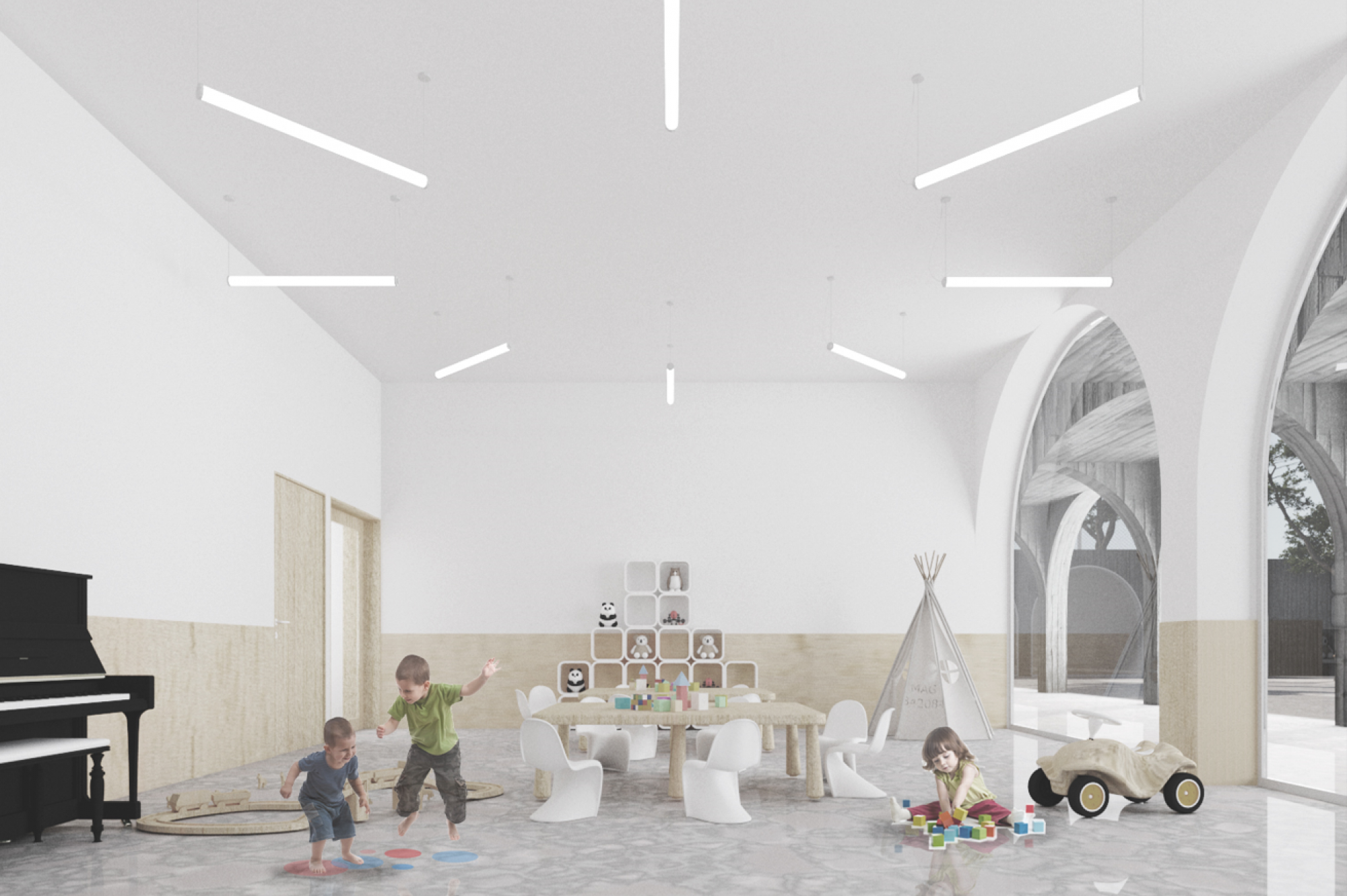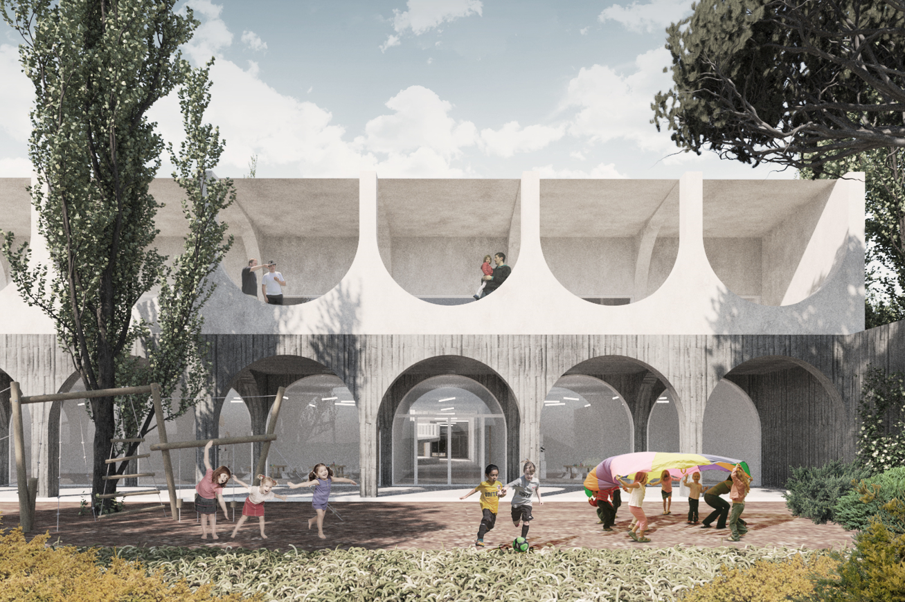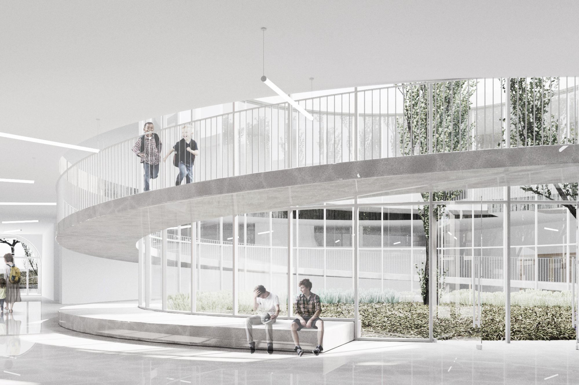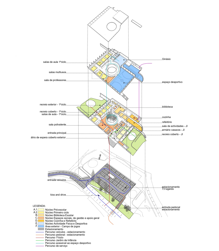 This School emerges in the midst of a forest - a garden that embraces it, protects it, and assumed itself as a balancing factor in attenuating solar radiation, providing better comfort conditions. The ancestral organization of circulations in the form of a cloister, punctuated by a strong influx of light, is the most suitable configuration for organizing the various functional areas of the school. A cloister, a central garden, an accessible path that develops in a circle around the courtyard, this poposal condenses the functional areas of the school, integrates the playgroung area on the roof, and frees up space around the building, increasing the public area, which through a green surrounding provides seating areas and inviting pathways.