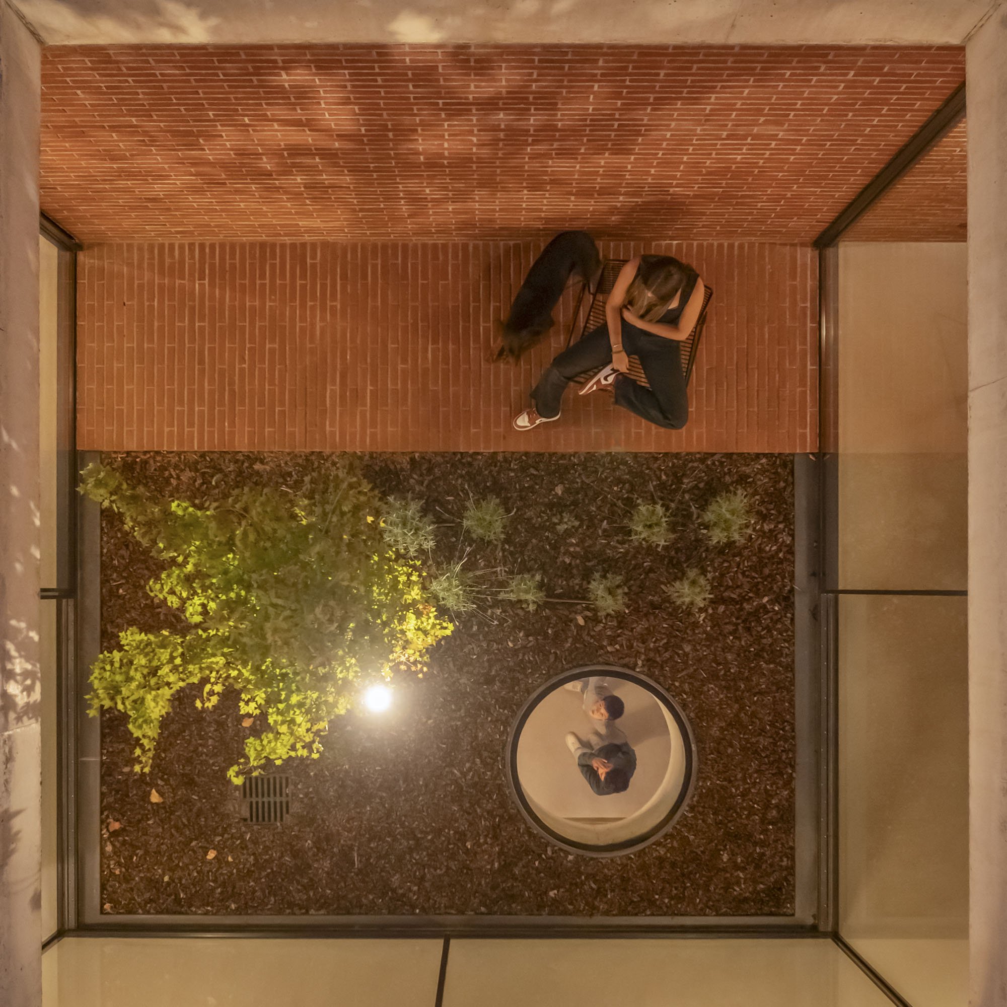 Inside, there is what we can cal "harmony" betwee the white vertical planes and the solid red brick planes. Spaces are hierarchically distributed, and the courtyards and voids highlight the evident landscaping work.