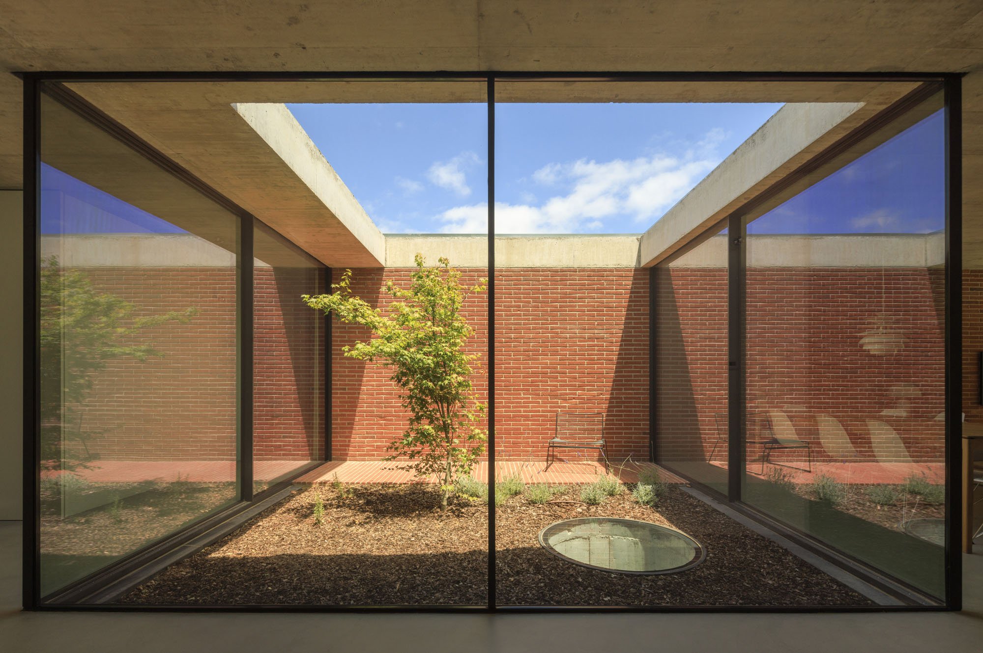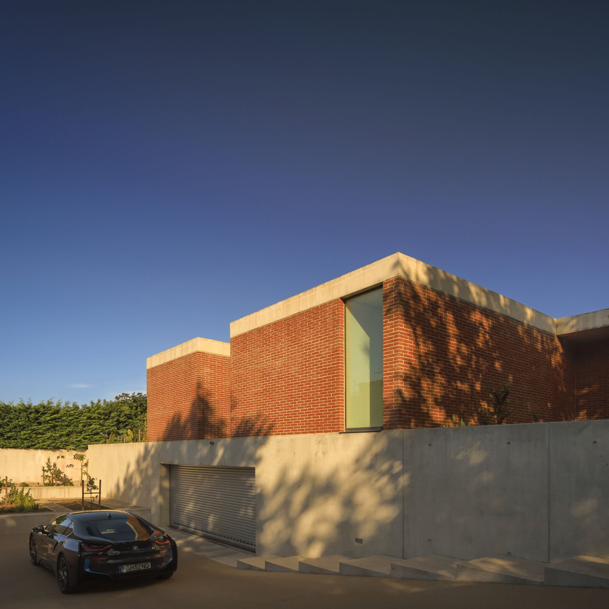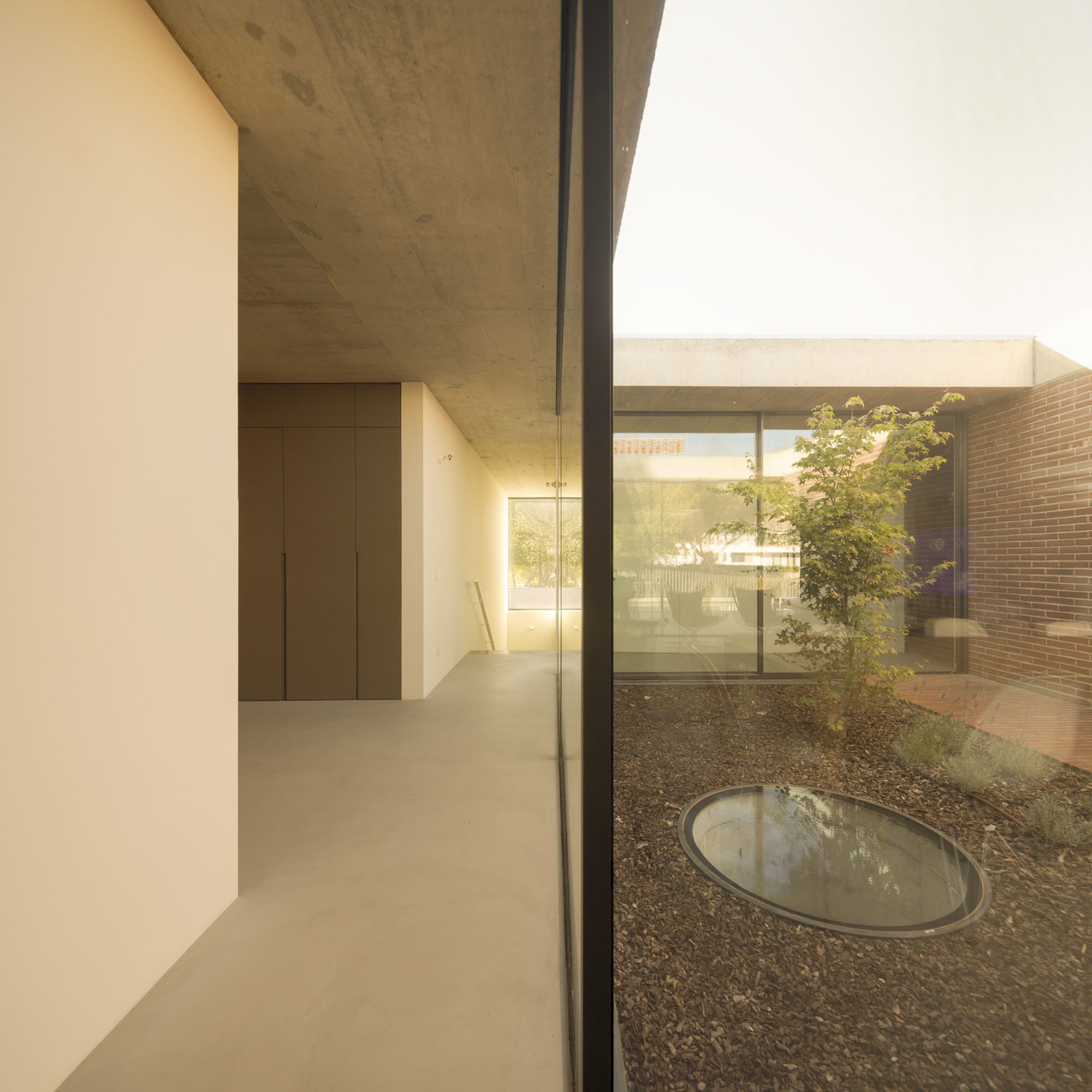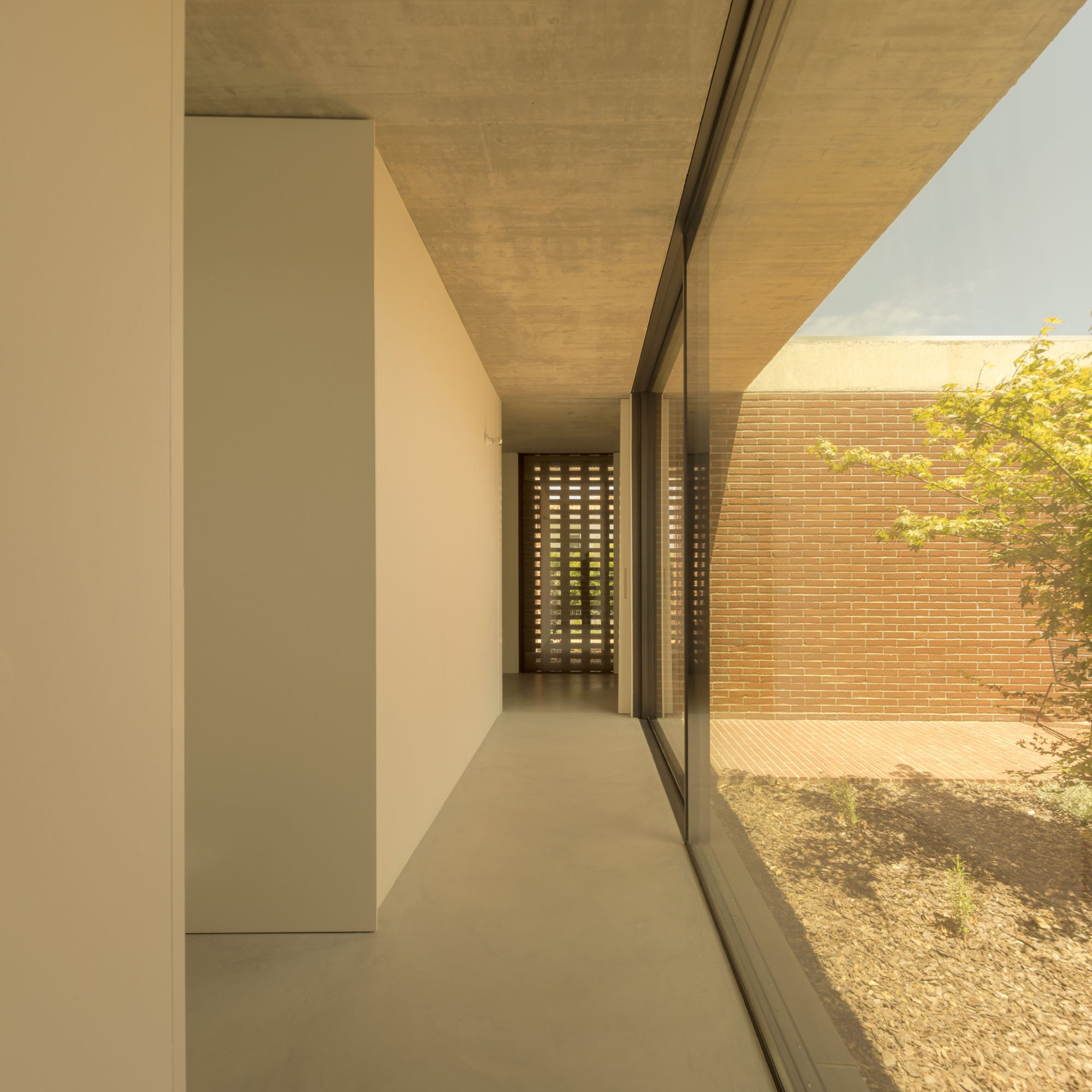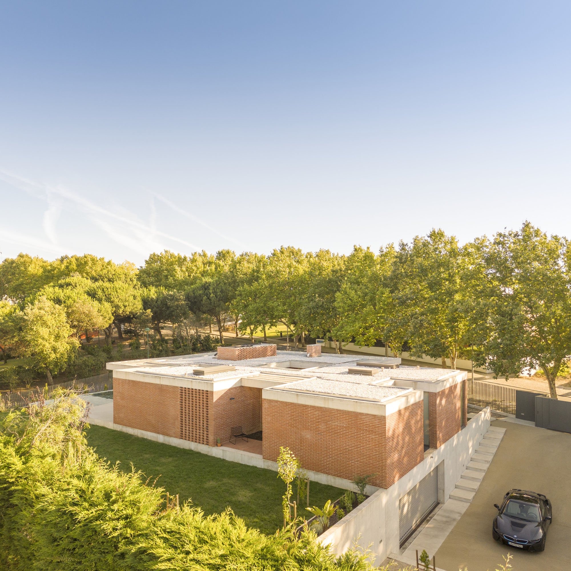 Inside, there is what we can cal "harmony" betwee the white vertical planes and the solid red brick planes. Spaces are hierarchically distributed, and the courtyards and voids highlight the evident landscaping work.