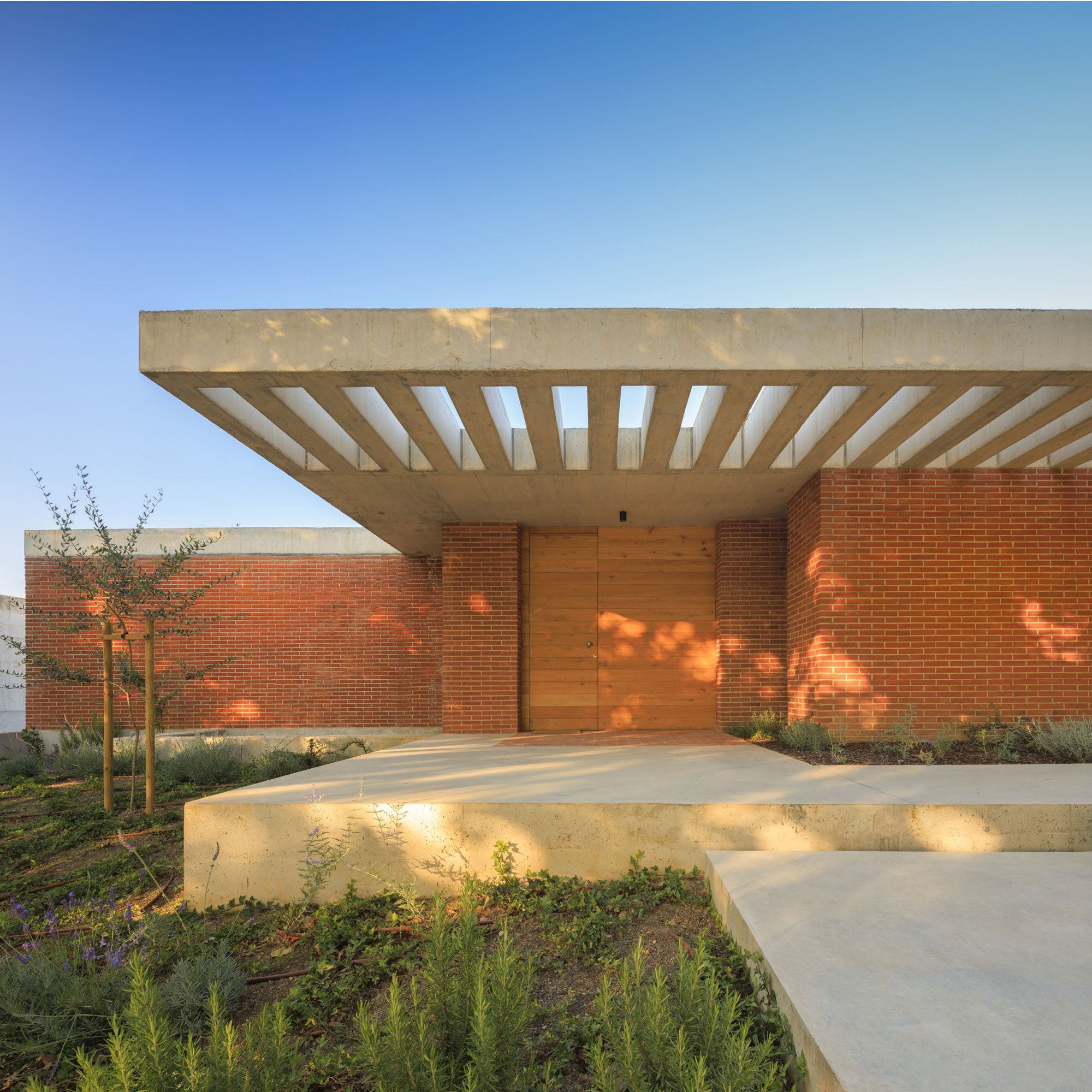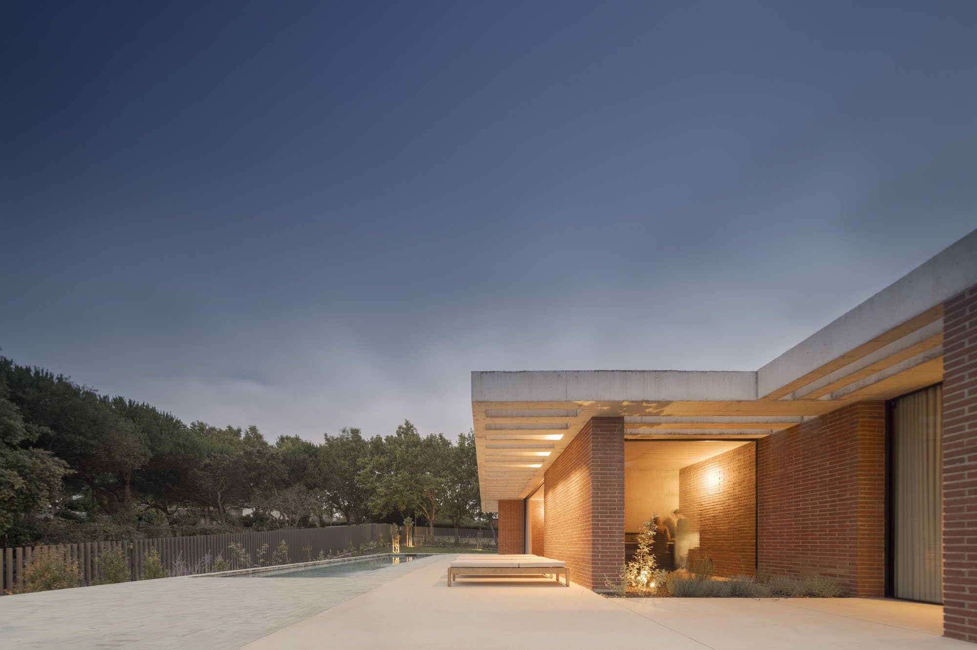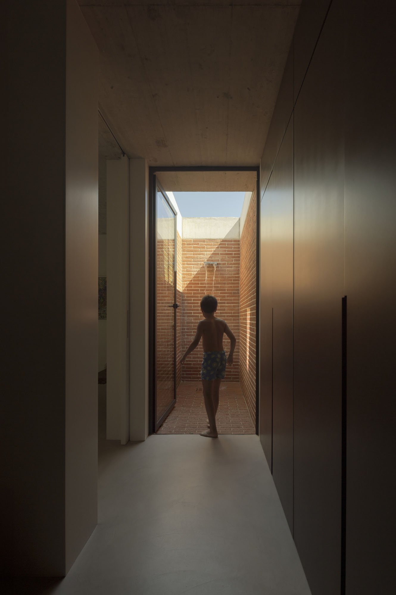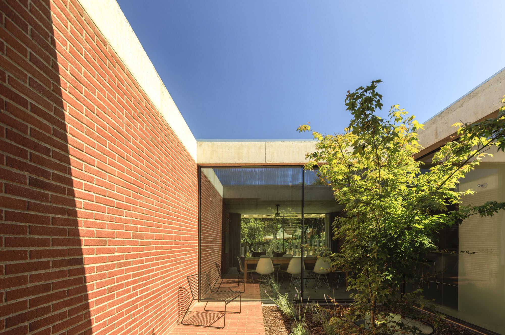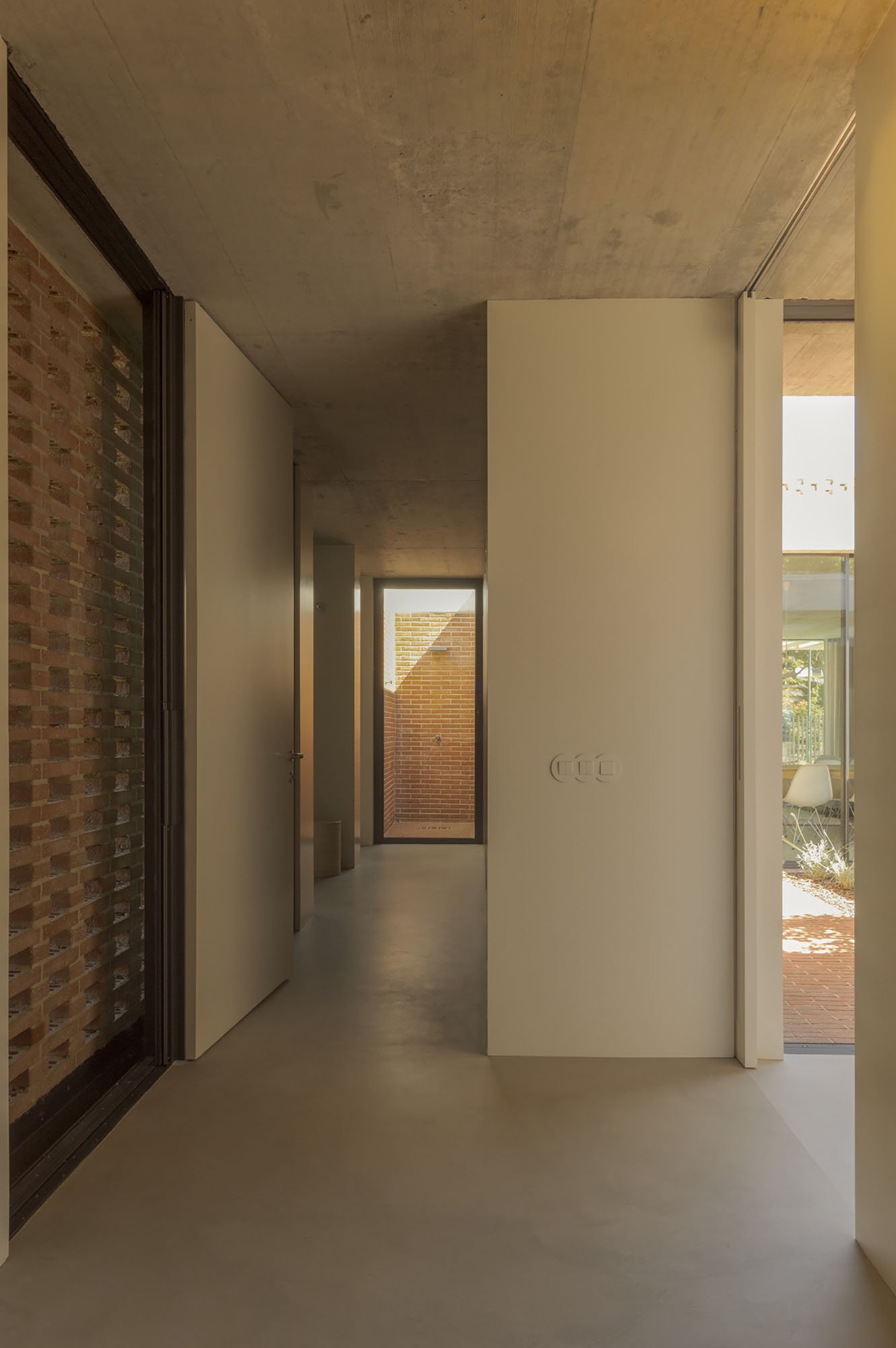 Inside, there is what we can cal "harmony" betwee the white vertical planes and the solid red brick planes. Spaces are hierarchically distributed, and the courtyards and voids highlight the evident landscaping work.