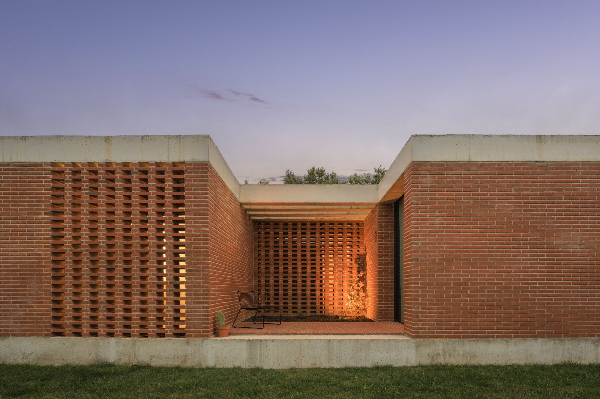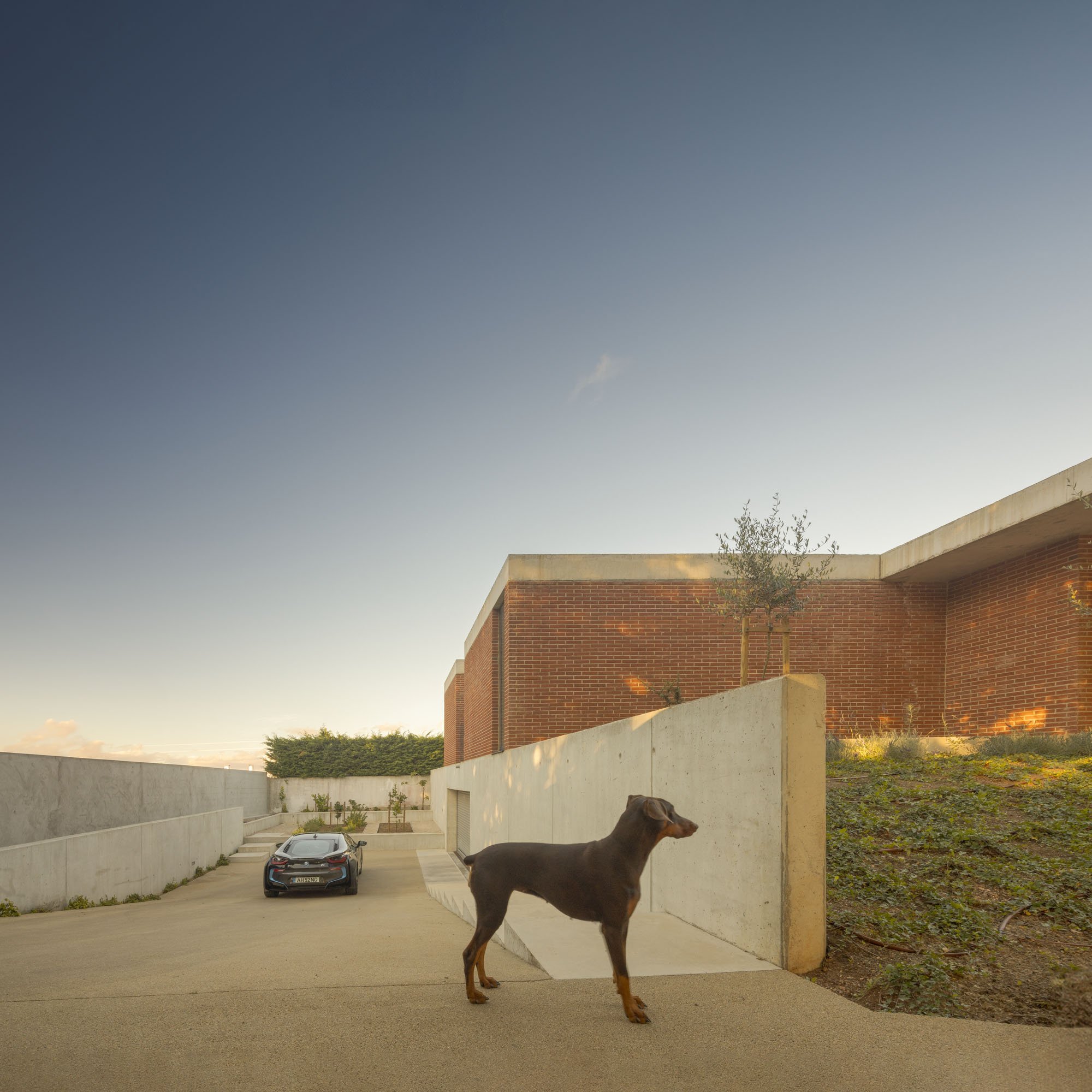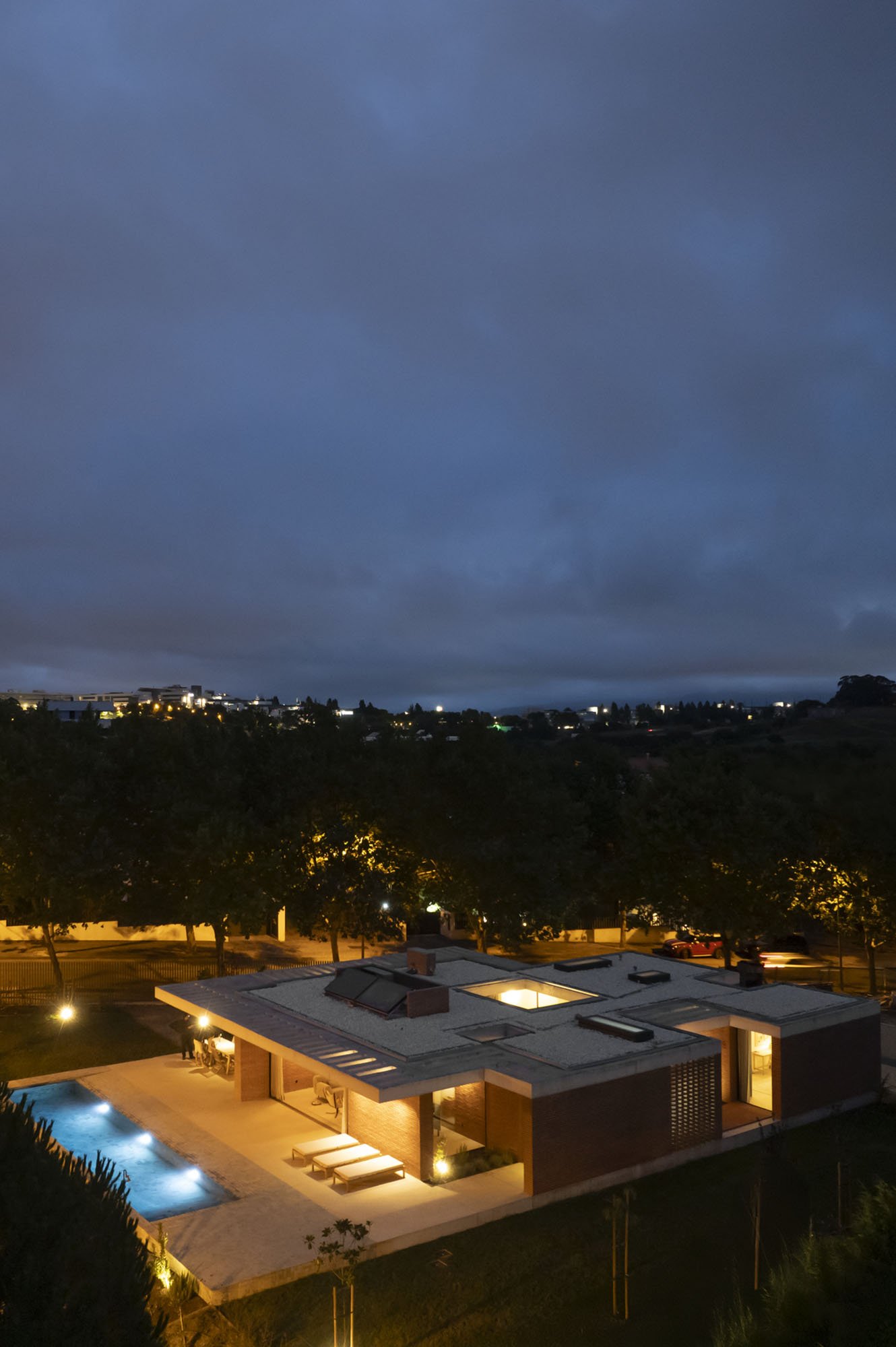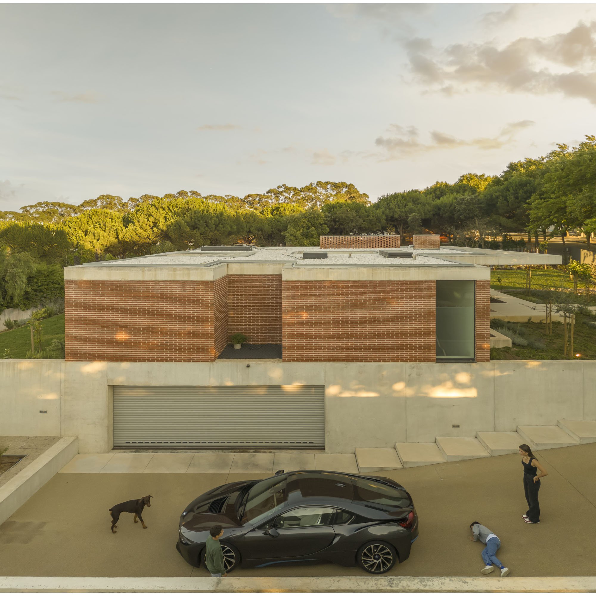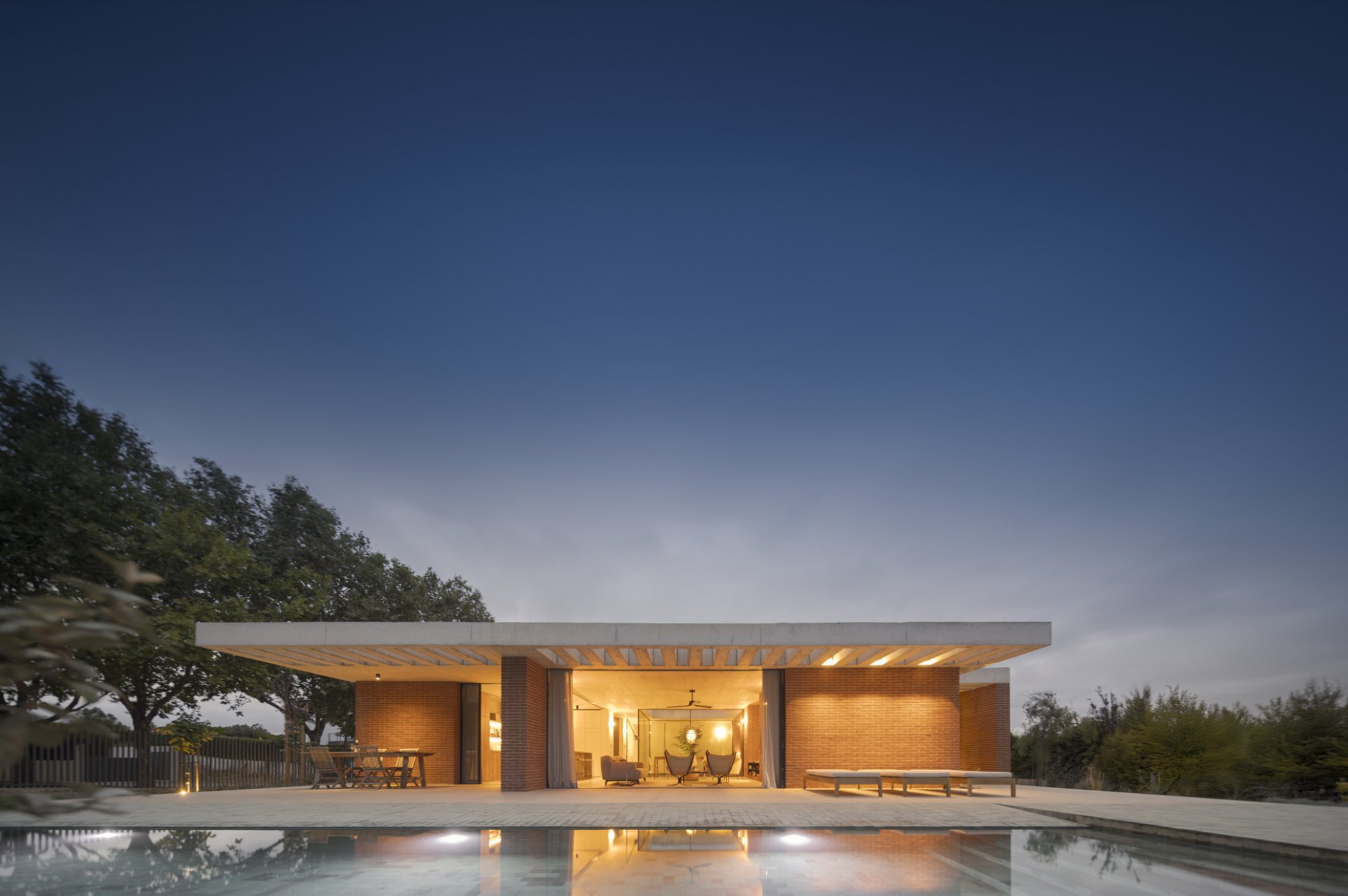 Inside, there is what we can cal "harmony" betwee the white vertical planes and the solid red brick planes. Spaces are hierarchically distributed, and the courtyards and voids highlight the evident landscaping work.