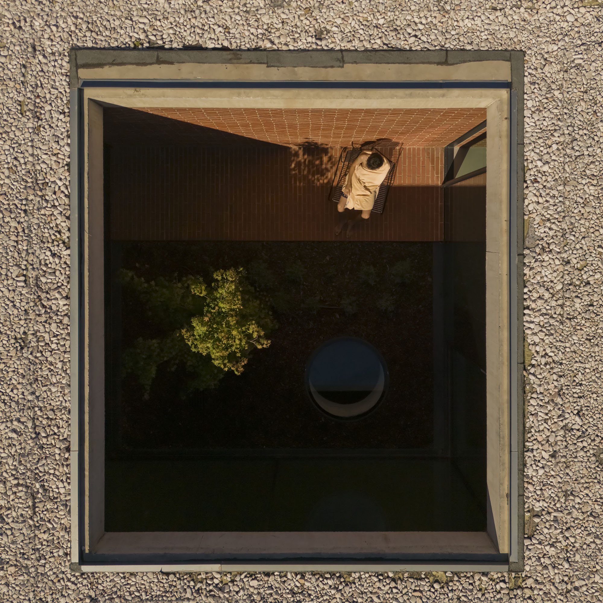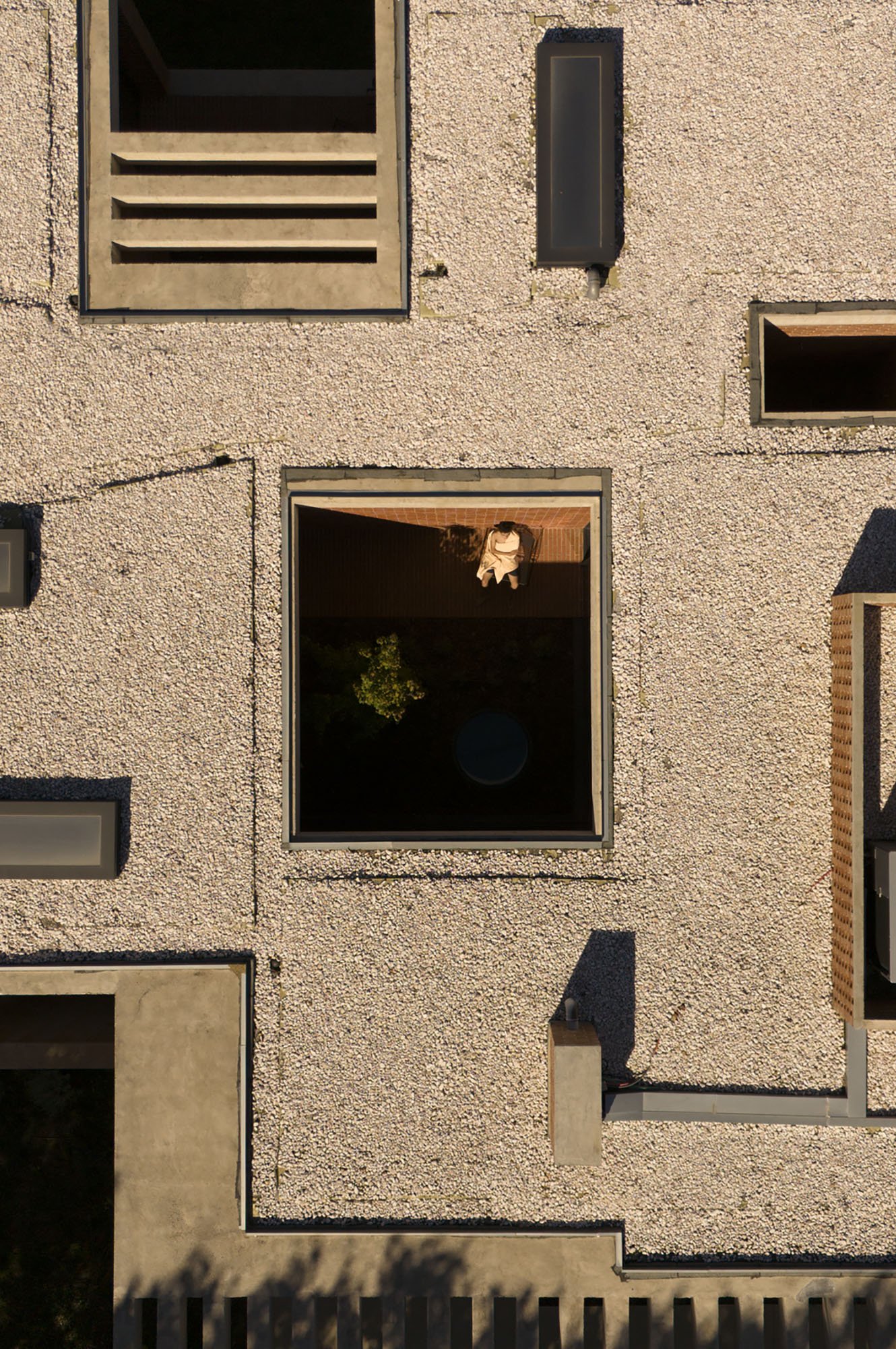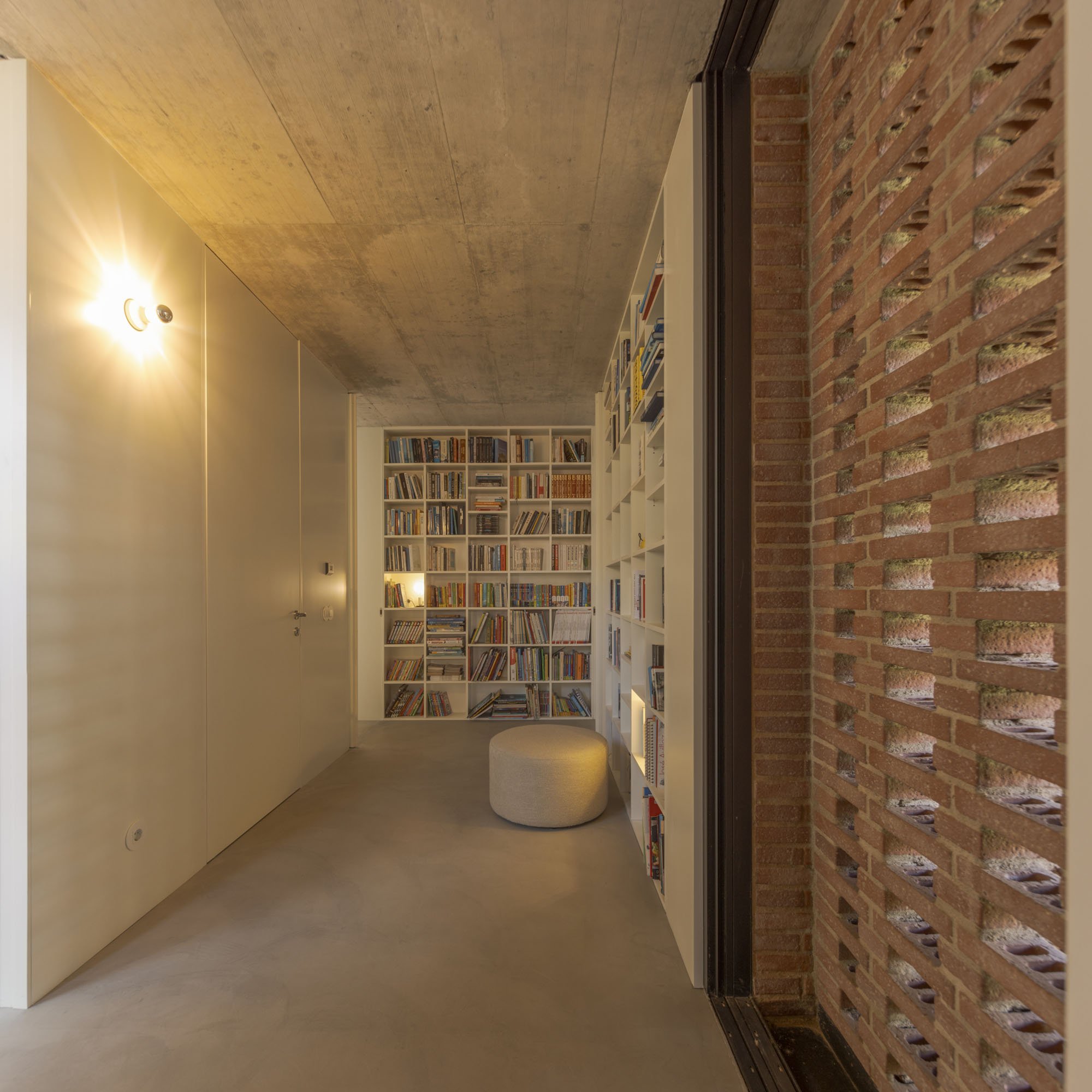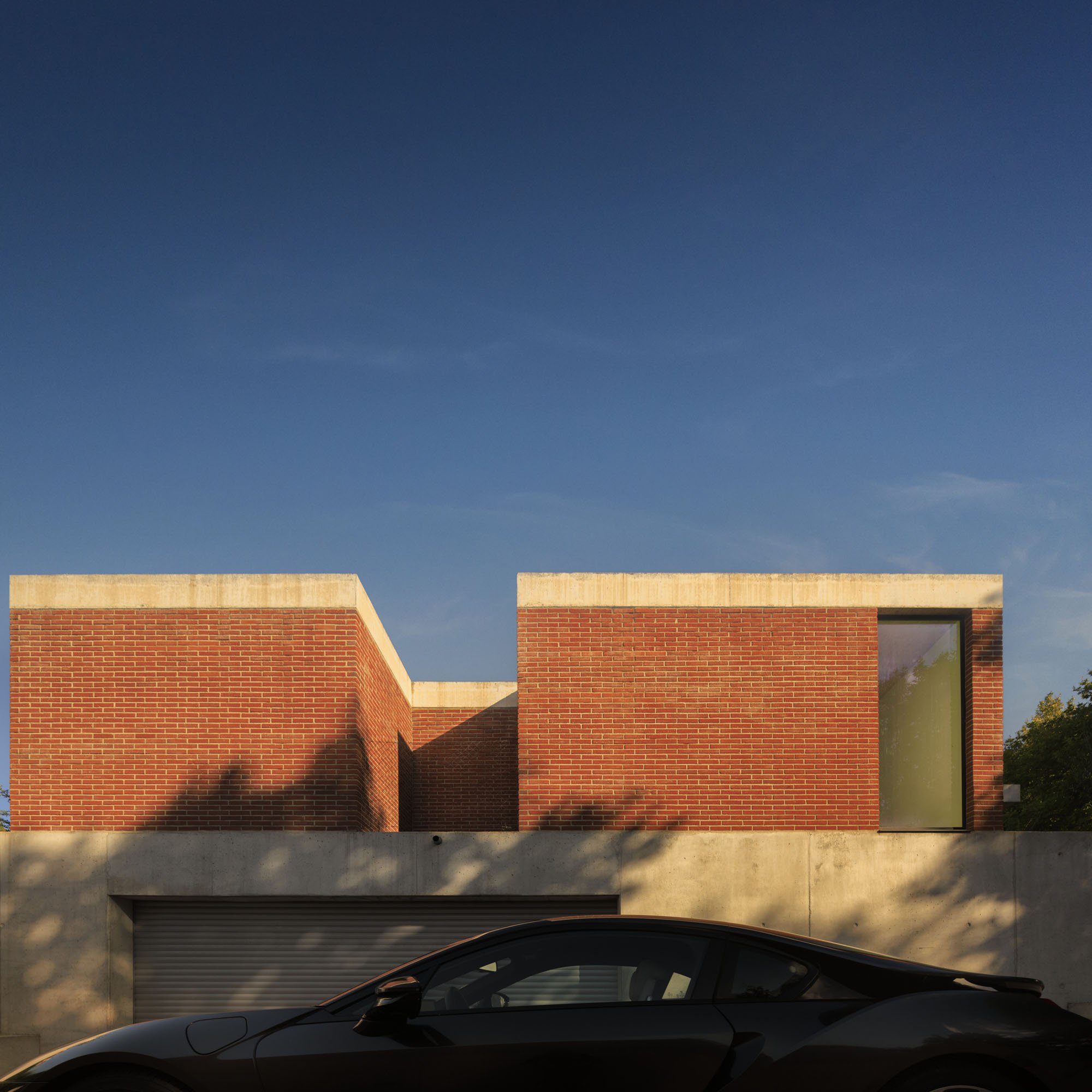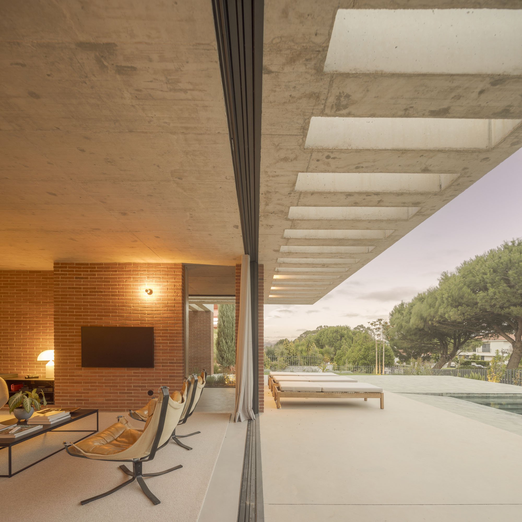 Inside, there is what we can cal "harmony" betwee the white vertical planes and the solid red brick planes. Spaces are hierarchically distributed, and the courtyards and voids highlight the evident landscaping work.