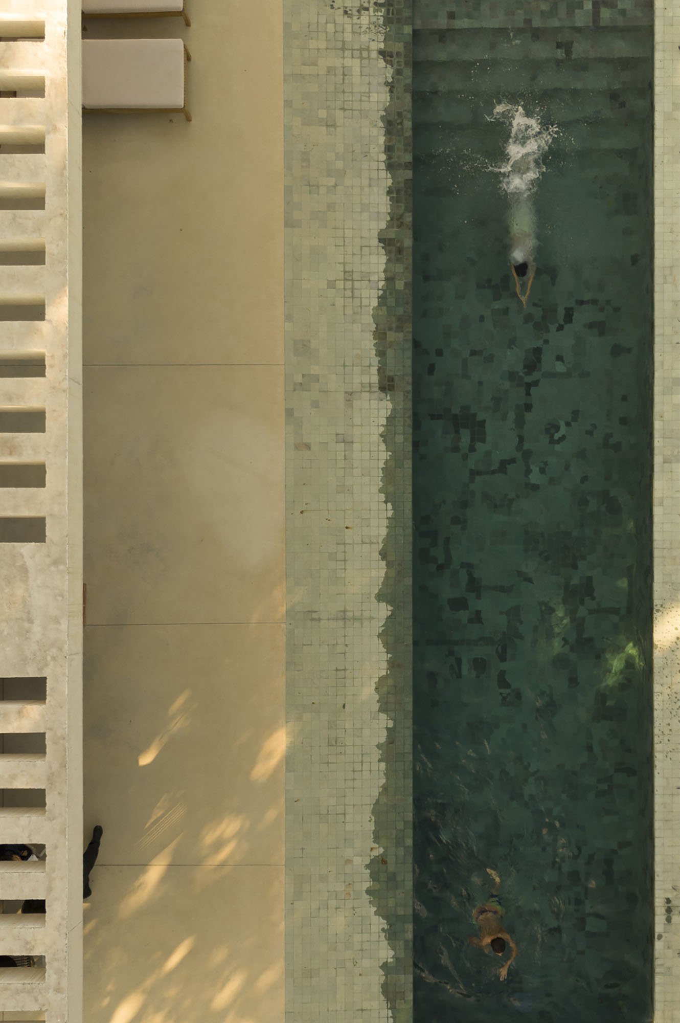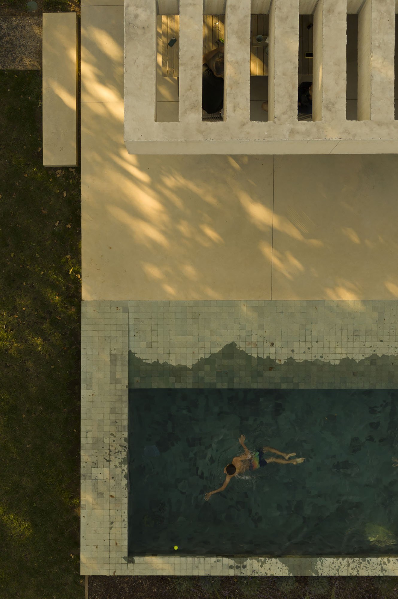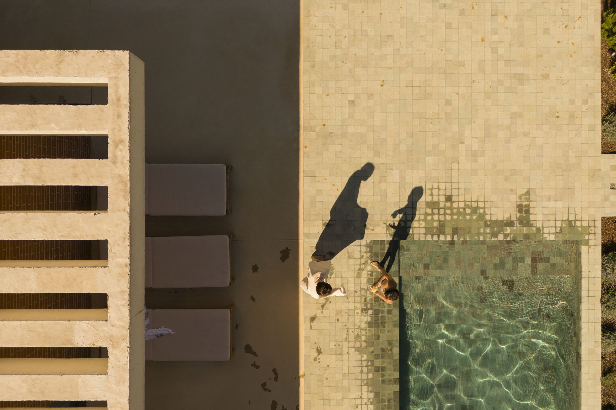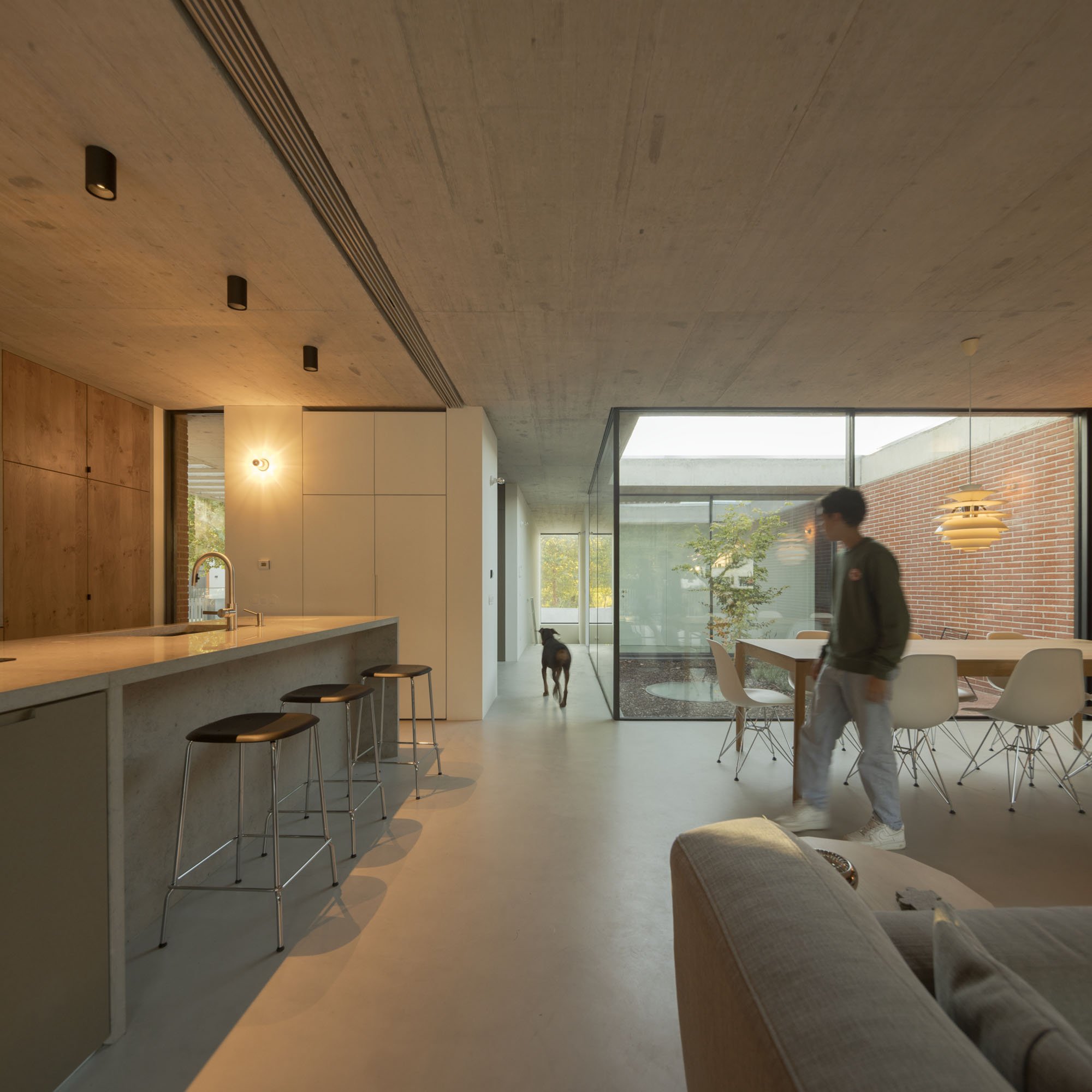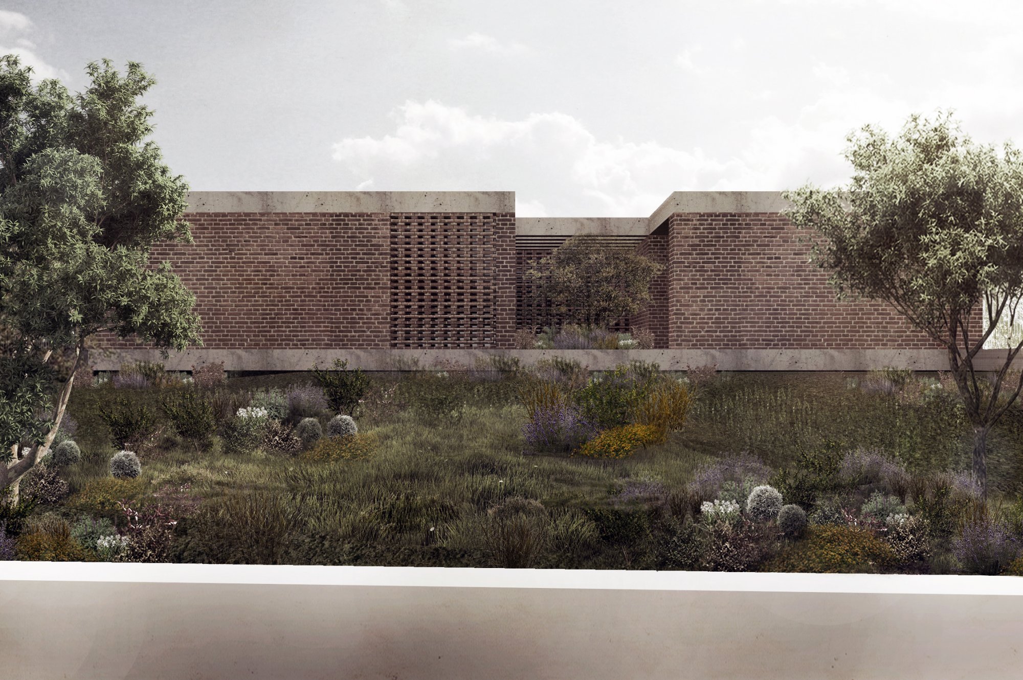 Inside, there is what we can cal "harmony" betwee the white vertical planes and the solid red brick planes. Spaces are hierarchically distributed, and the courtyards and voids highlight the evident landscaping work.